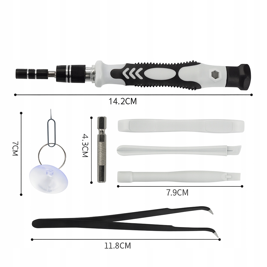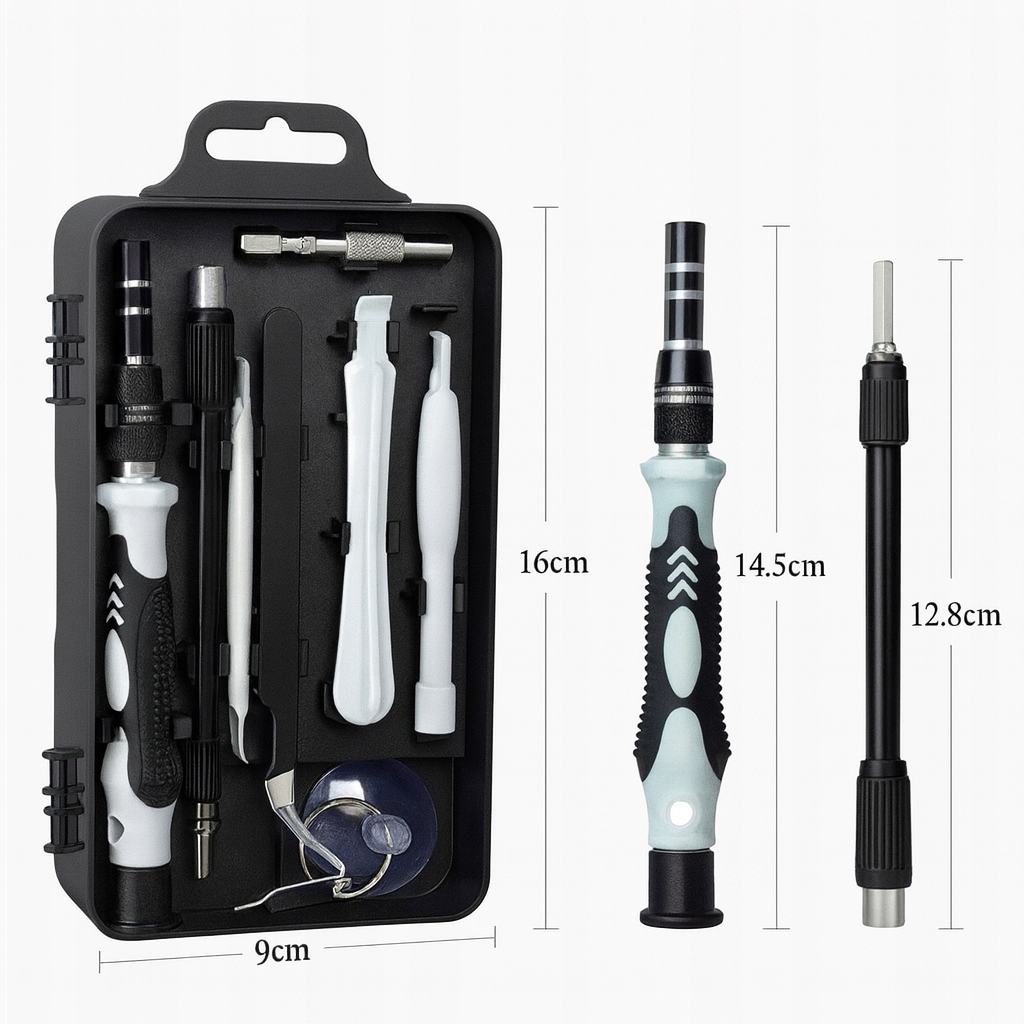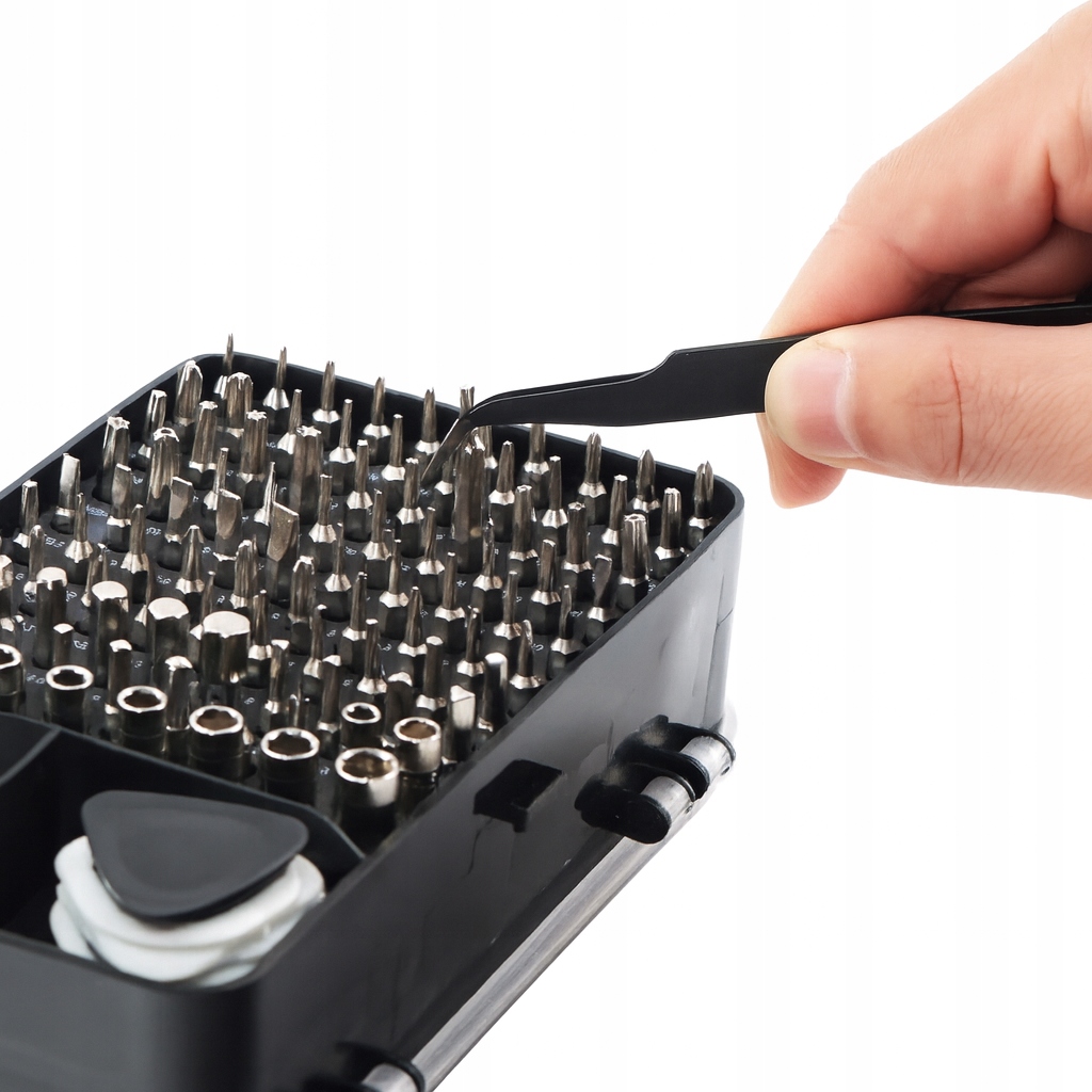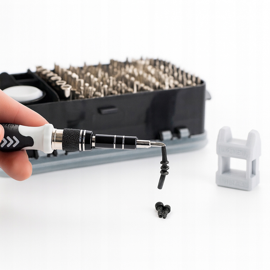 Funkcjonalny zestaw precyzyjnych wkrętaków zawierający aż 115 elementów. W skład kompletu wchodzi ergonomiczny wkrętak, aż 100 wymiennych nakrętek (bitów), przedłużka, pęseta, magnetyzer oraz szereg innych adapterów i otwieraczy, które z powodzeniem ułatwią pracę każdemu majsterkowiczowi. Całość została umieszczona w funkcjonalnym, kompaktowym etui. Doskonale sprawdzi się zarówno w warunkach amatorskich jak i profesjonalnych (warsztaty i serwisy).