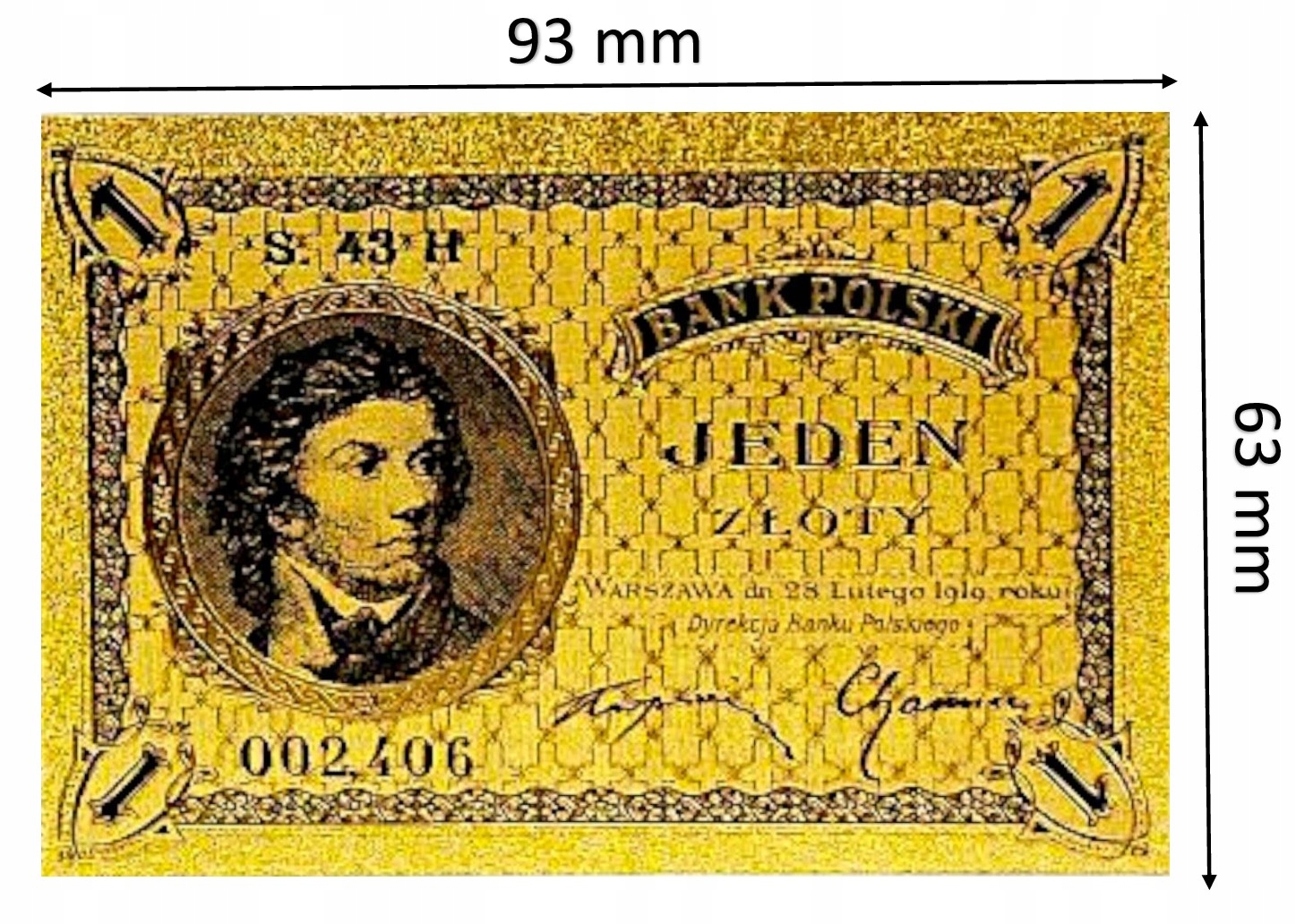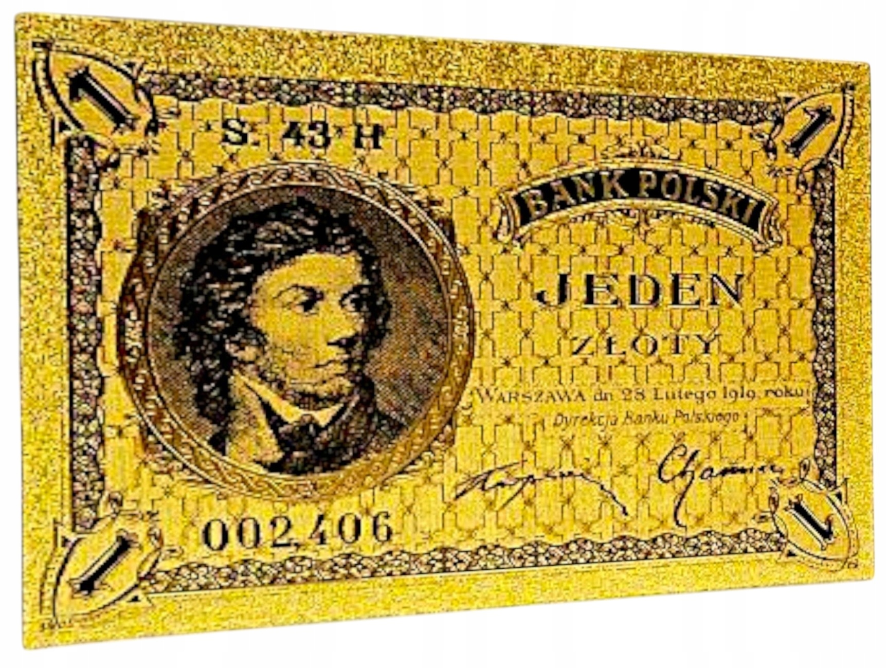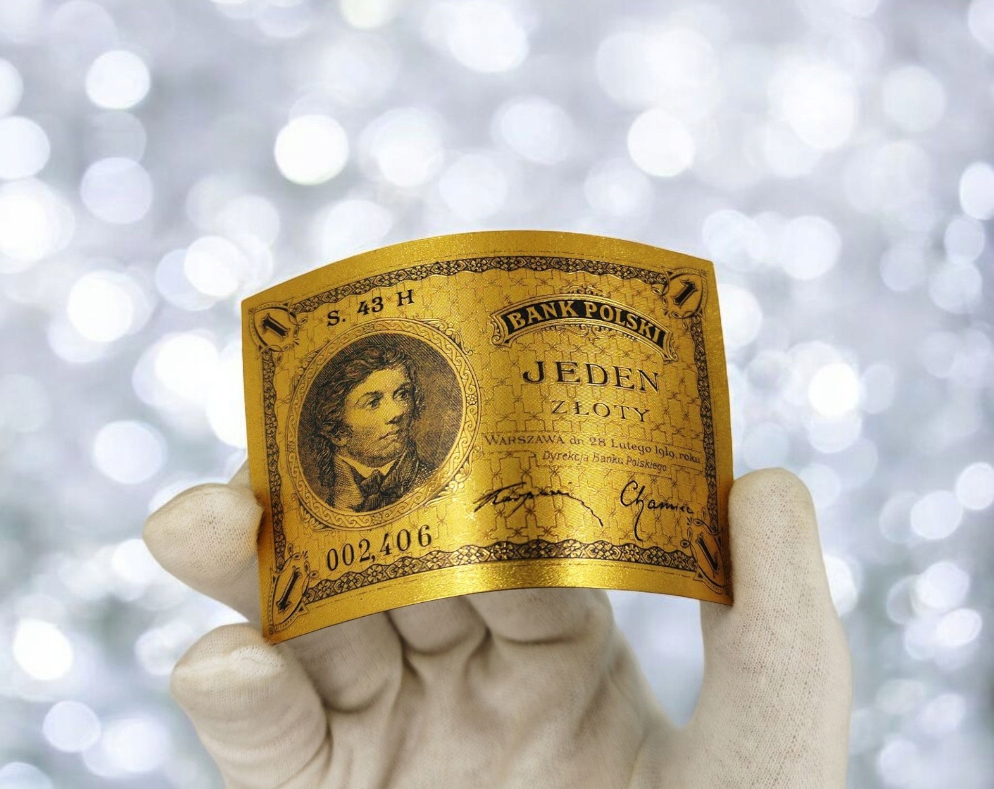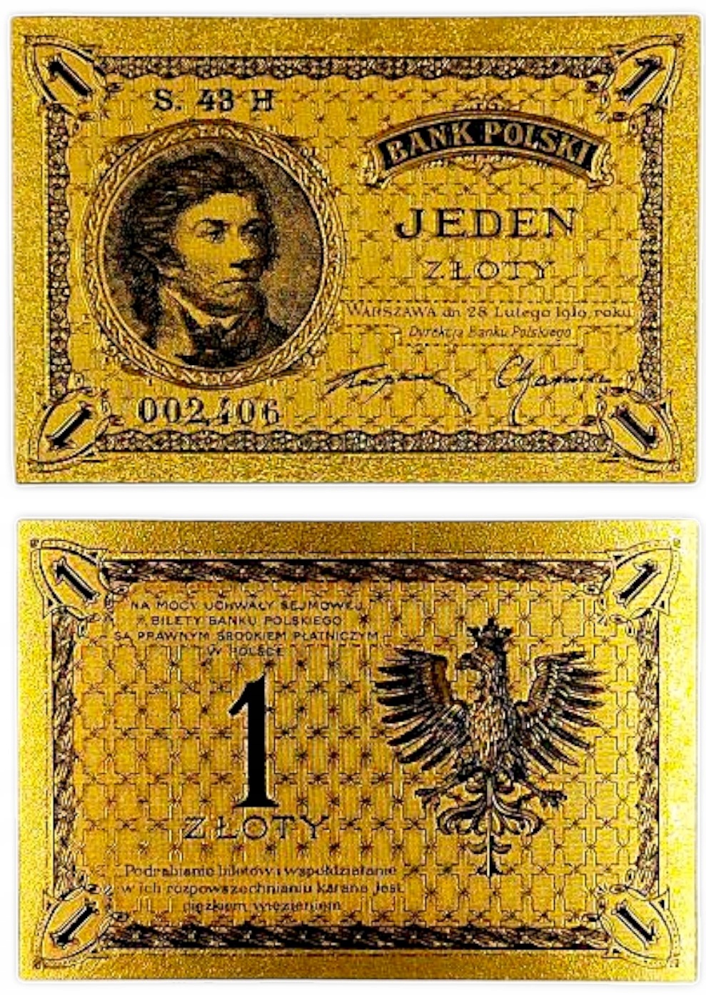 ⭐Prezentowany banknot to kolekcjonerska, pozłacana replika banknotu 1 złotego z 1919 roku – jednego z pierwszych środków płatniczych II Rzeczypospolitej.
