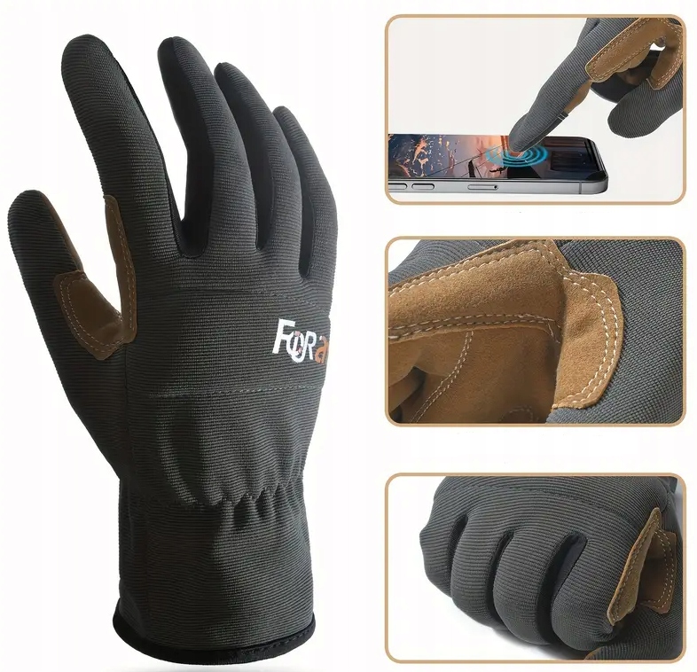 Wykonane z odpornego na ścieranie materiału zewnętrznego oraz antypoślizgowego materiału wewnętrznego w kolorze brązowym po stronie chwytnej.