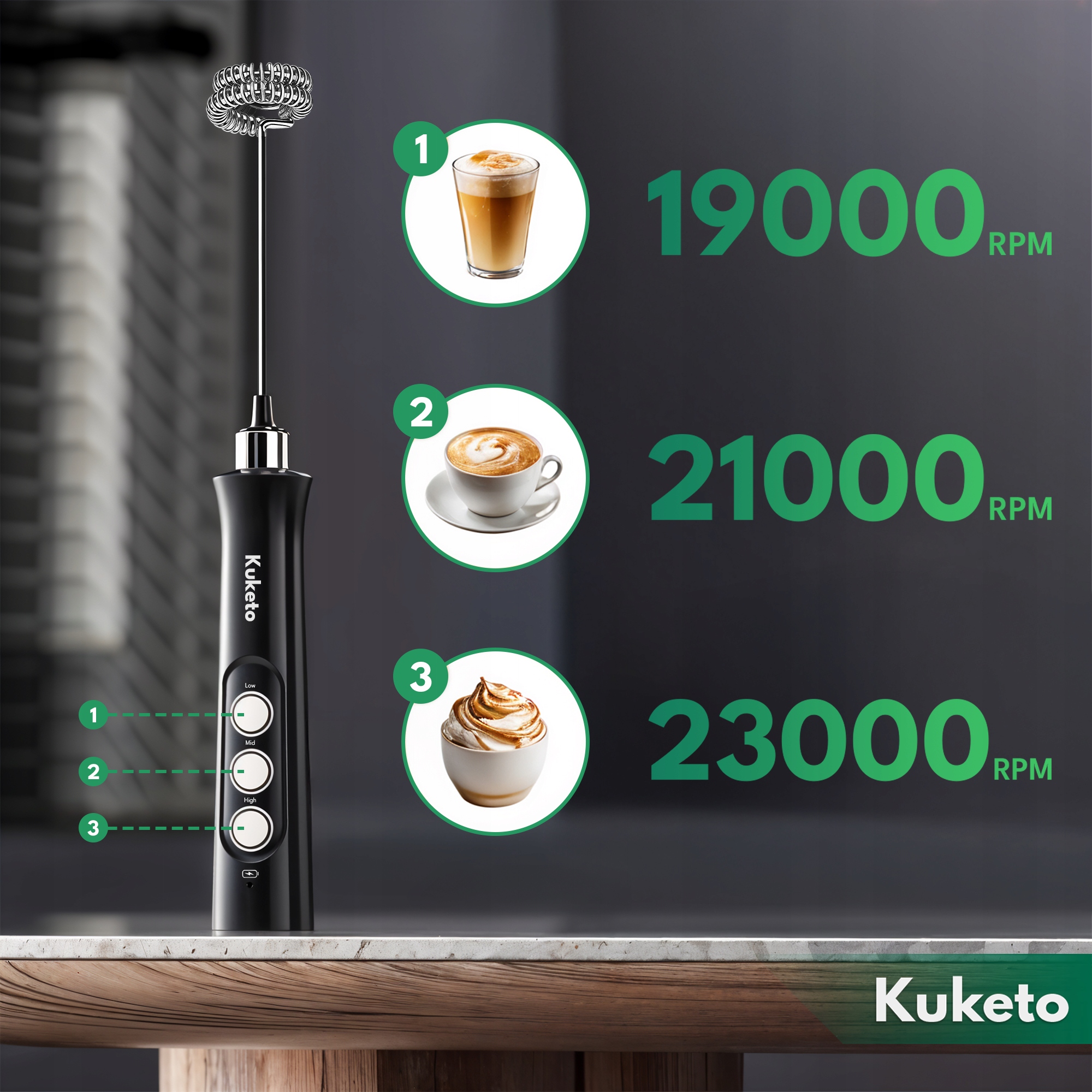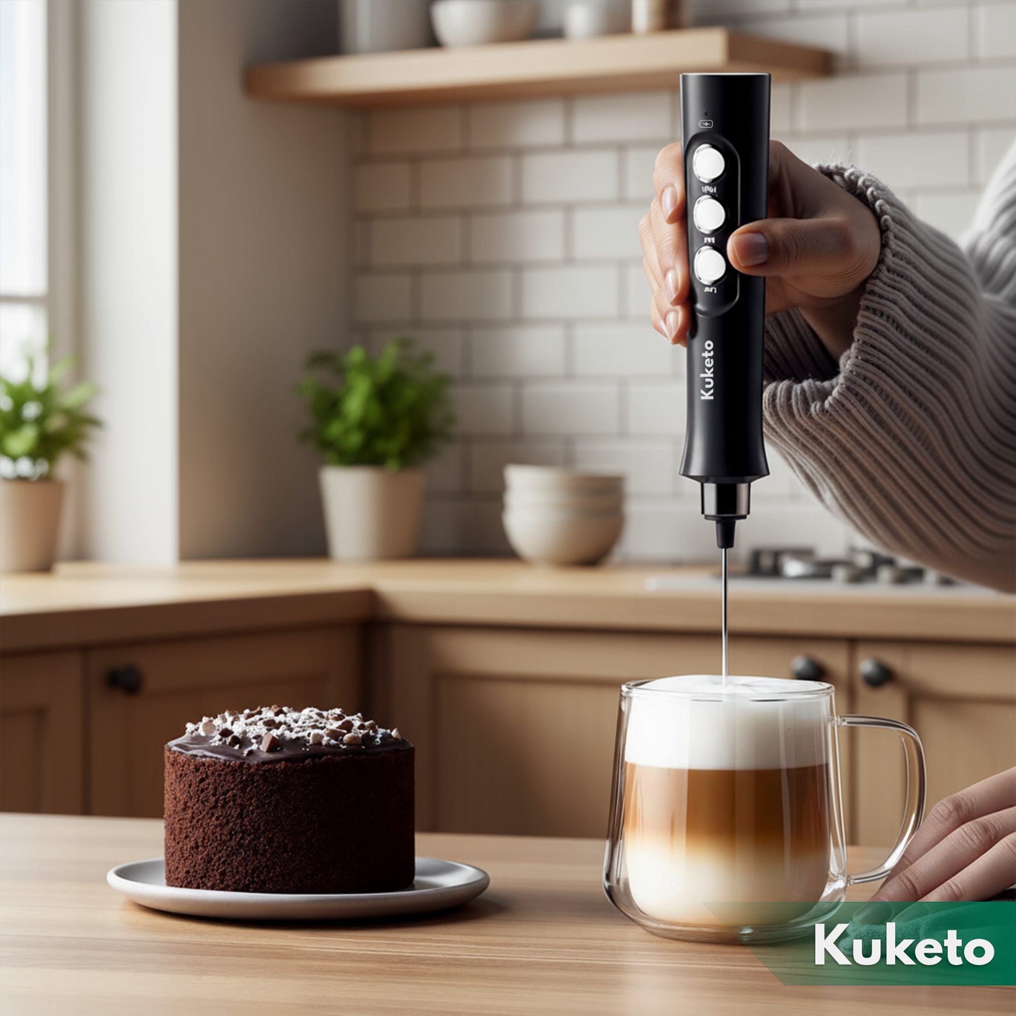 ☑️ Elektryczny spieniacz do mleka Kuketo Frothello to wielofunkcyjne urządzenie, które pozwala przygotować idealną piankę do kawy, mieszać składniki oraz wyrabiać lekkie masy w kilka sekund. Posiada 3 różne końcówki, dzięki czemu zastępuje kilka akcesoriów kuchennych naraz i sprawdza się zarówno w kawie, jak i w kuchni. Mocna bateria 1800 mAh oraz 3 prędkości pracy zapewniają dużą wydajność i wygodę użytkowania każdego dnia.