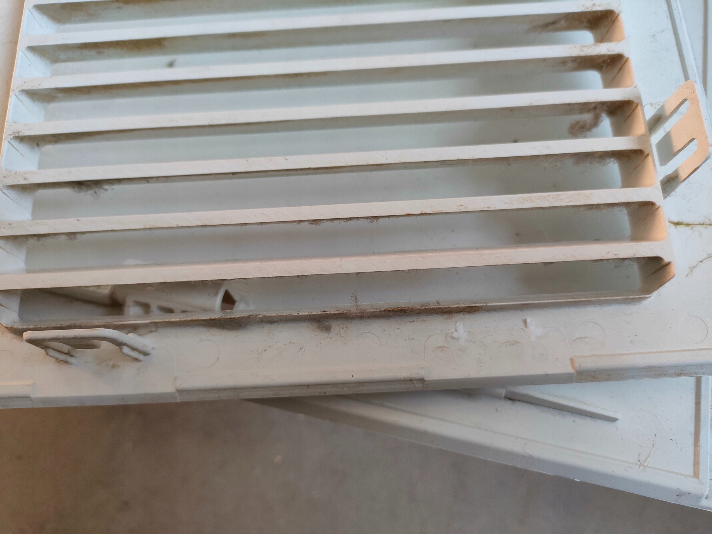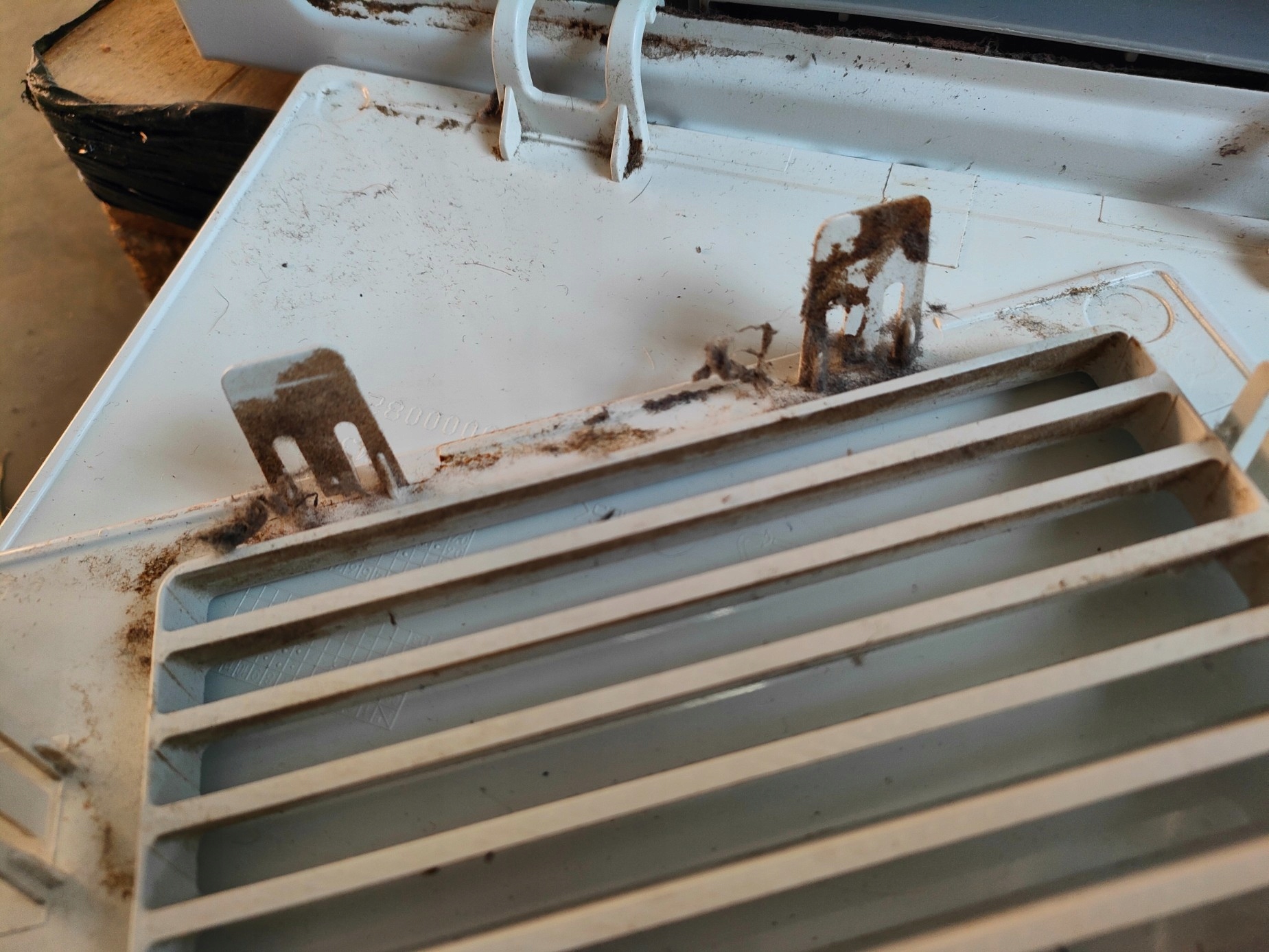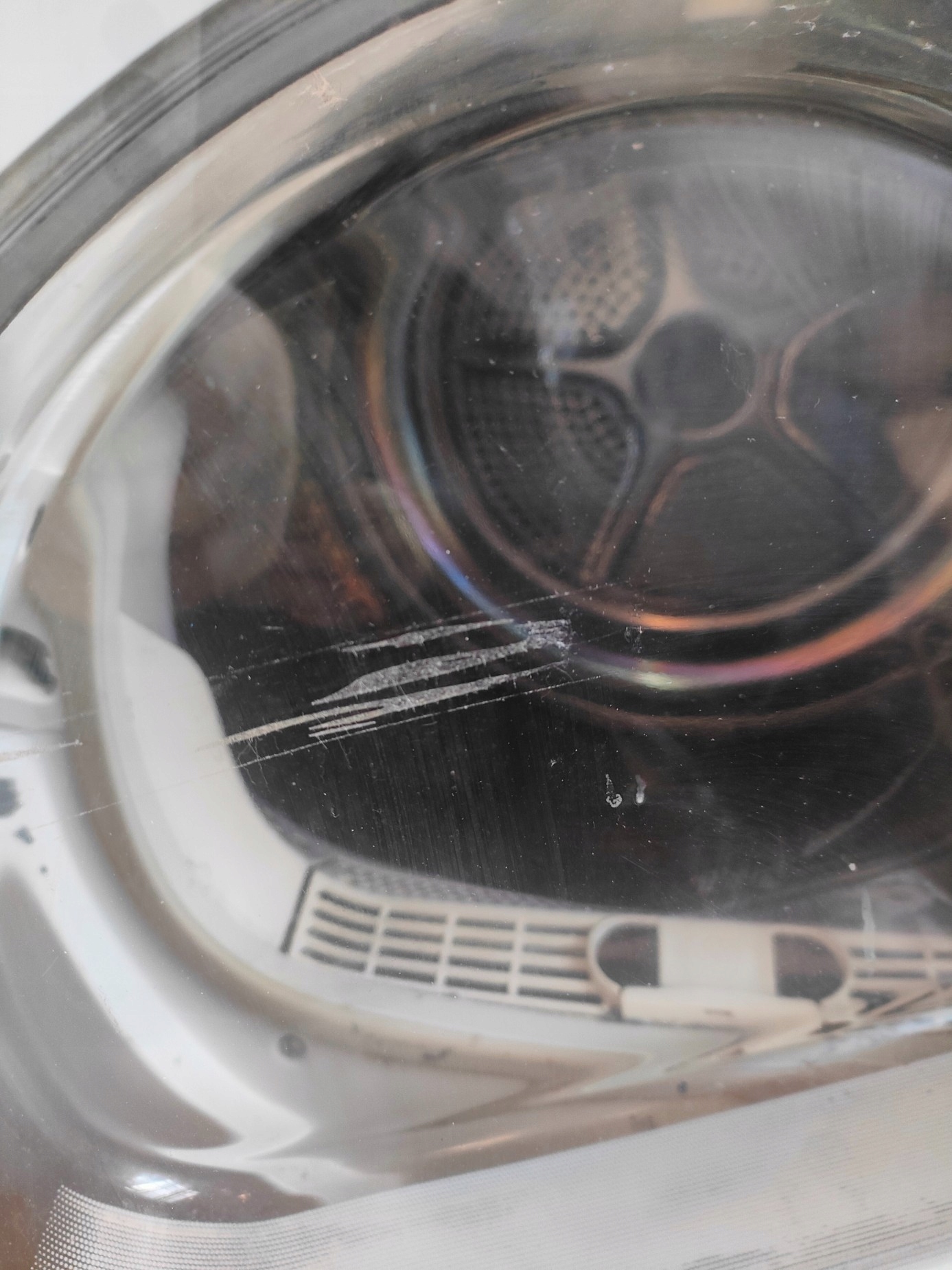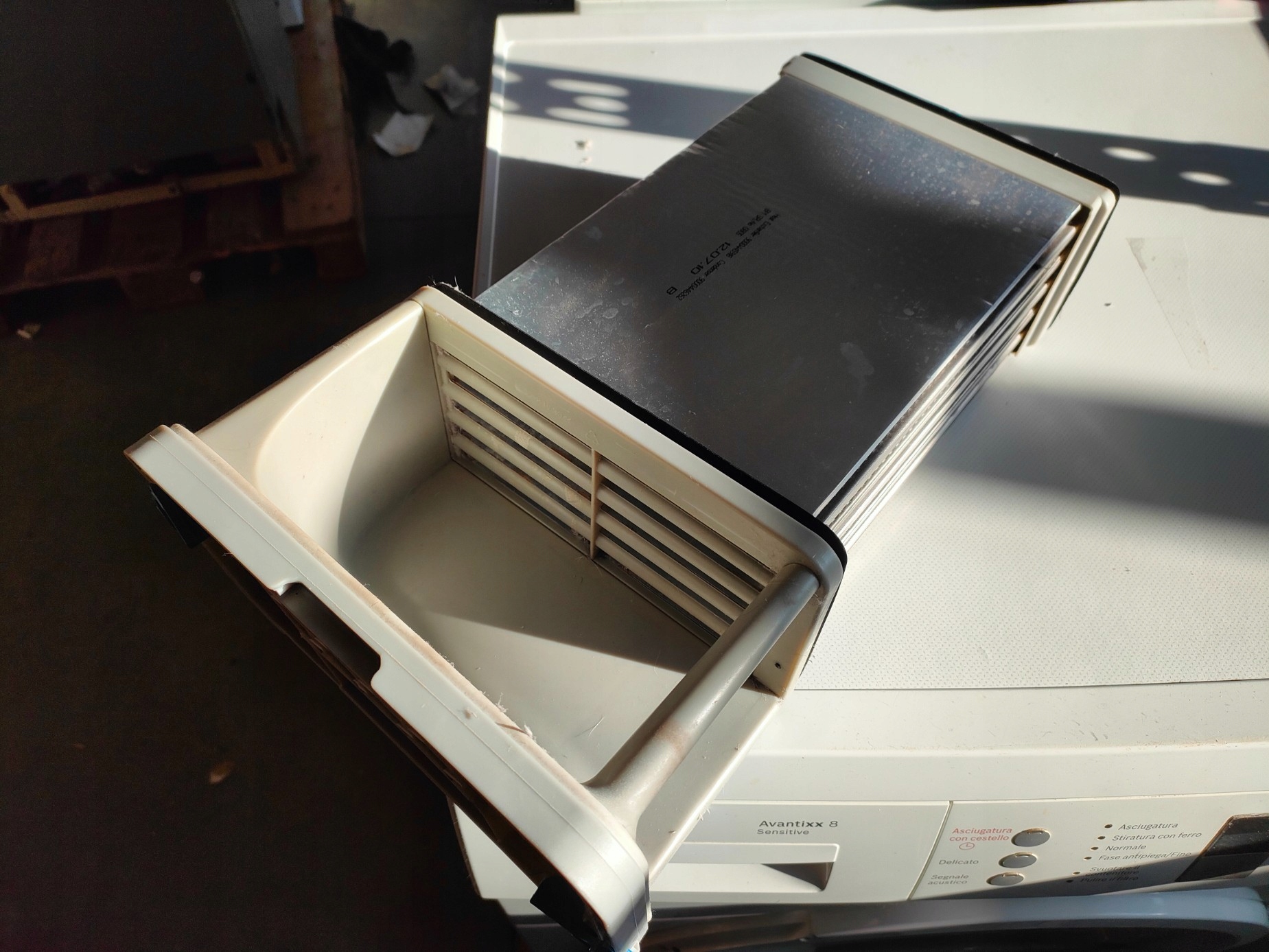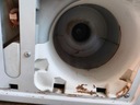 Suszarka uruchamia się po podłączeniu do zasilania (wnętrze bębna nagrzało się), wewnątrz urządzenia jest spora ilość pozostałości po kłaczkach, nie ma filtra, panel jest w języku włoskim, nie ma instrukcji, kratka zasłaniająca filtr ma jeden wyłamany zatrzask, zbiornik na kłaczki jest rozdarty od spodu, miejscami posiada widoczne zarysowania/ obicia/ delikatne wgniecenia