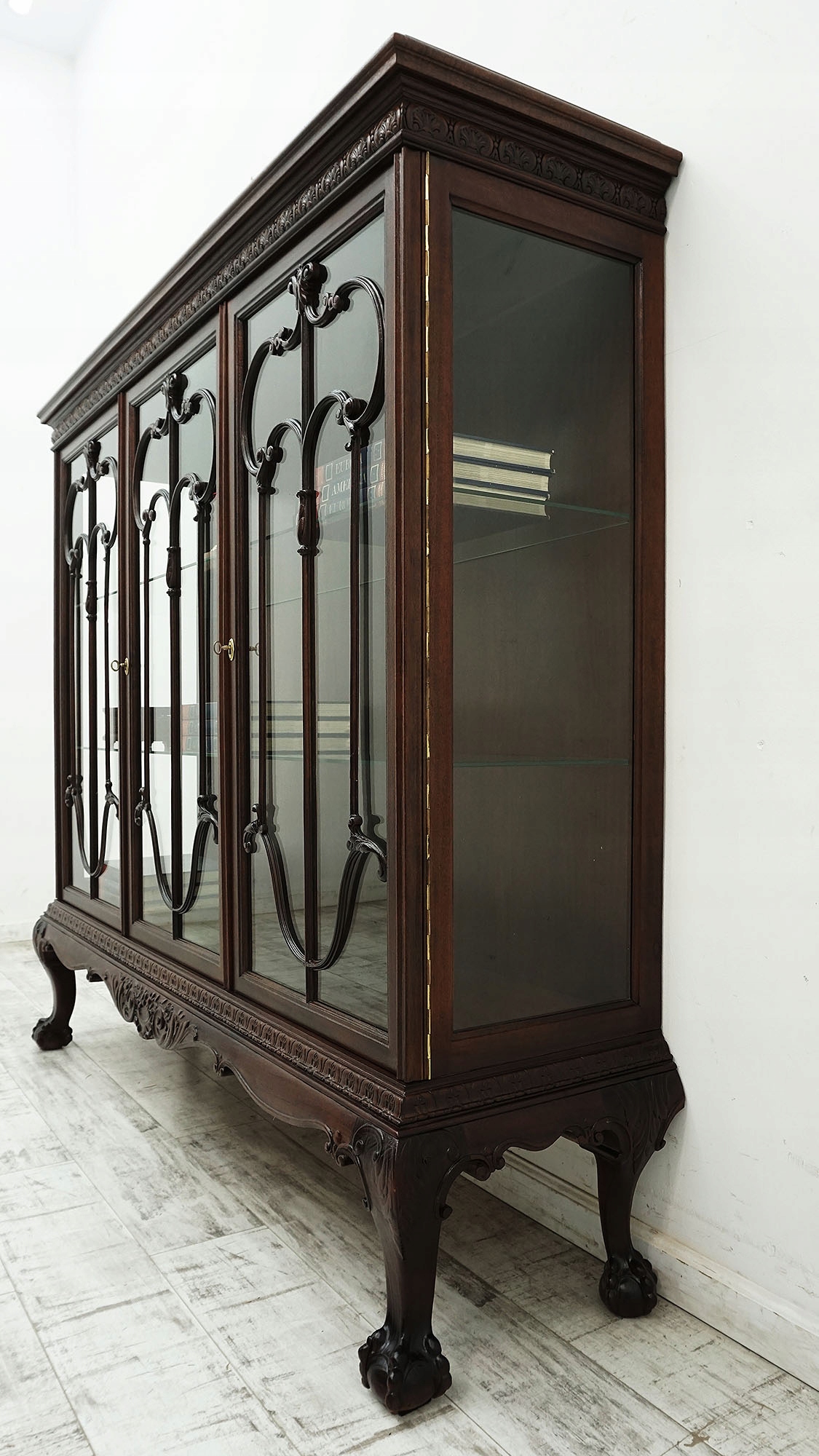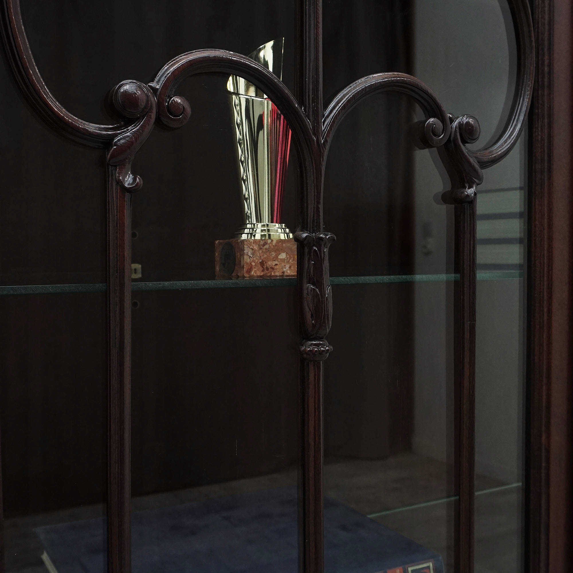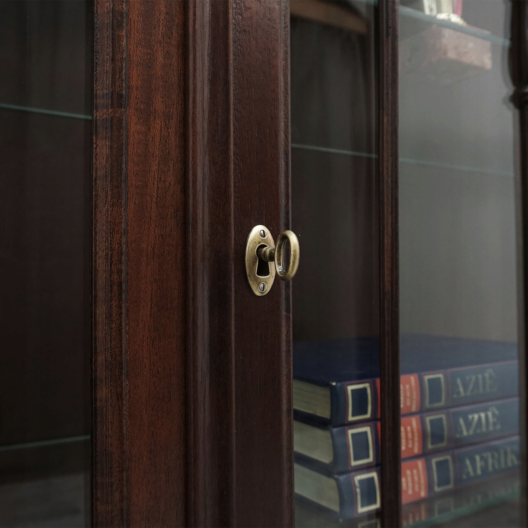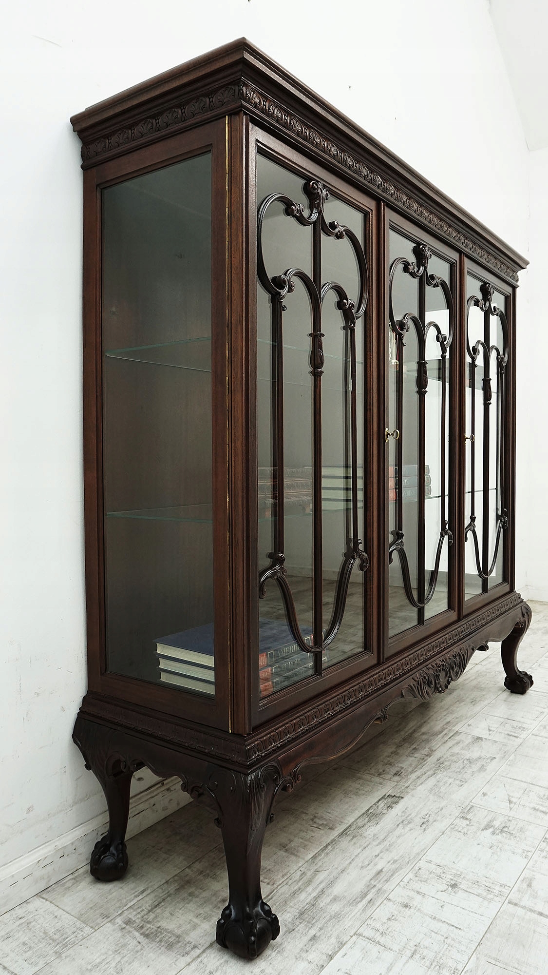 Ta niezwykle efektowna witryna w stylu neobarokowym to połączenie kunsztownego wzornictwa oraz funkcjonalności, które natychmiast nadają wnętrzu prestiżowy charakter. Wykonana z ciemnego, szlachetnego drewna, zachwyca bogatą ornamentyką – od misternie rzeźbionego gzymsu po dekoracyjne nóżki typu cabriole, tworzące harmonijną całość w duchu historycznego piękna.