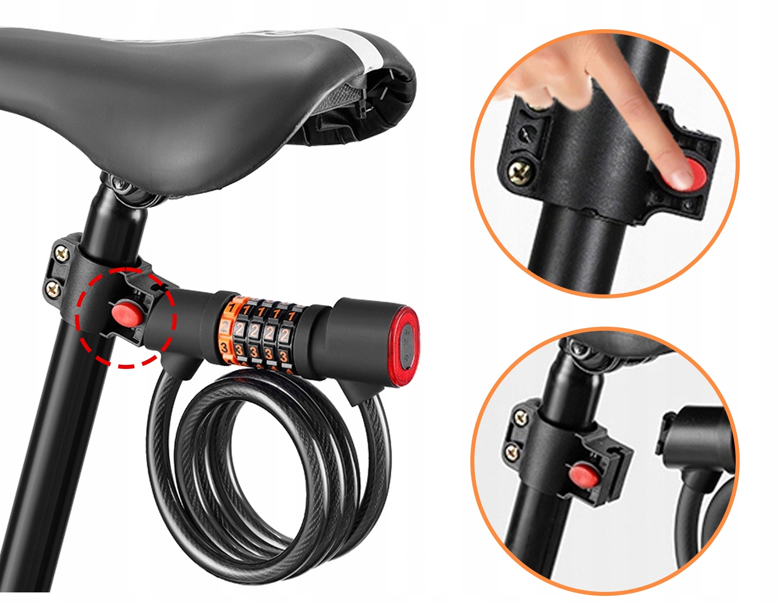 Zapięcie do roweru z szyfrem jest wykonane z plecionego stalowego drutu, co doskonale zabezpiecza każdy rower przez kradzieżą i utrudnia przecięcie. Kłódka posiada pięciocyfrowy szyfr, ustawiony z kodem początkowym na "00000". Blokada jest zakładana na specjalnym uchwycie z szybkim systemem mocowania na klik.