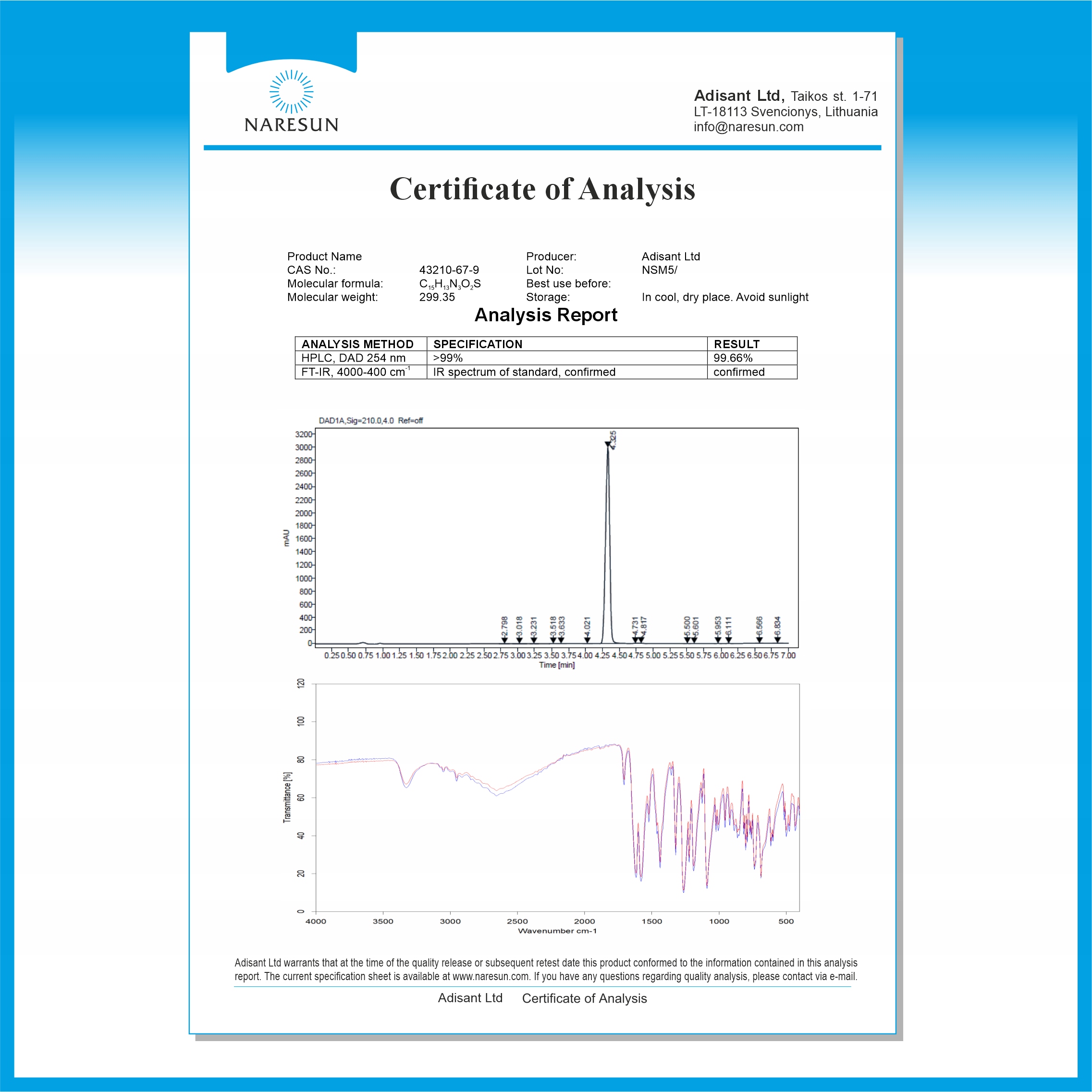 Czysty produkt zawierający fenbendazol, wyprodukowany w europejskim laboratorium, z certyfikatem jakości. Fenbendazol NARESUN charakteryzuje się czystością większą niż 99%. Każda partia fenbendazolu posiada indywidualny certyfikat jakości. Produkt NARESUN nie zawiera wypełniaczy, które zwiększają objętość proszku, ani w samym proszku, ani w sprzedawanych kapsułkach.