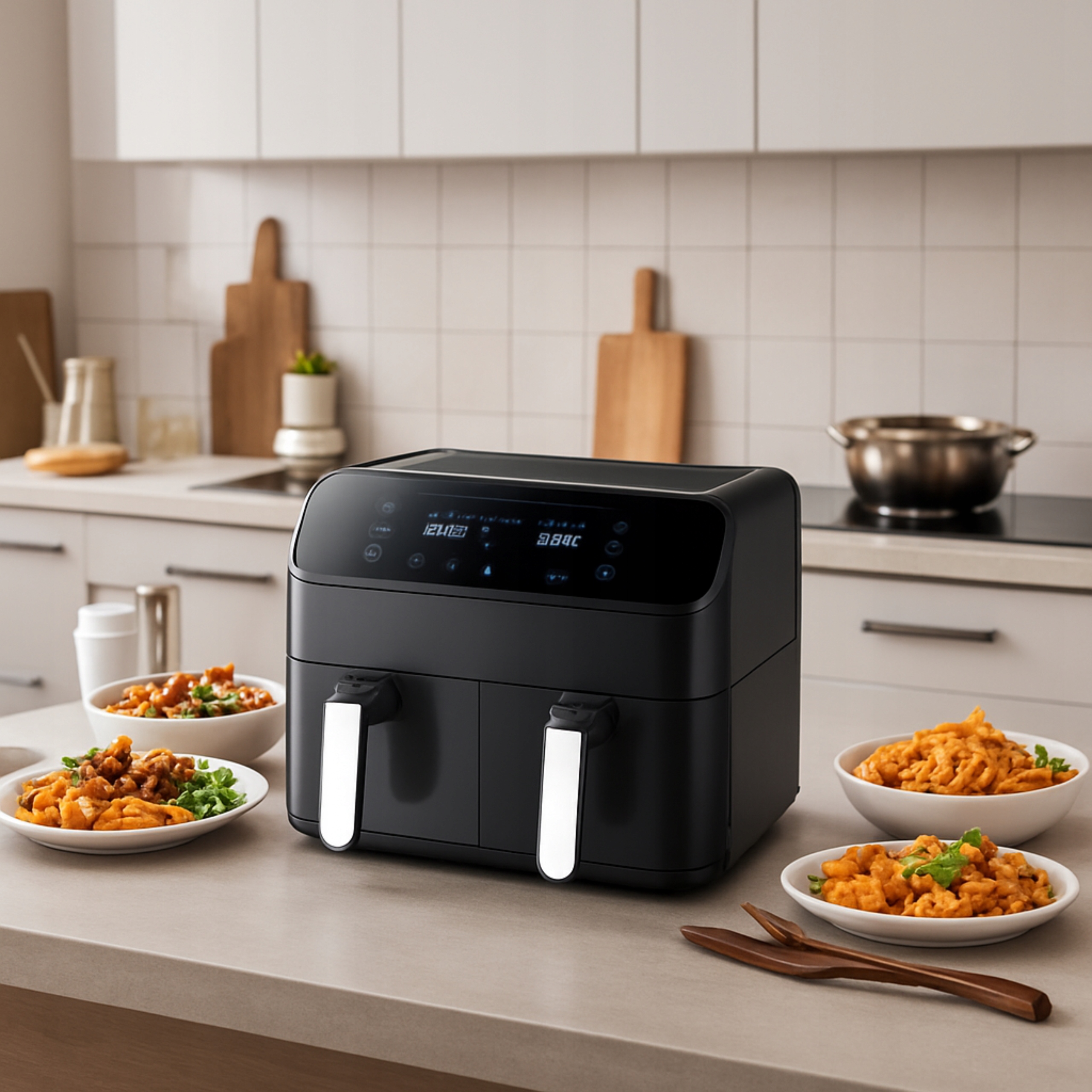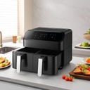⭕ Dwa niezależne kosze o łącznej pojemności 8L pozwalają na jednoczesne gotowanie dwóch różnych dań – mięsa w jednym koszyku, warzyw w drugim – oszczędzając czas i energię.