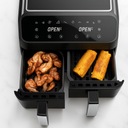 ⚖️ Całkowita pojemność 8L podzielona na dwa niezależne kosze po 4L pozwala na jednoczesne przygotowanie dwóch zupełnie różnych potraw bez mieszania smaków i aromatów.