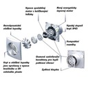 Obudowa i wirnik wykonane z wysokiej jakości i wytrzymałego tworzywa sztucznego odpornego na promieniowanie UV. Specjalnie zaprojektowany profil aerodynamiczny zapewnia wysoką wydajność powietrza i niski poziom hałasu. Kompaktowa budowa pozwala na montaż na ścianach i sufitach. Niewielki rozmiar króćca(czopa) do montażu w szybie wentylacyjnym lub podłączenia do okrągłego przewodu wentylacyjnego. Wentylator jest wyposażony w specjalnie zaprojektowany zawór powrotny, aby zapobiec wstecznemu ciągowi i utracie ciepła z pomieszczenia w czasie czuwania wentylatora. Czop (króciec) wentylatora posiada specjalnie zaprojektowane "kierownice" powietrza, aby zmniejszyć zawirowania powietrza, zwiększyć ciśnienie powietrza i obniżenie poziomu hałasu. Wysoki stopień ochrony IP 45 zapewnia idealne rozwiązanie dla wentylacji łazienki. Elementy elektroniczne są zabezpieczone szczelnymi pokrywami z gumowymi uszczelkami.