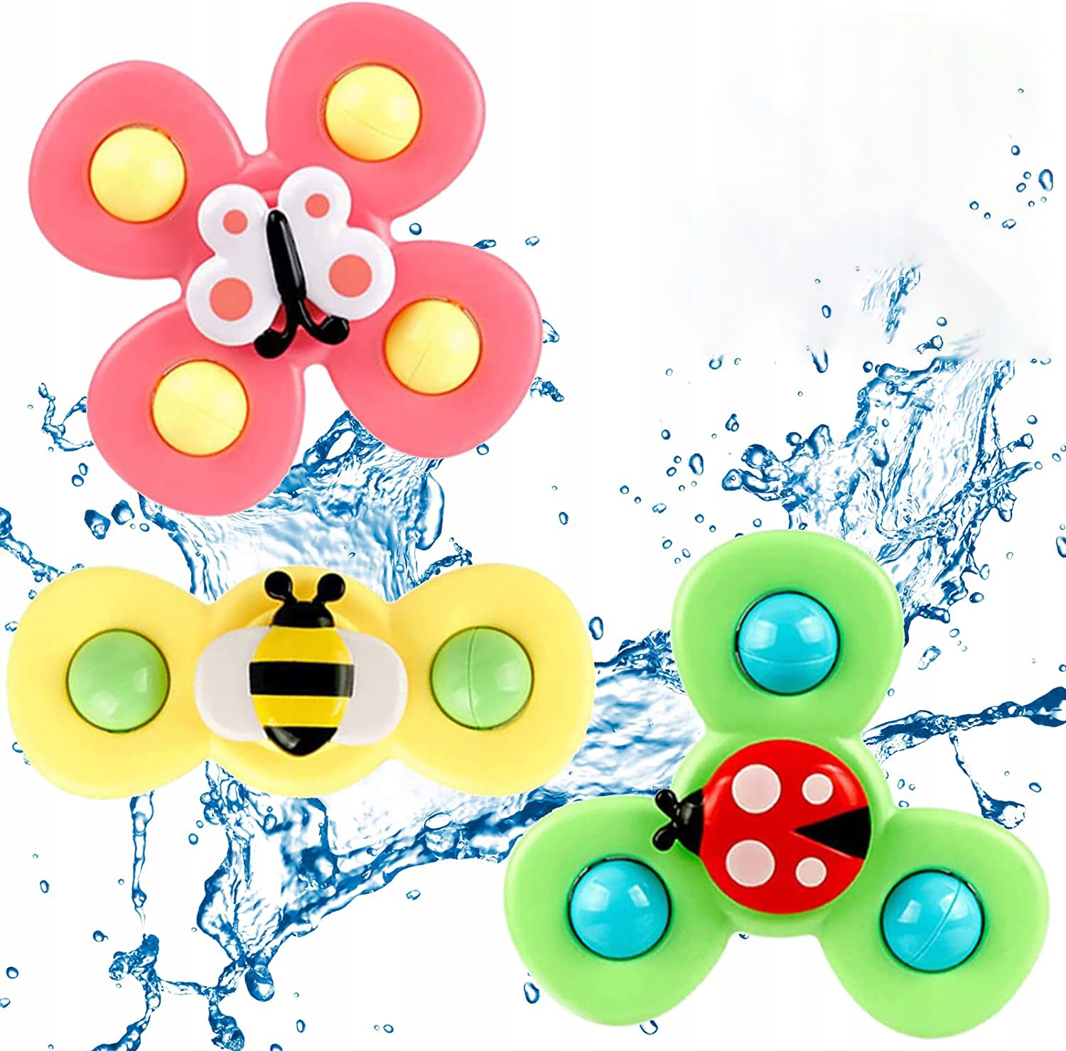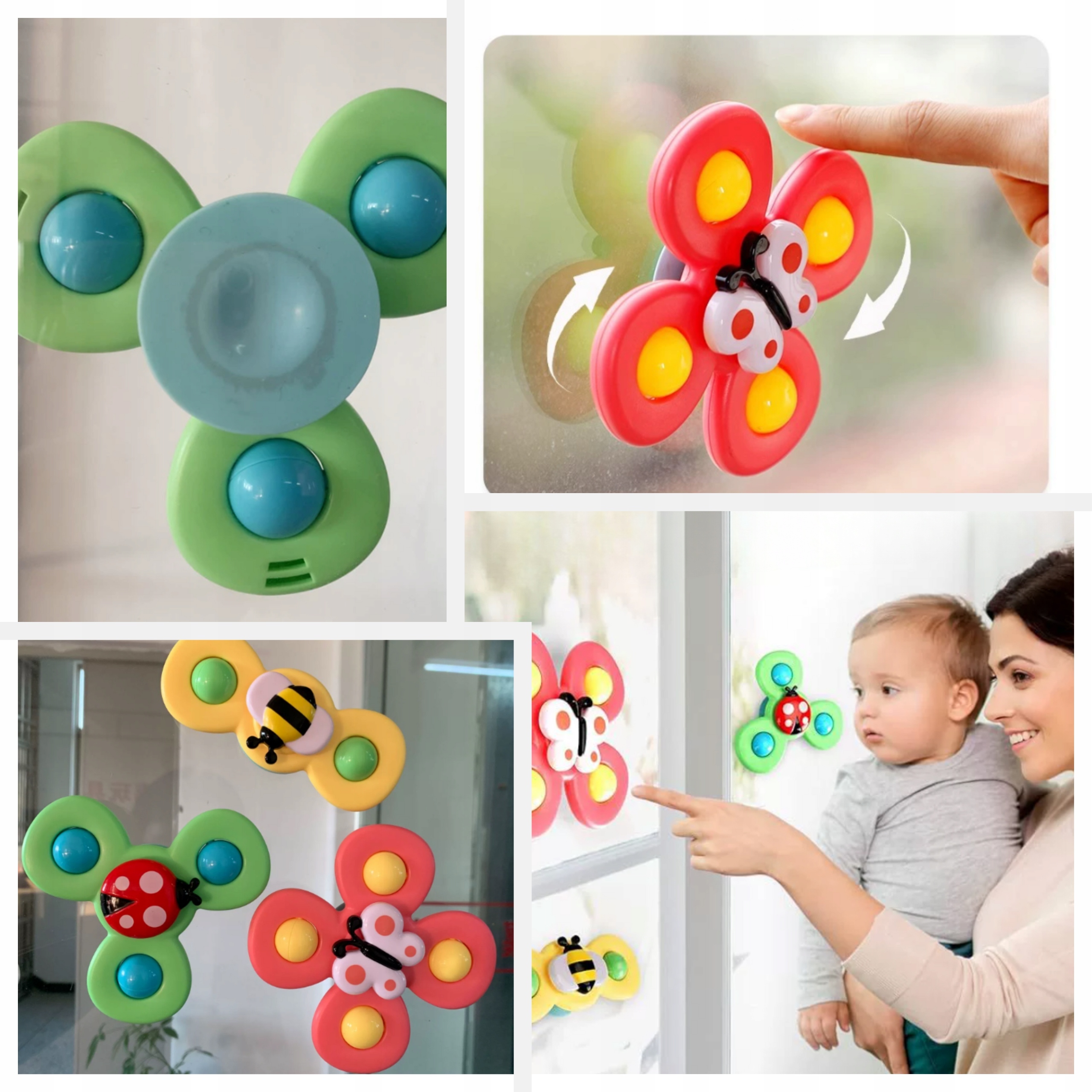 ⭐ W zestawie znajdują się 3 sztuki spinerów w trzech różnych kolorach. Spinery można zabrać wszędzie i przyczepić wszędzie dzięki gumowym przyssawkom. Zabawke można przyczepić zarówno do szyby w czasie podróży oraz do wanny w czasie kąpieli (zabawkę można moczyć).