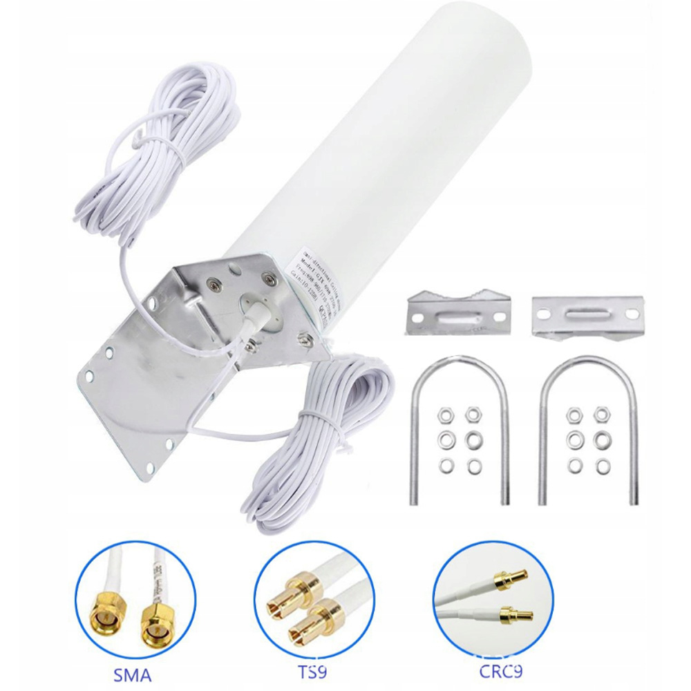 698 - 2700 MHz; Wzmocnienie: 12 dBi; Kierunek: dookólny; Długość kabla: 5 metrów kabla o niskich stratach; Złącze antenowe: męskie SMA; Kabel adaptera: żeński SMA do podwójnego TS9; Antena o wysokim wzmocnieniu: Znacznie poprawia zasięg sygnału WiFi / 4G. Poprawia odbiór mobilnego Internetu szerokopasmowego, gdy znajdujesz się w obszarze słabego sygnału.