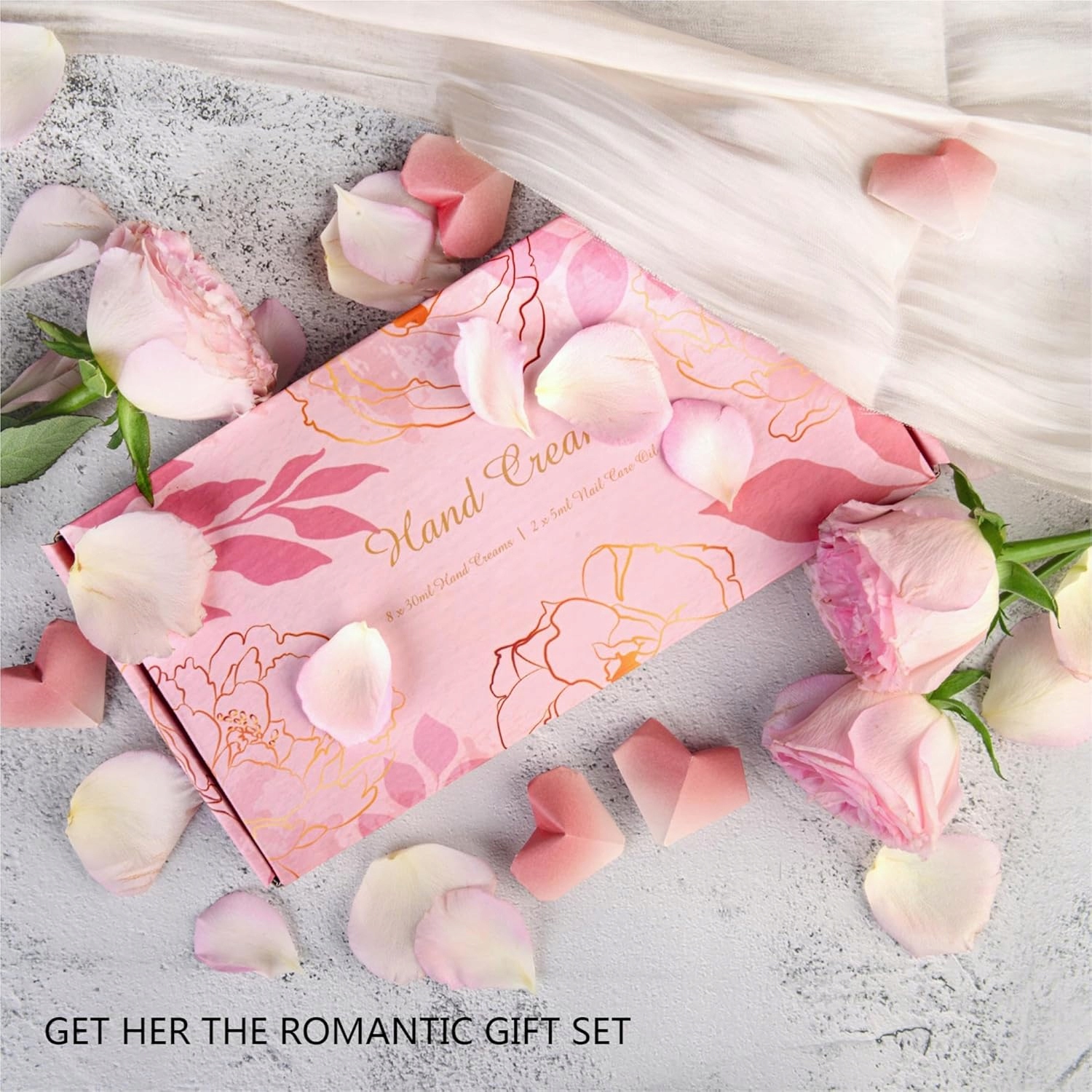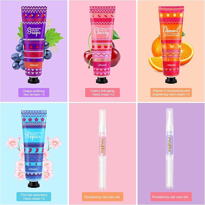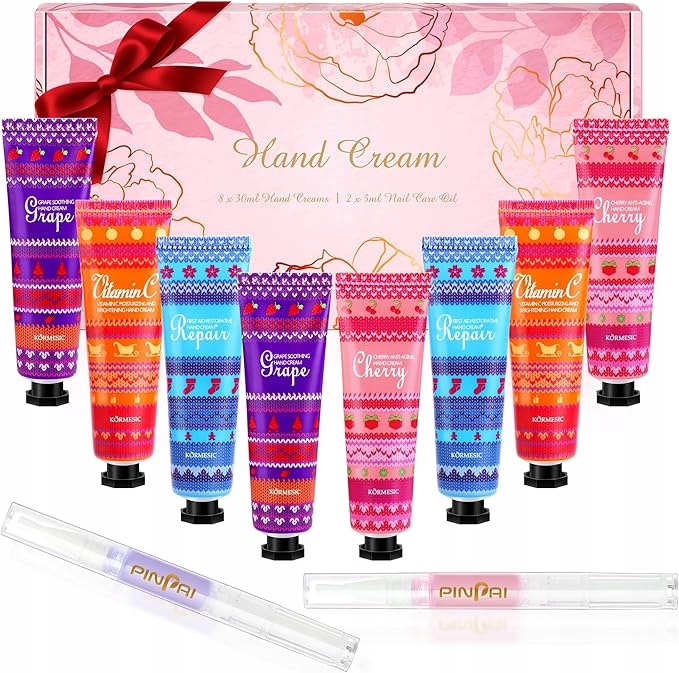 Zestaw 8 kremów do rąk dla kobiet o zapachach: winogro, wiśnia, pomarańcza oraz gruszka. Zestaw zawiera również 2 odżywcze olejki do pielęgnacji paznokci. Balsamy do rąk i olejki do pielęgnacji paznokci są dobrze zapakowane w piękne różowe pudełko, możesz je wysłać do swojej przyjaciółki jako zestaw upominkowy lub rozbić te mini kremy do rąk na pojedyncze części, aby stworzyć osobisty zestaw upominkowy DIY.