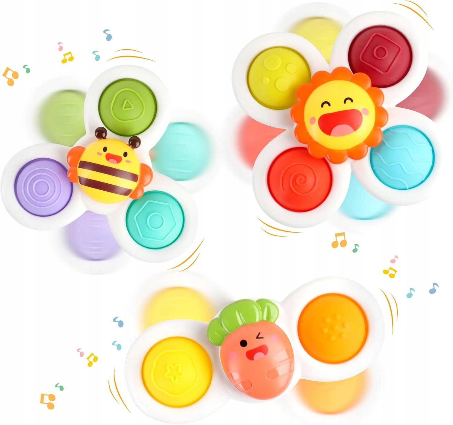 Otrzymasz zestaw 3 uroczych zabawek z przyssawką, w kształcie słońca, pszczoły i marchewki. Bez potrzeby baterii – wystarczy dotknąć, aby wprowadzić je w ruch. Elastyczne łożysko zapewnia długotrwałą rotację, a mocna przyssawka przyczepia się do każdej gładkiej powierzchni: ścian, podłóg, stołów, wanny, okien samochodowych i innych. Idealna zarówno do zabawy w domu, jak i na zewnątrz – zabawka zapewni Twojemu maluchowi mnóstwo radości!