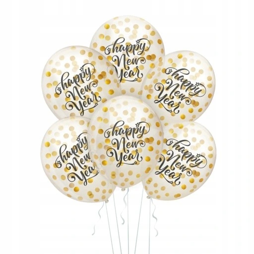 Stylowe, przezroczyste balony ze złotymi konfetti i napisem "Happy New Year". Idealny wybór, by wprowadzić blask i elegancję do sylwestrowej dekoracji. Te balony przyciągną wzrok i doskonale sprawdzą się jako tło do zdjęć lub ozdoba stołu.
