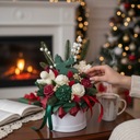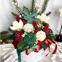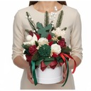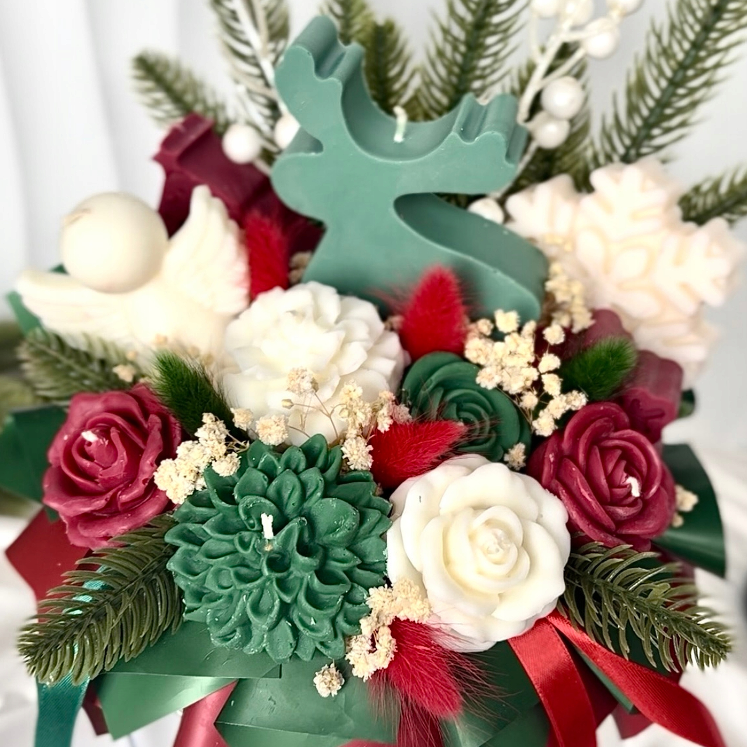 Kompozycja w odcieniach czerwieni, zieleni i bieli/ecru, wzbogacona figurkami świec takimi jak: renifer, śnieżynka, choinka, ciasteczkowy ludzik, aniołek oraz kwiaty – tworzy wyjątkowy, zimowy klimat.