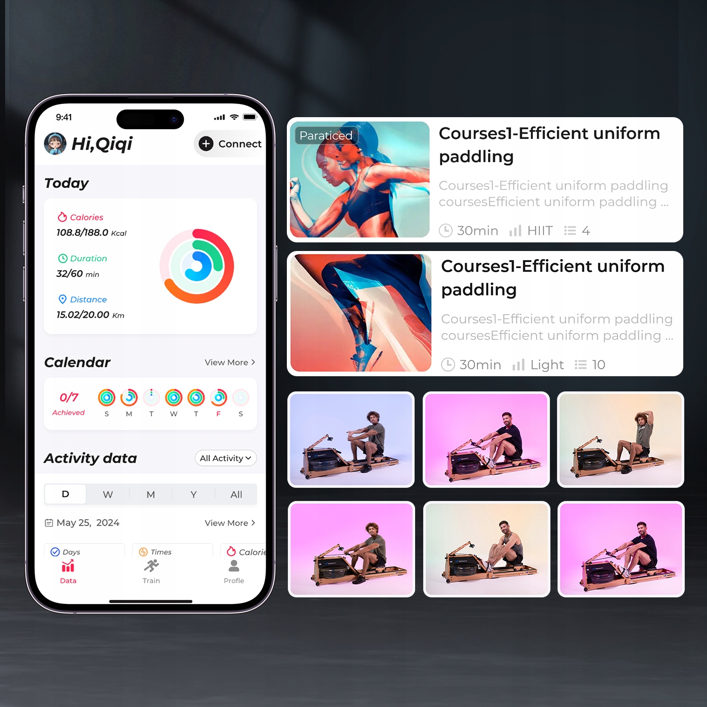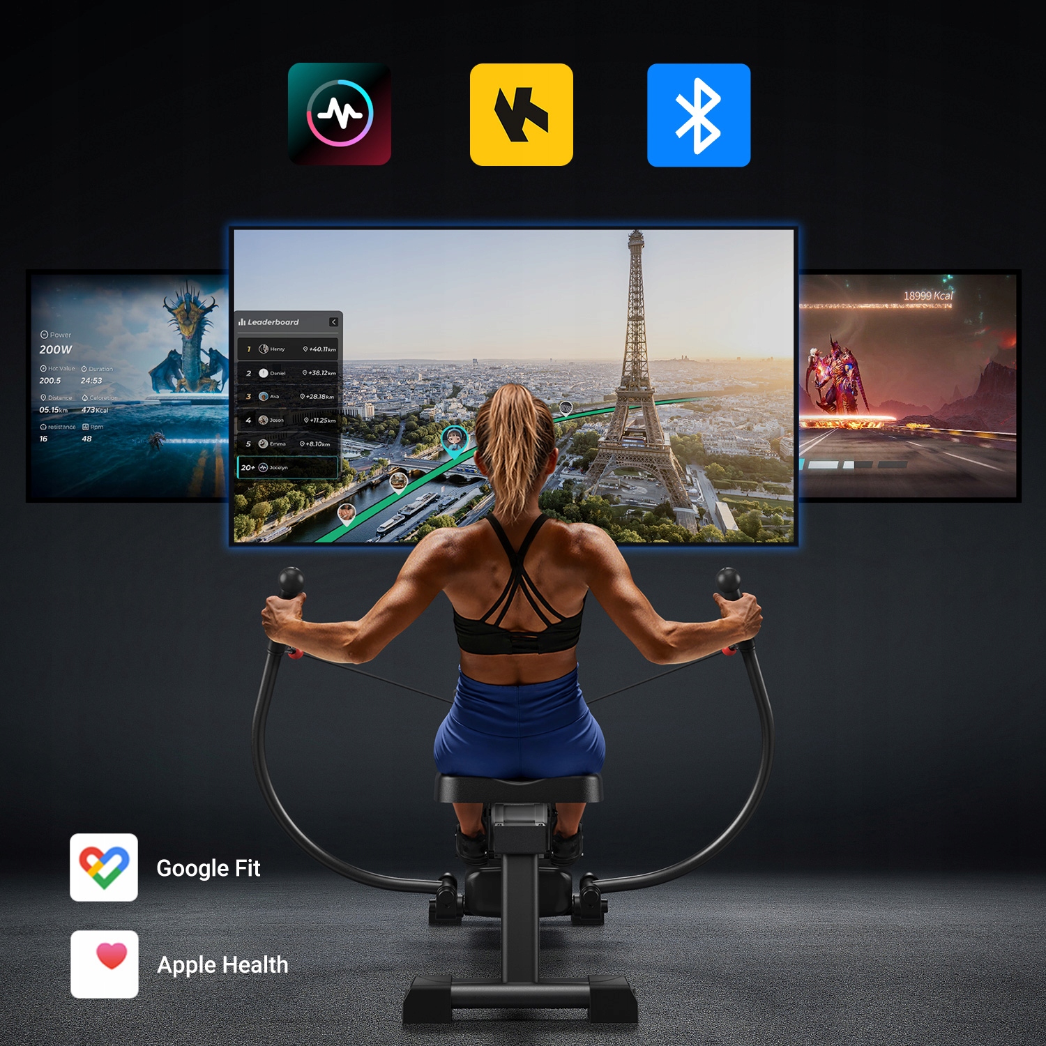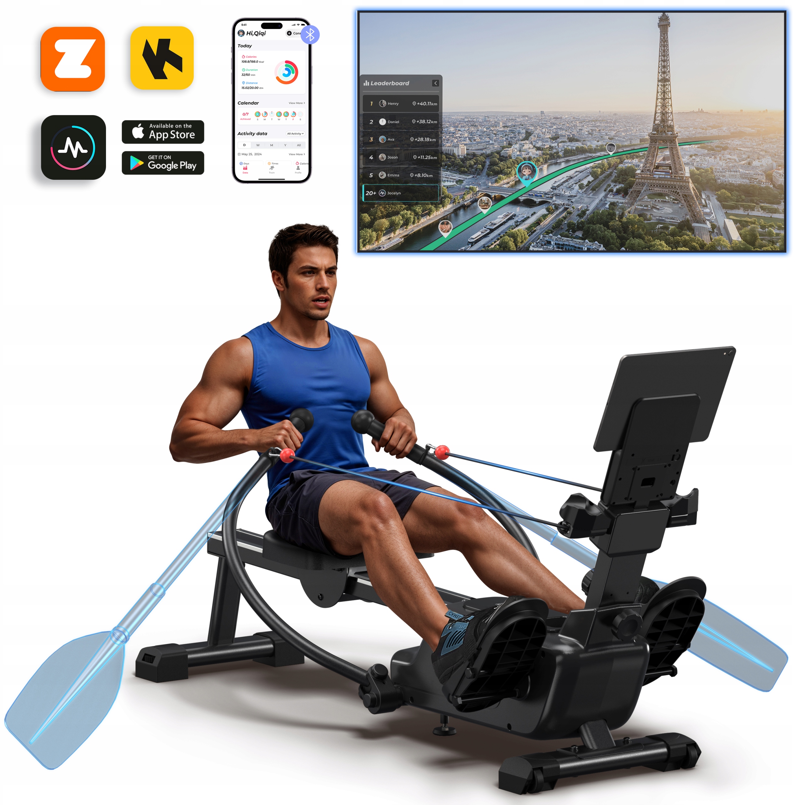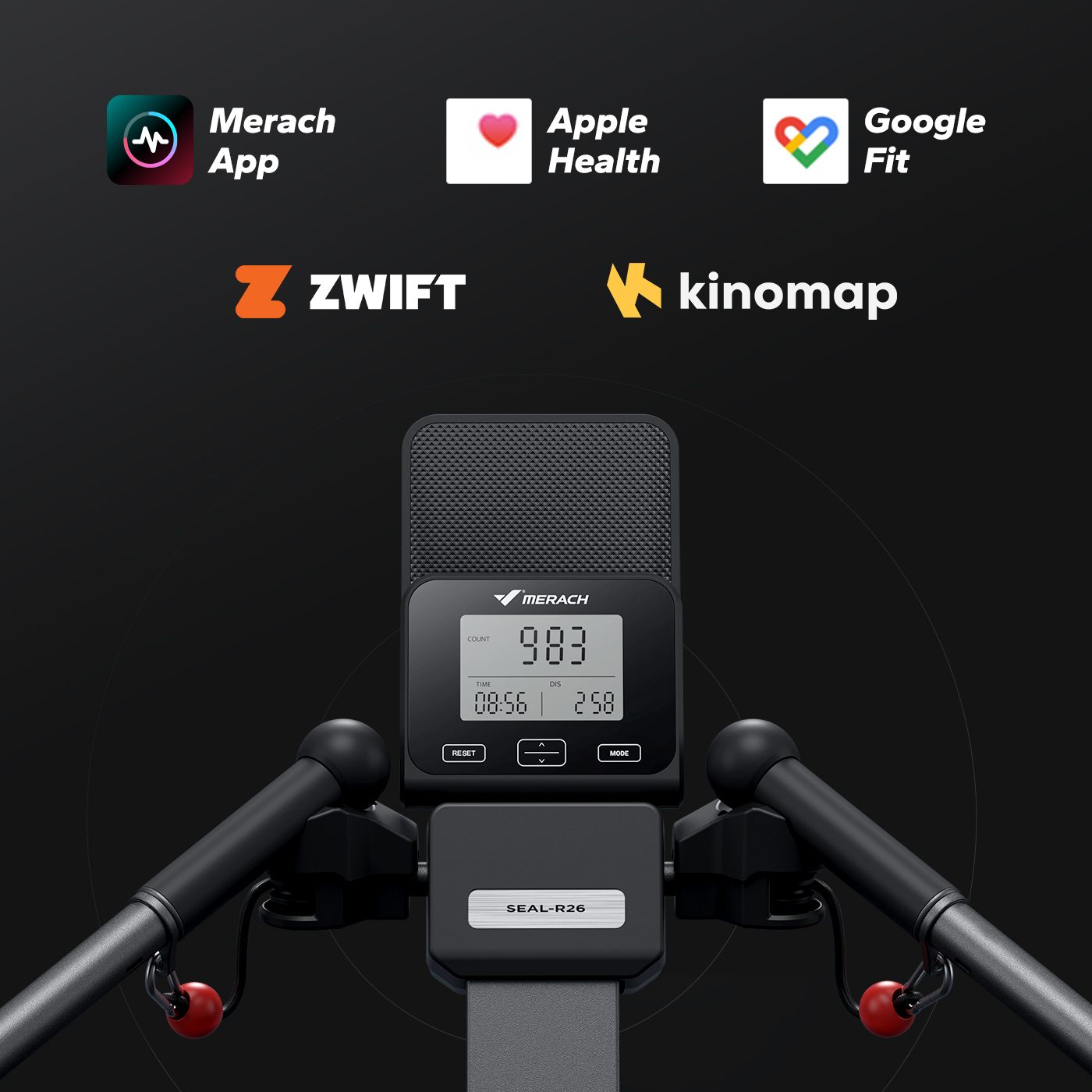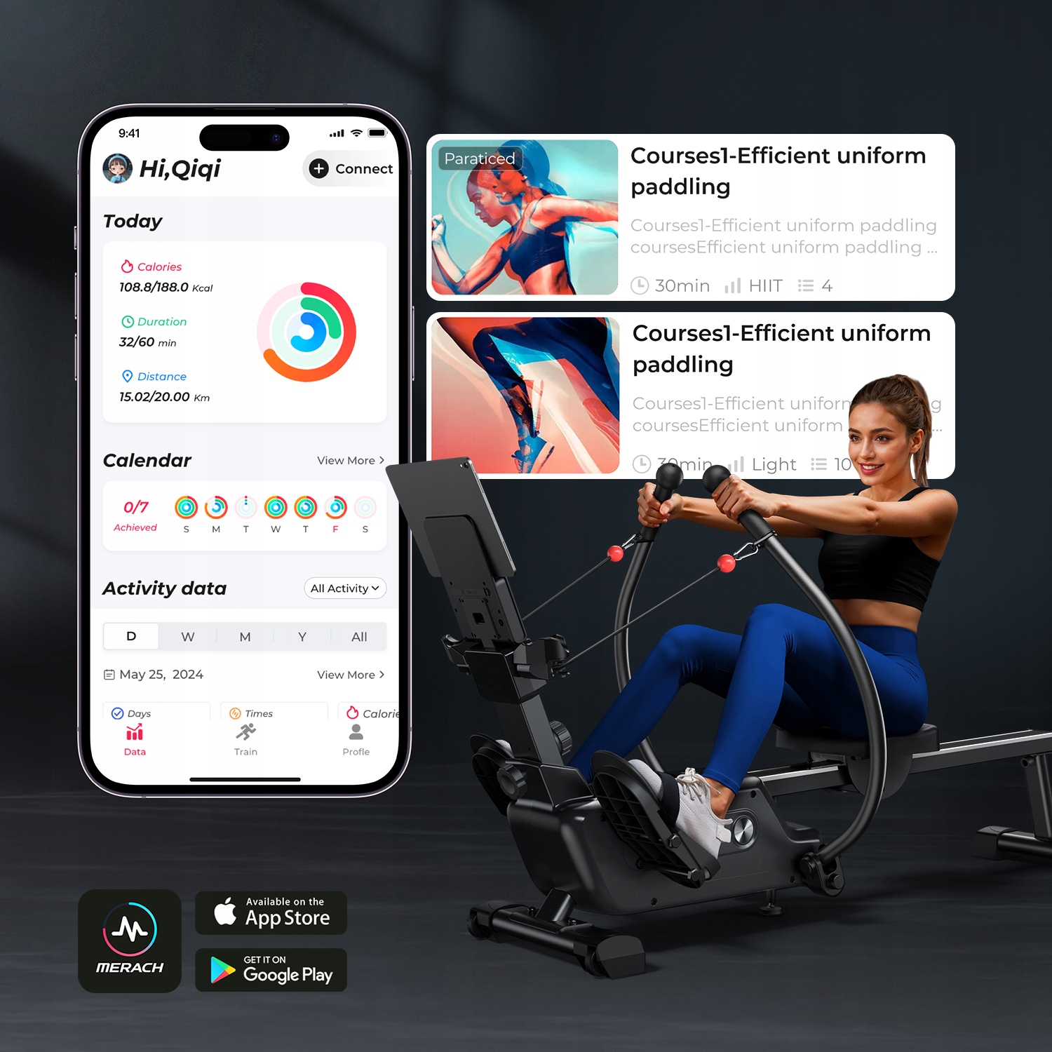 Połącz wioślarza z aplikacją MERACH, Apple Health lub Google Fit, aby śledzić swoje postępy i korzystać z interaktywnych zajęć oraz motywującej społeczności.