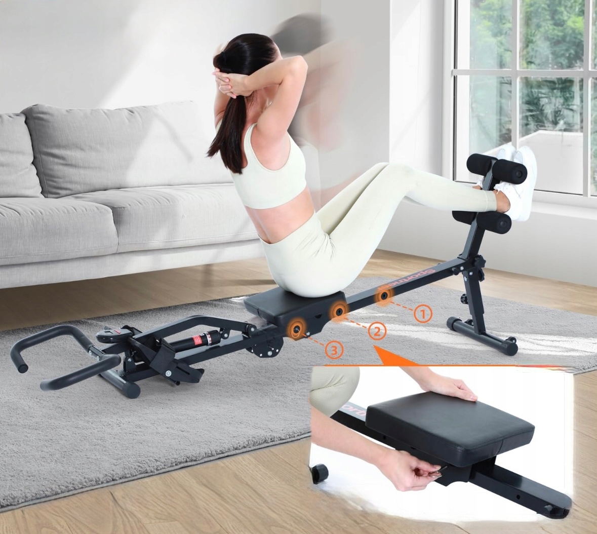 Uchwyt w kształcie litery U umożliwia różnorodne chwyty, które aktywują ramiona, plecy i klatkę piersiową. Dzięki regulowanemu oparciu wykonasz też ćwiczenia na brzuch i pompki.