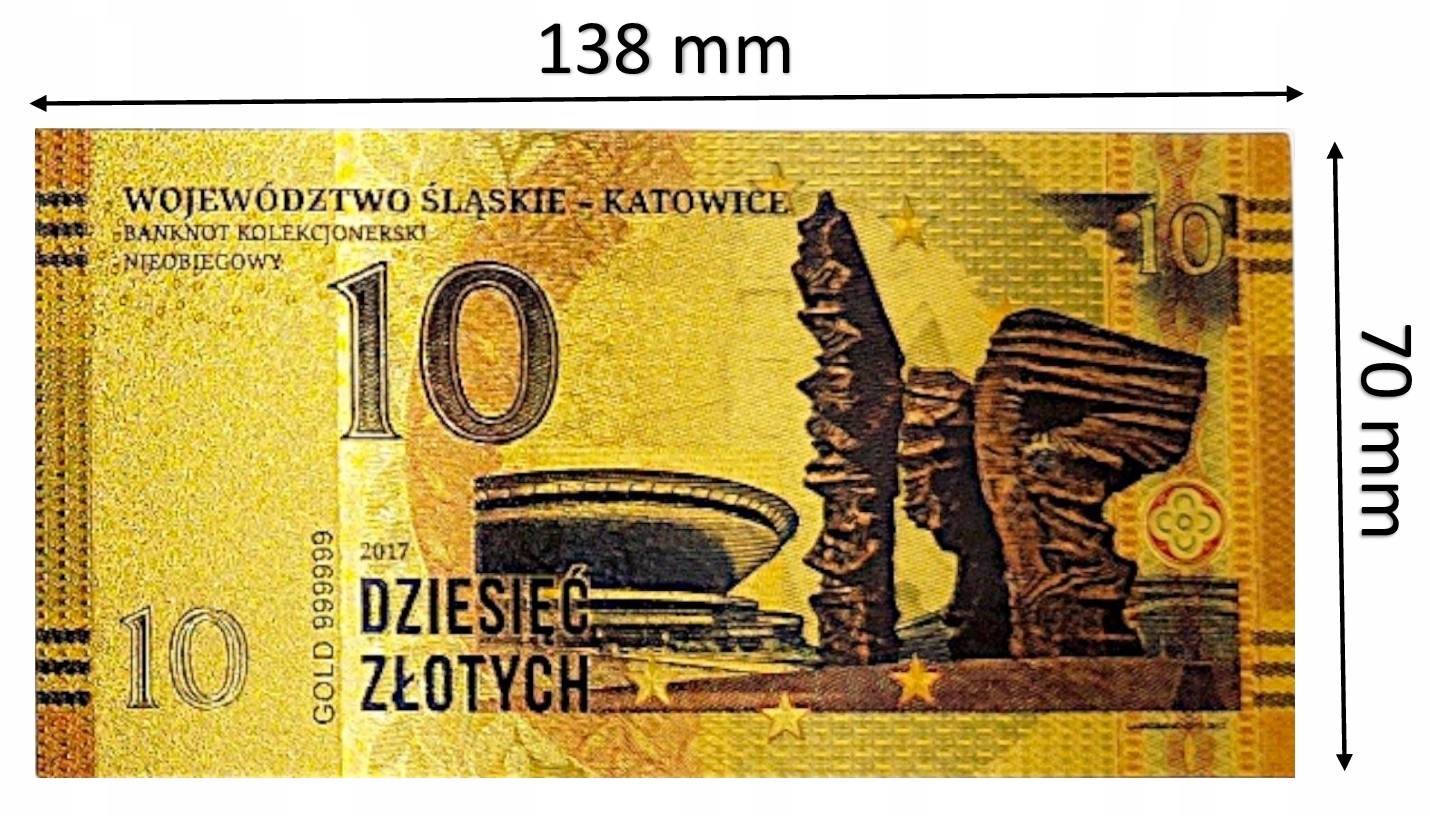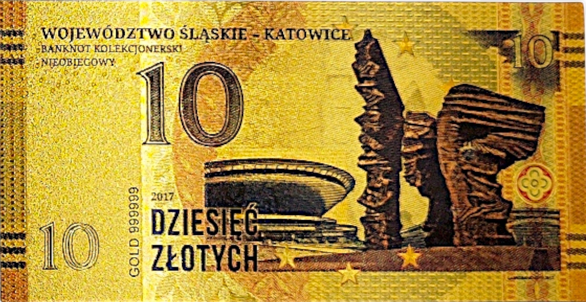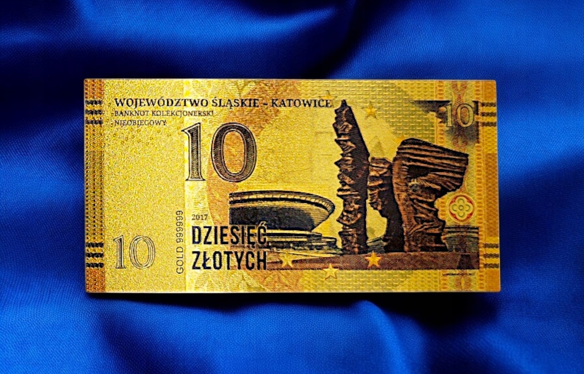 ⭐Efektowny kolekcjonerski banknot pozłacany, wykonany z trwałego PVC, przedstawiający najważniejsze symbole Katowic oraz przemysłowo-kulturalne dziedzictwo Województwa Śląskiego.