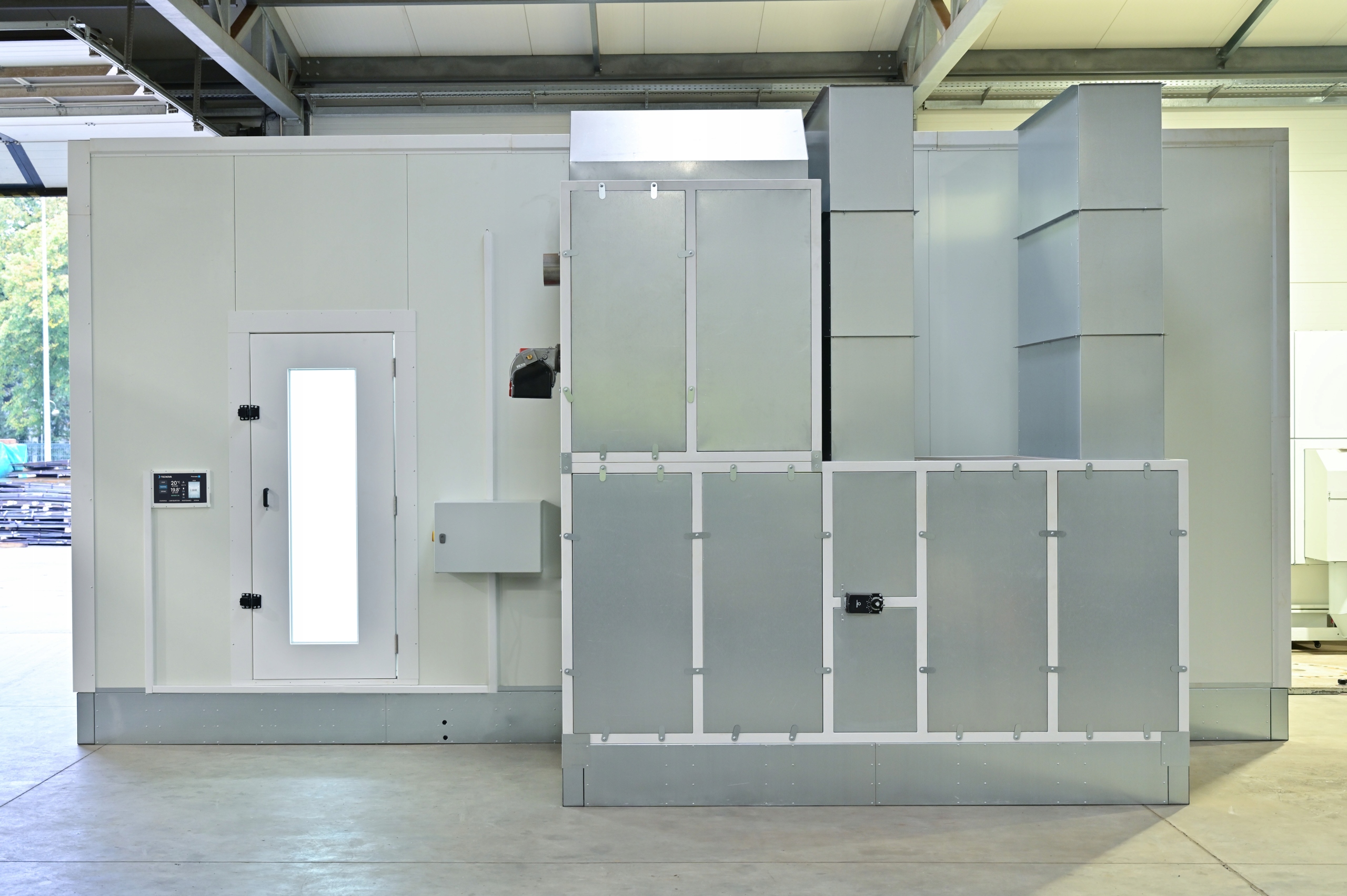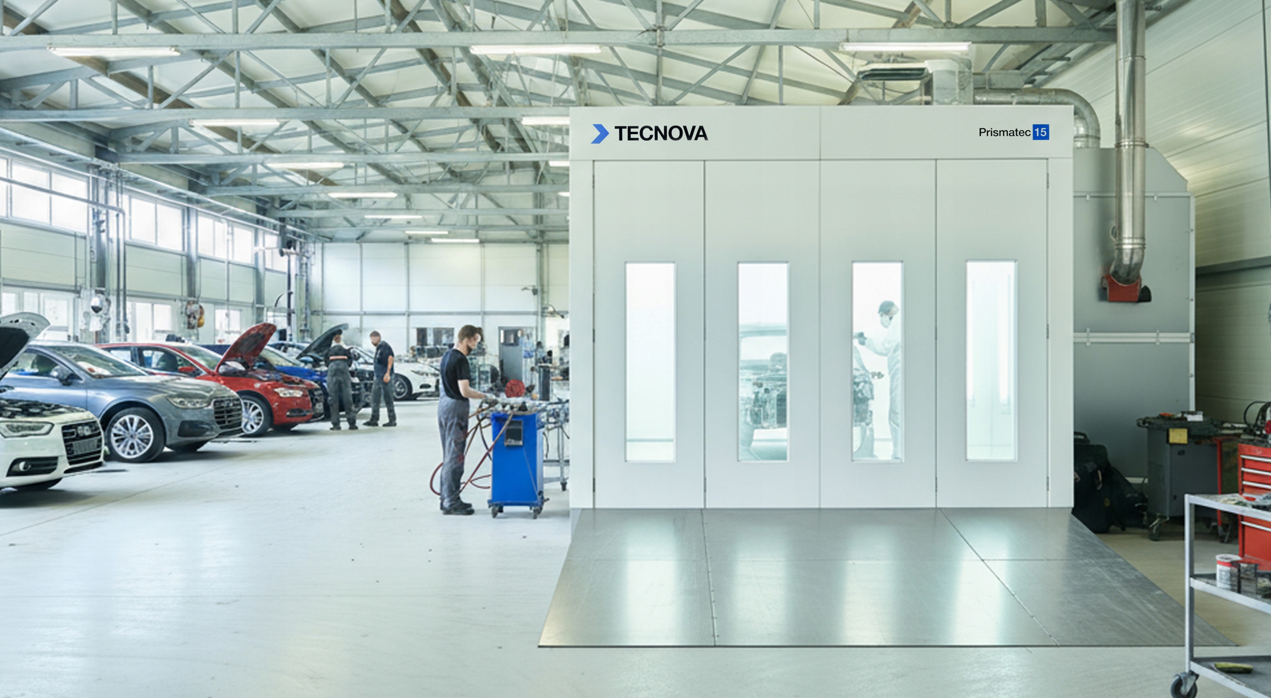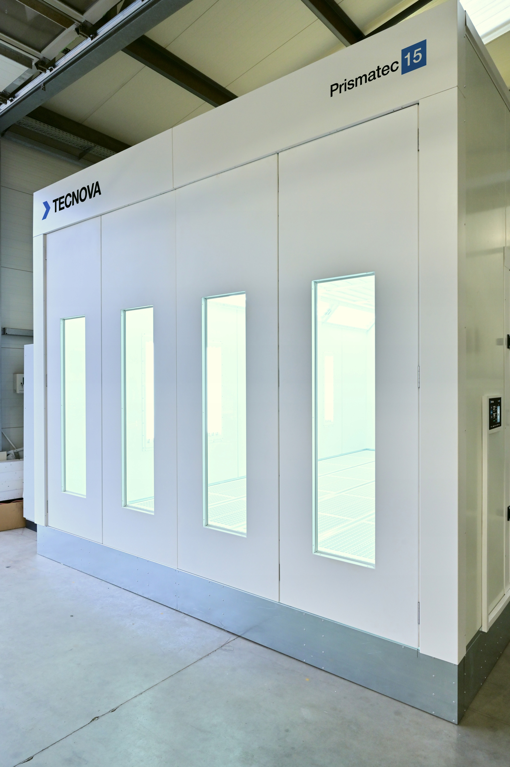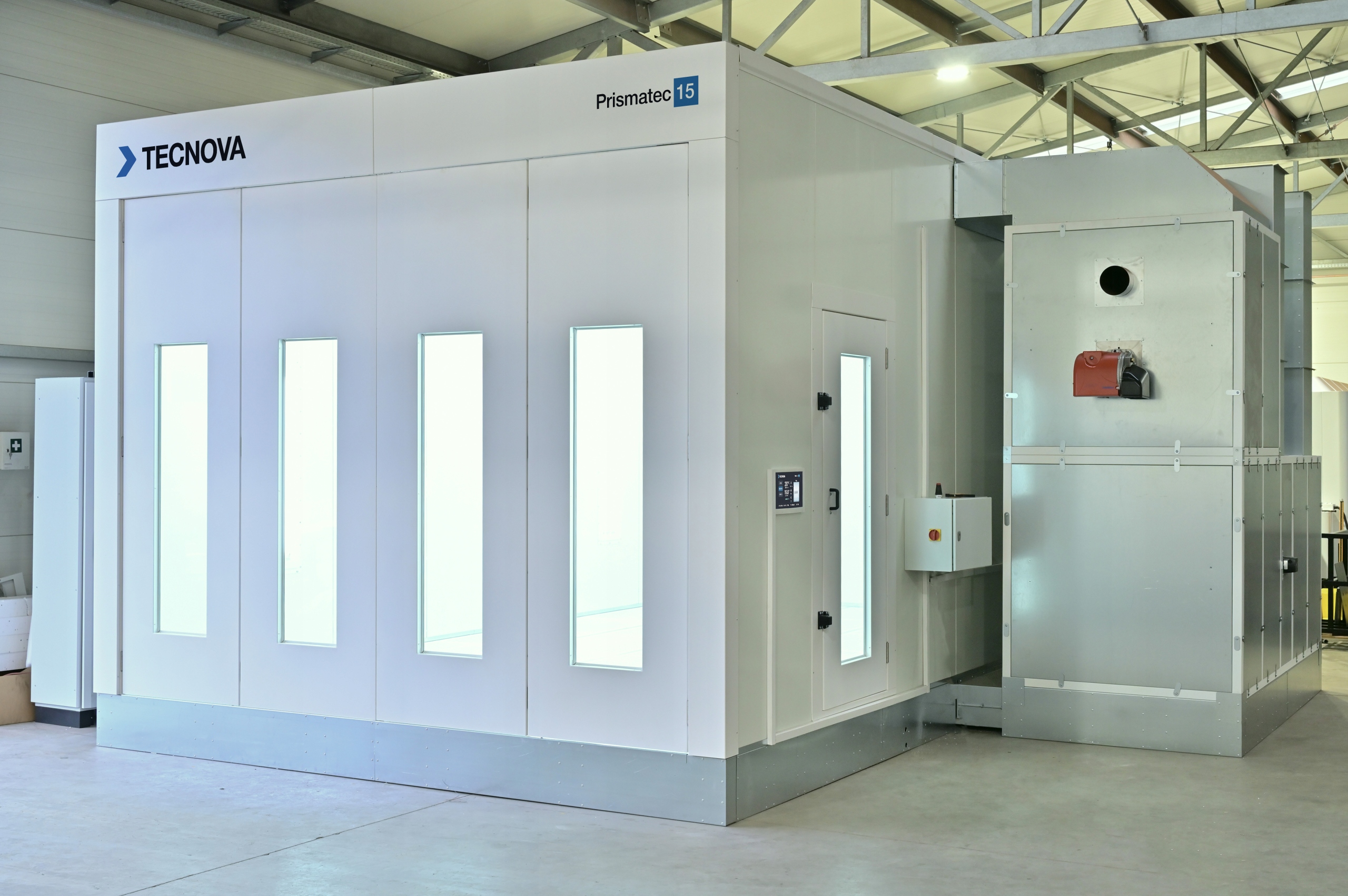 TEC NOVA PRISMATEC 15 to nowoczesna kabina lakiernicza zaprojektowana z myślą o zakładach przemysłowych i profesjonalnych warsztatach. Konstrukcja opiera się na panelach PIR oraz stalowej ramie z profili i blach ocynkowanych 1,5 mm, co zapewnia stabilność, izolację i długą żywotność całej struktury. Wnętrze uzupełnia aluminiowa stolarka oraz podłoga z platformą podniesioną o 330 mm, która gwarantuje optymalny przepływ powietrza i komfort pracy.