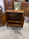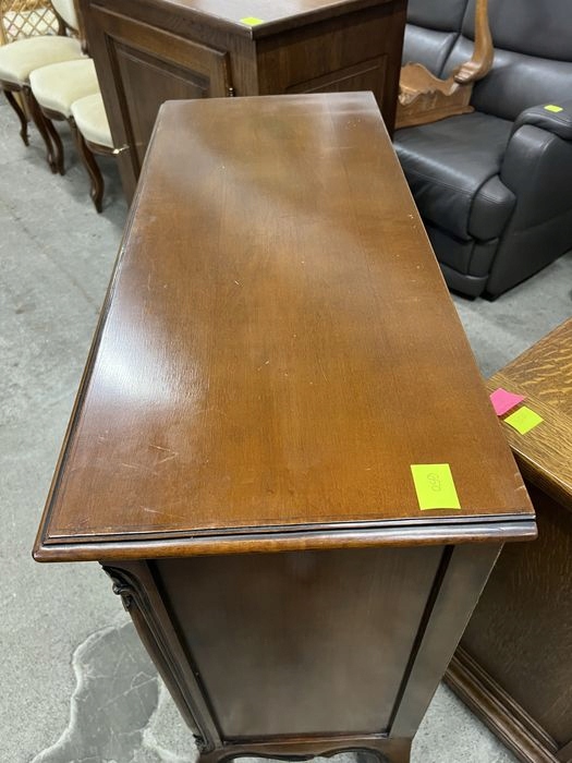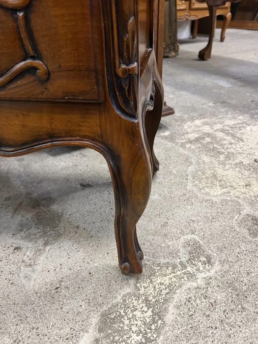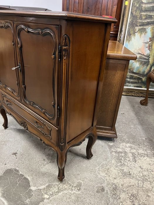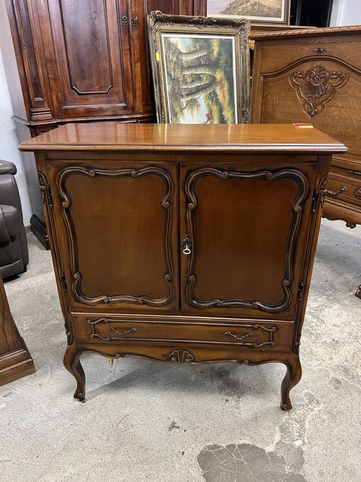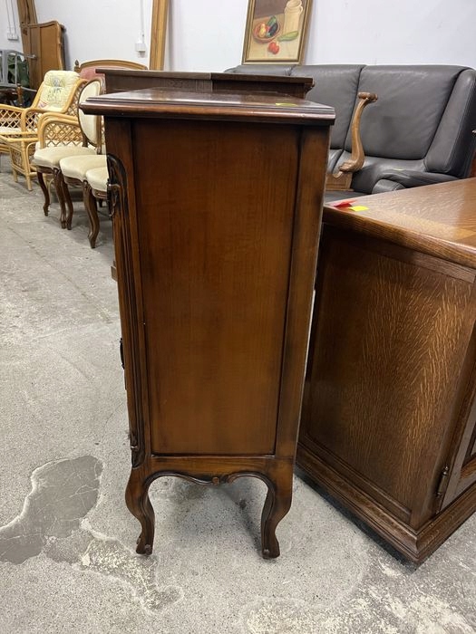 Przedmiotem sprzedaży jest drewniana szafka w stylu ludwikowskim z ozdobnymi ramkami na drzwiczkach.