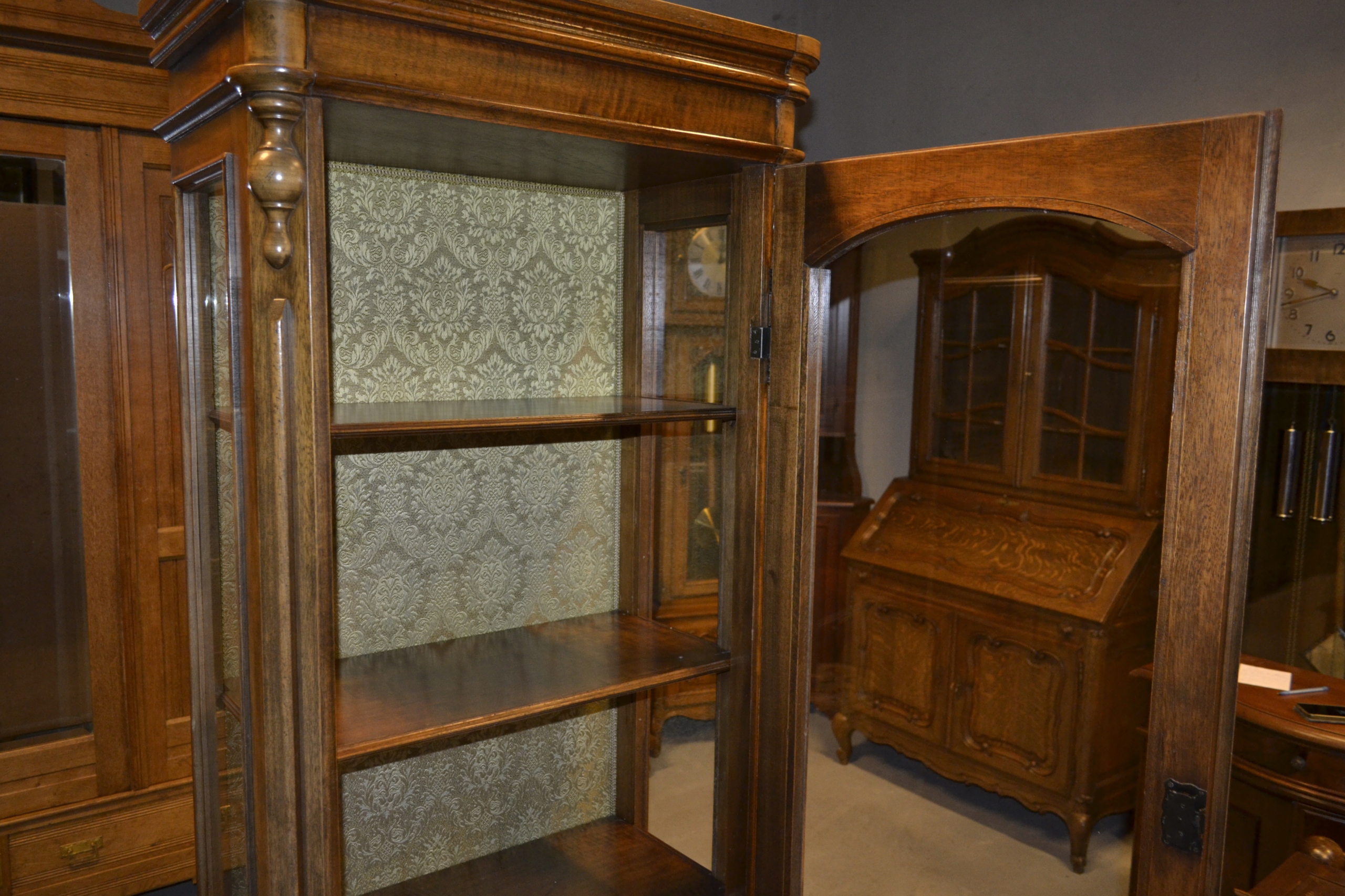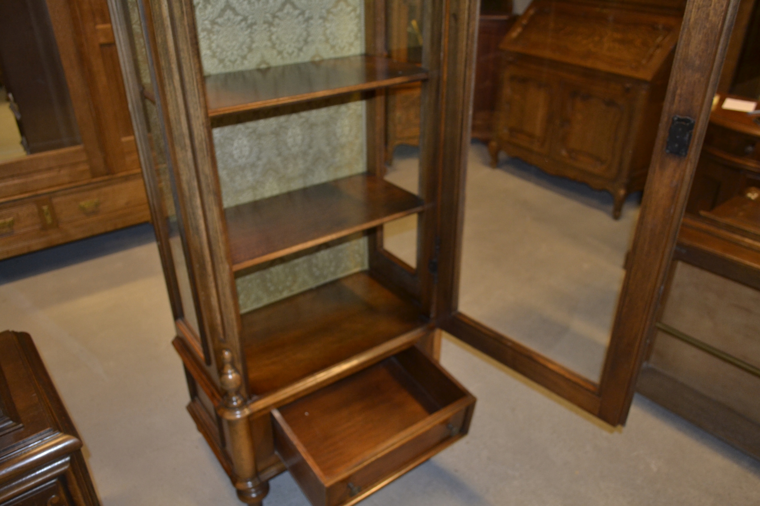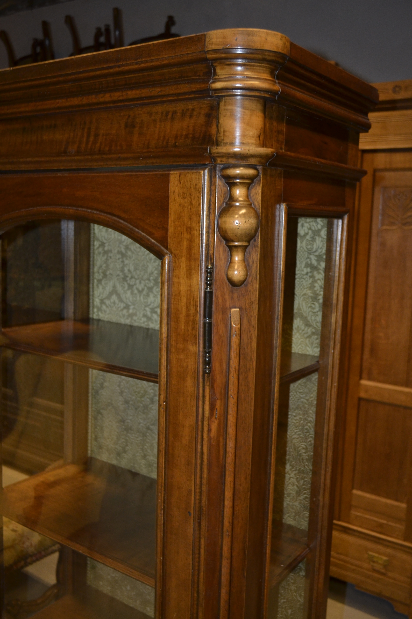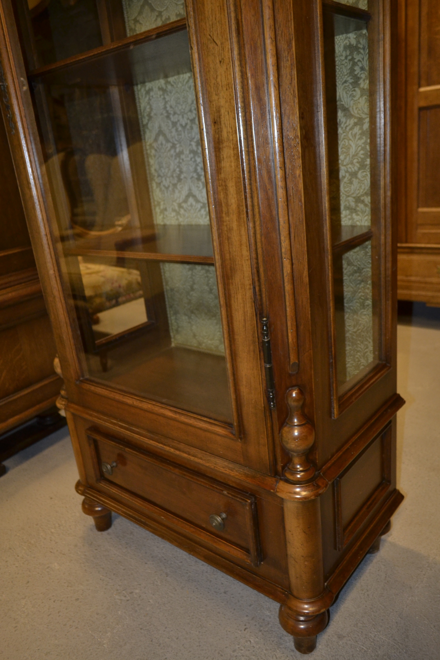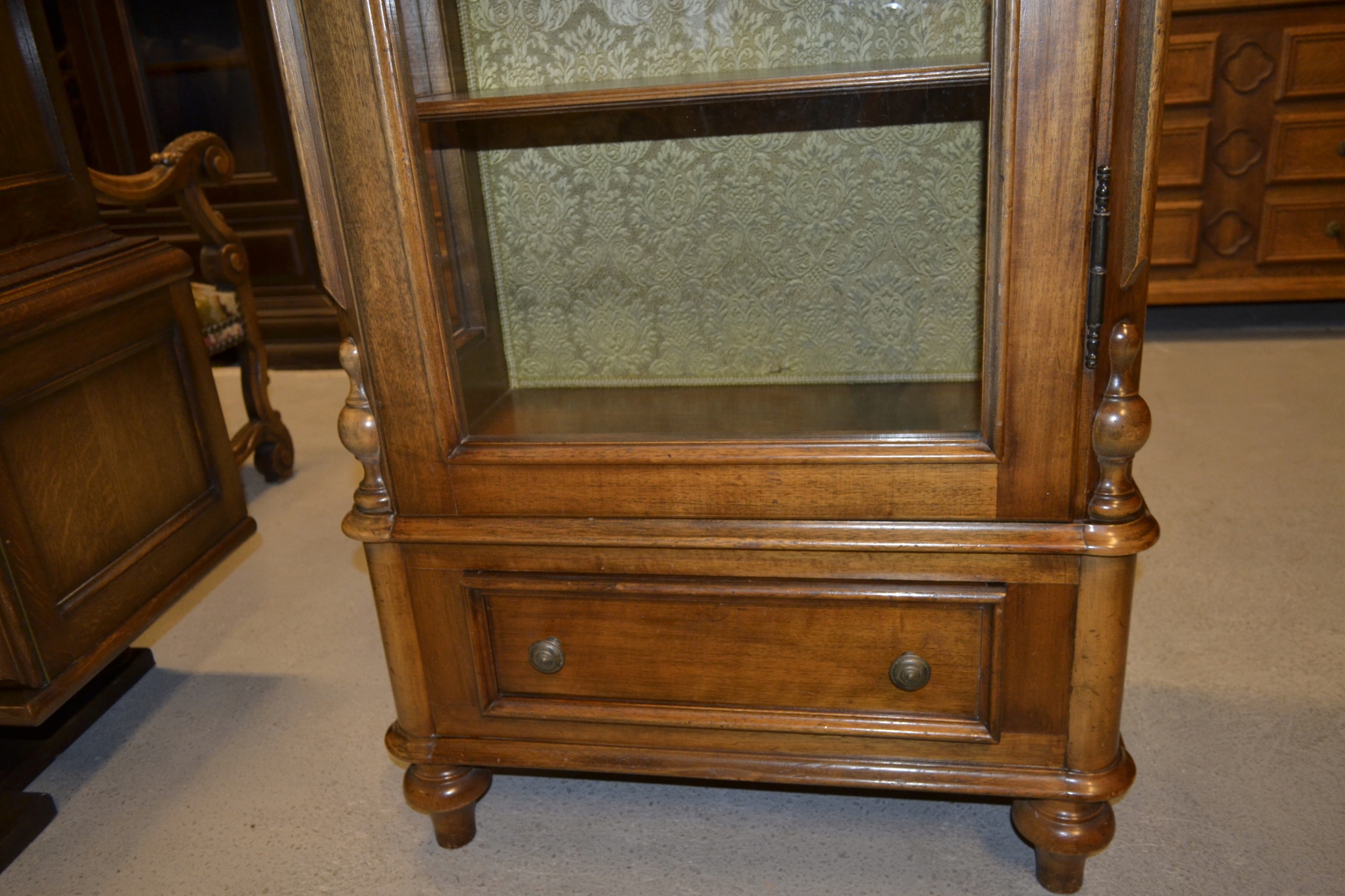 piękna ,jednodrzwiowa witryna . mebel jak selwa . wykończony w orzechu ,wykończenie zewnętrzne z imitacjami drobnych śladów używania ( ciemne plami ,obicia ) na plecach piękna tapicerka . witryna jest gustownie zdobiona ,posiada ozdobne okucia . elegancki mebel do aranżacji wnętrz ,które maja stworzyć ciepłą ,elegancką i ponadczasową atmosferę stan używany ,bardzo dobry .