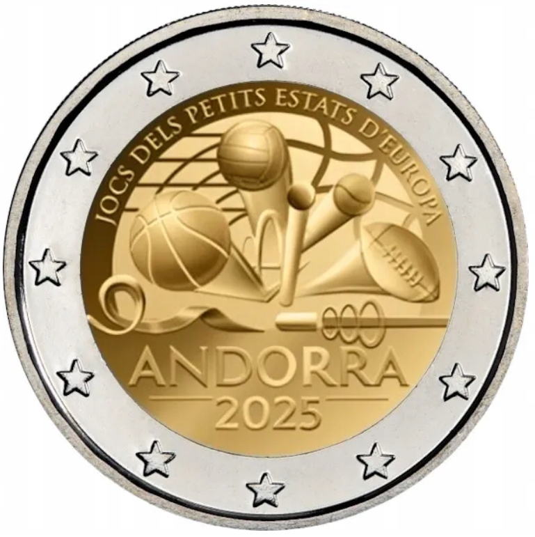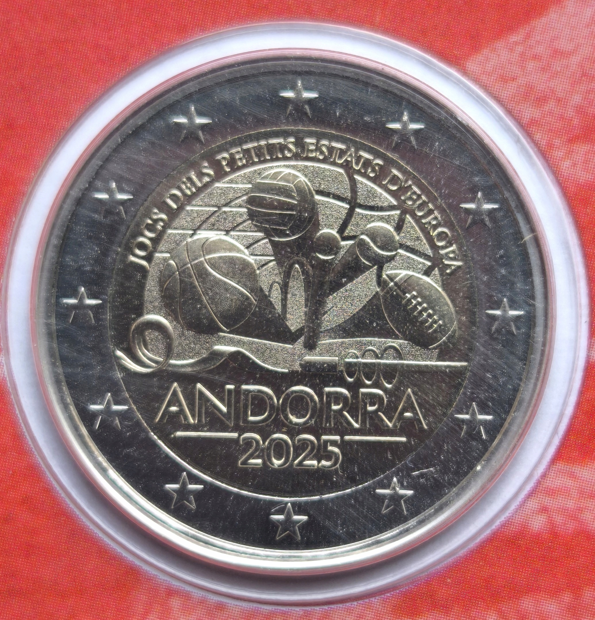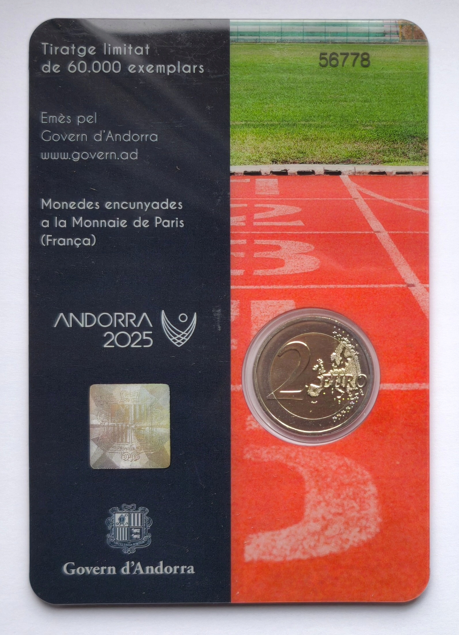 Pierwsza moneta Andory 2 euro z roku 2025 w oryginalnym ilustrowanym blistrze dedykowana jest Igrzyskom Małych Państw Europy.