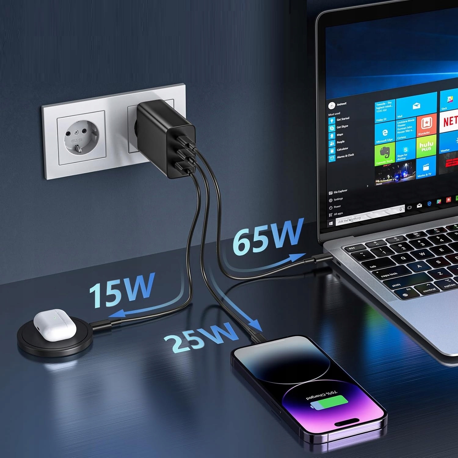 Ładowarka USB jest kompatybilna z rożnymi telefonami komórkowymi, tabletami czy laptopami. Aby osiągnąć prędkość ładowania o mocy 65 W, urządzenie musi sam obsługiwać ładowanie o mocy 65 W.