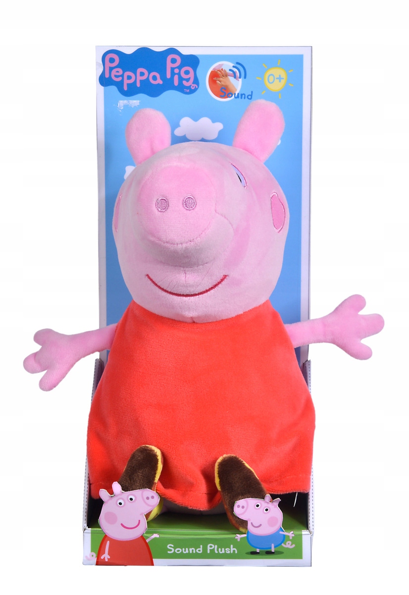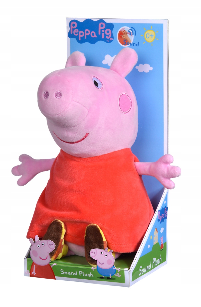 Świnka Peppa Maskotka z dźwiękiem, 22 cm. Pluszak z wizerunkiem tytułowej bohaterki, po naciśnięciu na brzuszek wydaje zabawne odgłosy bohaterki z bajki takie jak śmiech, chrumkanie, czy taplanie w błotku.