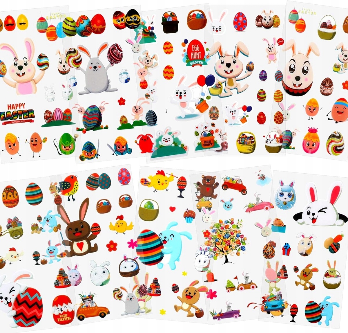 Naklejki wielkanocne HOWAF – 10 arkuszy / 150 kolorowych wzorów (zajączek, pisanki)