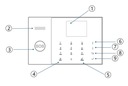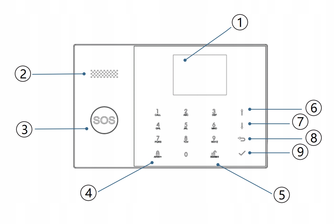 ①Ekran wyświetlacza TFT 2.4" do wyświetlania stanu systemu, zegara, informacji o alarmie strefowym, menu, dźwięków alarmowych i monitów głosowych o działanie.