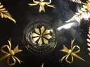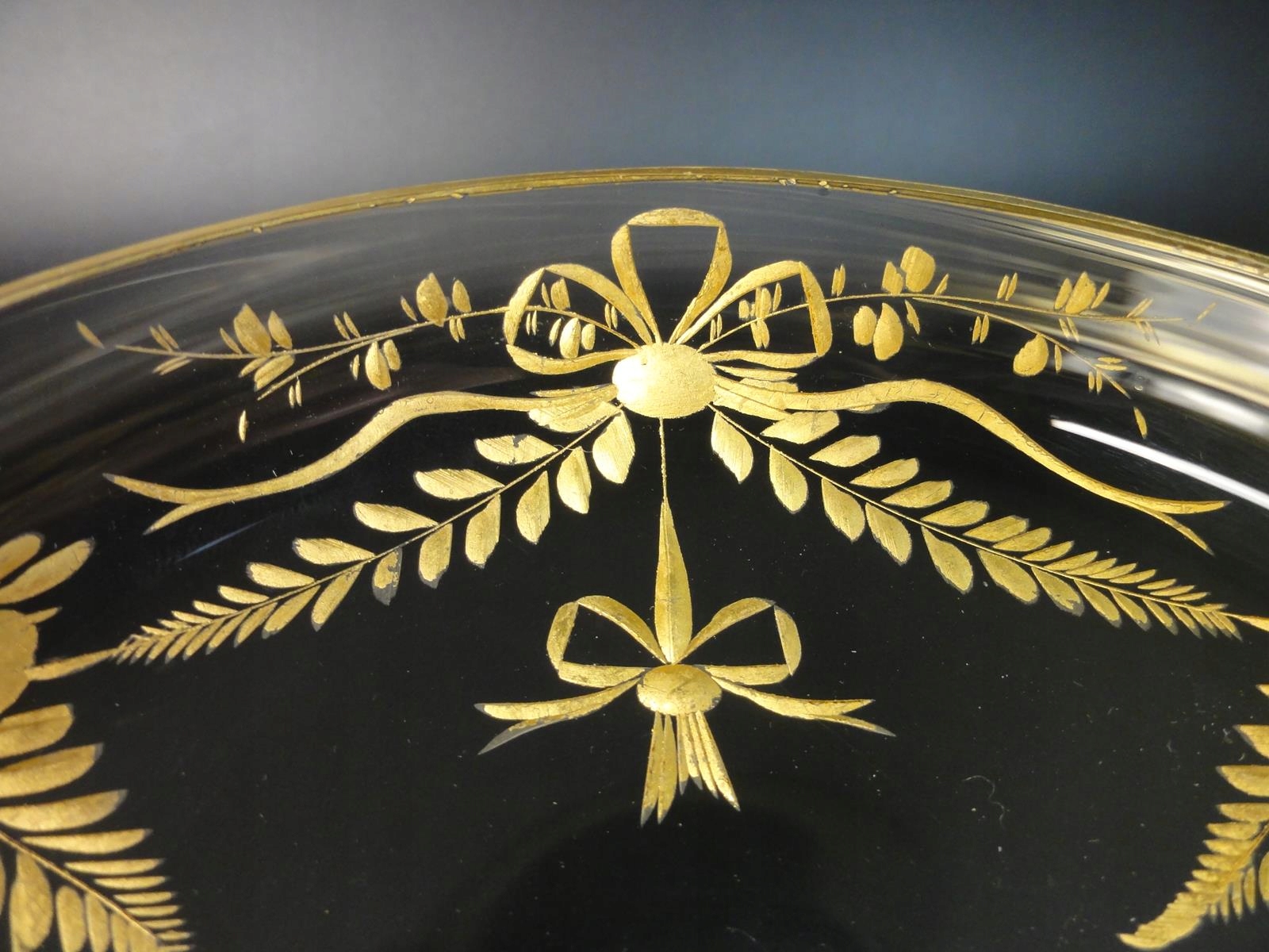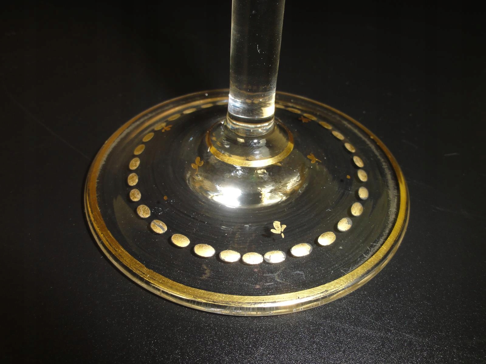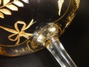 *elegancka, wykonana ręcznie patera ze szkła bezbarwnego, osadzona na wysokiej, smukłej nodze. Czasza zdobiona jest bogatym szlifem, ręcznie malowanym złoceniem, przedstawiającym motywy kwiatowe, liście oraz dekoracyjne kokardy. Krawędź dodatkowo obrzeżona złotą linią. Na stopie widoczna klasyczna, punktowa dekoracja złoconymi owalami.