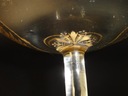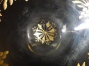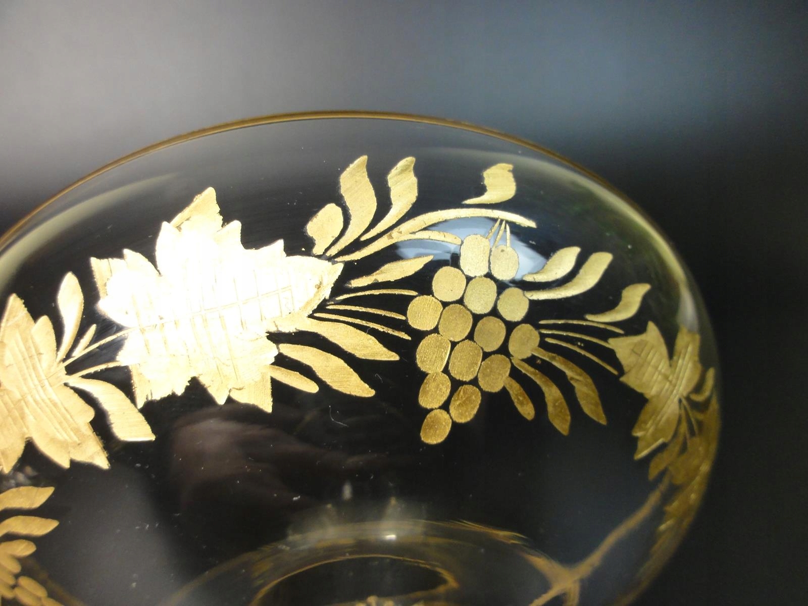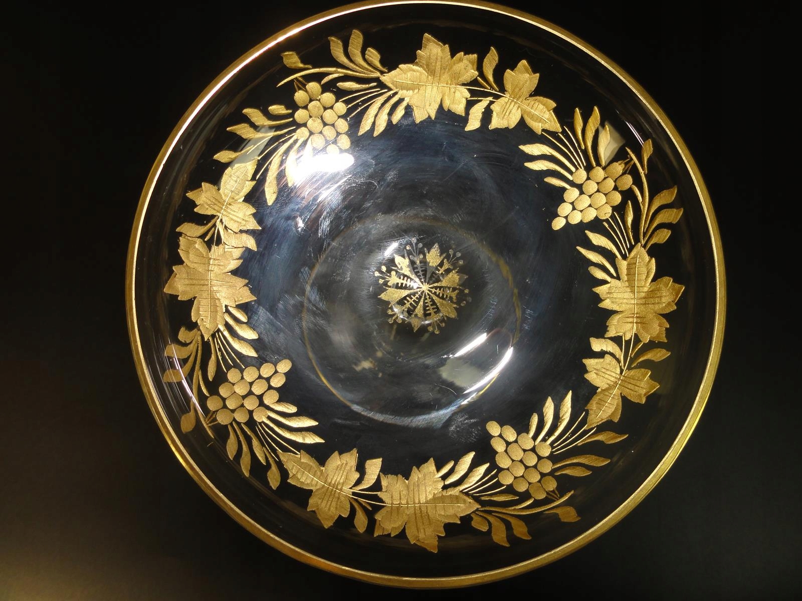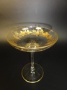 *elegancka, wykonana ręcznie patera ze szkła bezbarwnego, osadzona na wysokiej, smukłej nodze. Czasza zdobiona jest bogatym szlifem, ręcznie malowanym złoceniem, przedstawiającym motywy roślinne, winorośl. Krawędź stopy i czarki ze złotą linią.