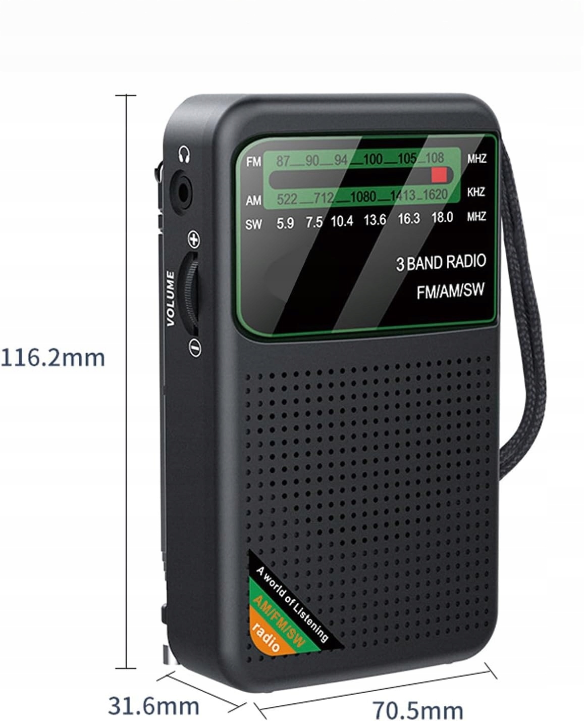 3 PASMA - radio FM/AM/krótkofalowe zasilane bateryjnie. Proszę używać pasma AM w pobliżu okna lub na zewnątrz. Pasmo krótkofalowe nadaje się do międzynarodowych kanałów alarmowych, zazwyczaj wymaga lepszego otoczenia. Nie wszystkie lokalizacje mogą odbierać stacje krótkofalowe. Proszę próbować cierpliwie!