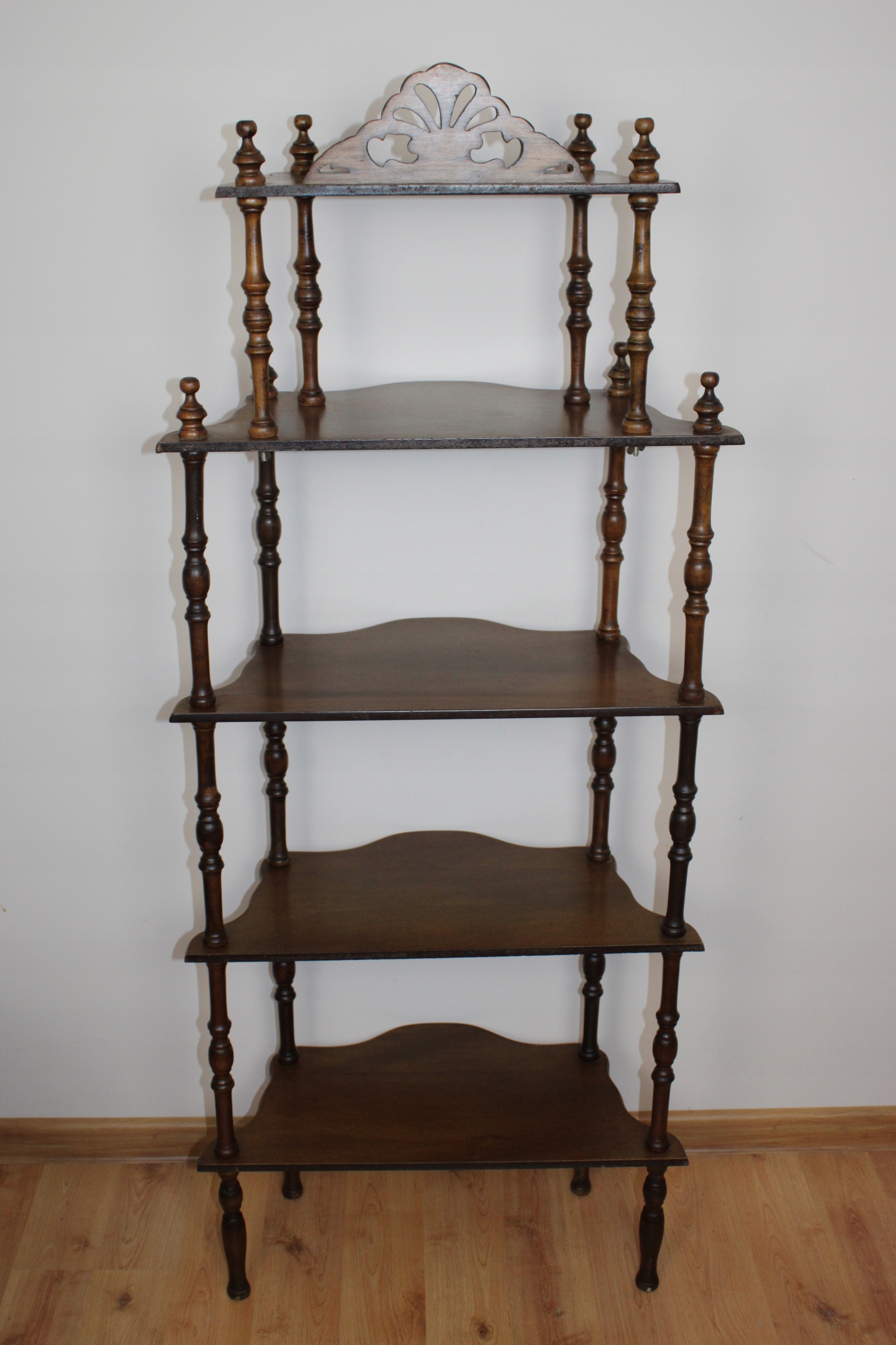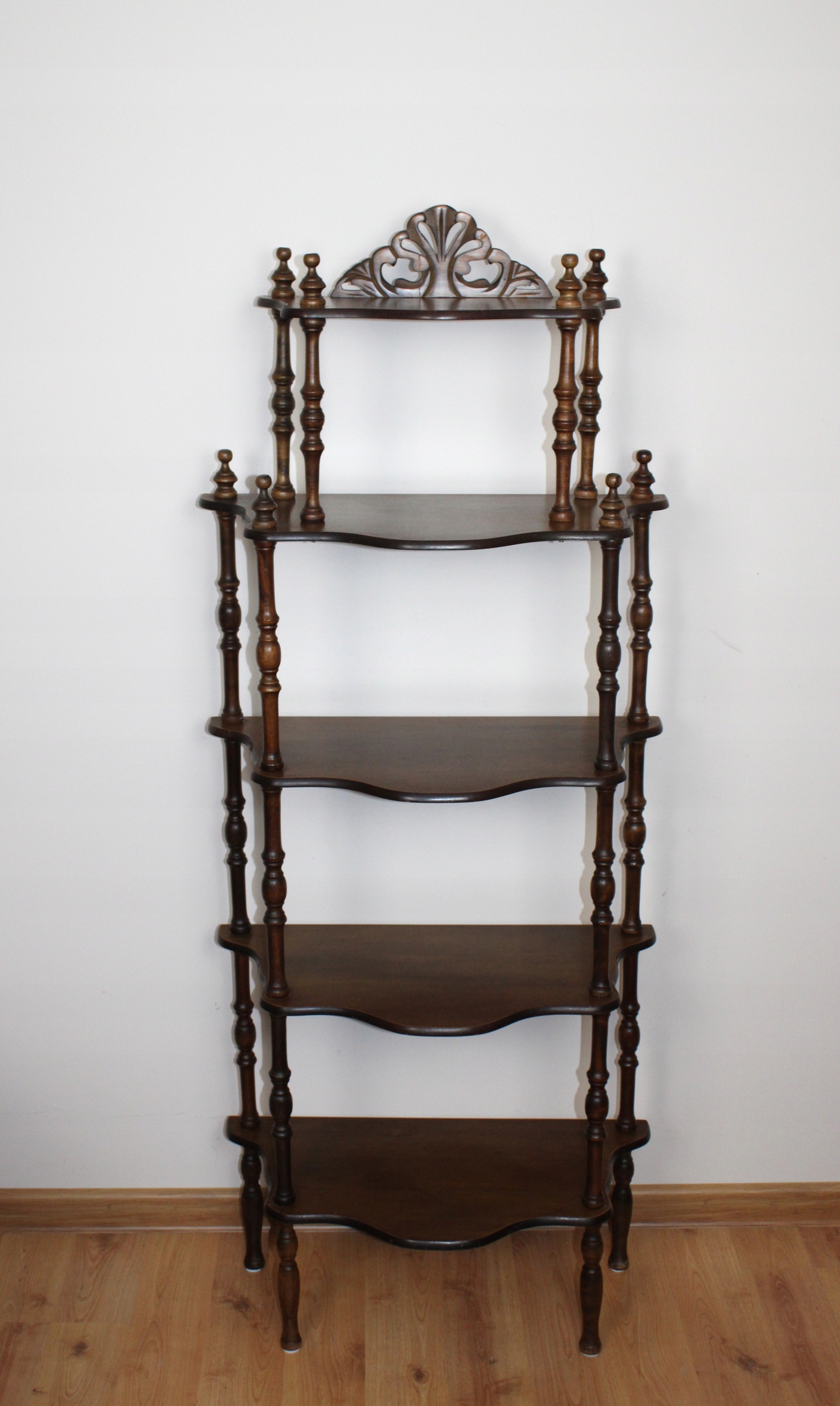 Etażerka wolnostojąca, dekoracyjna, z otwartymi 5 półkami w stylu wiktoriańskim.