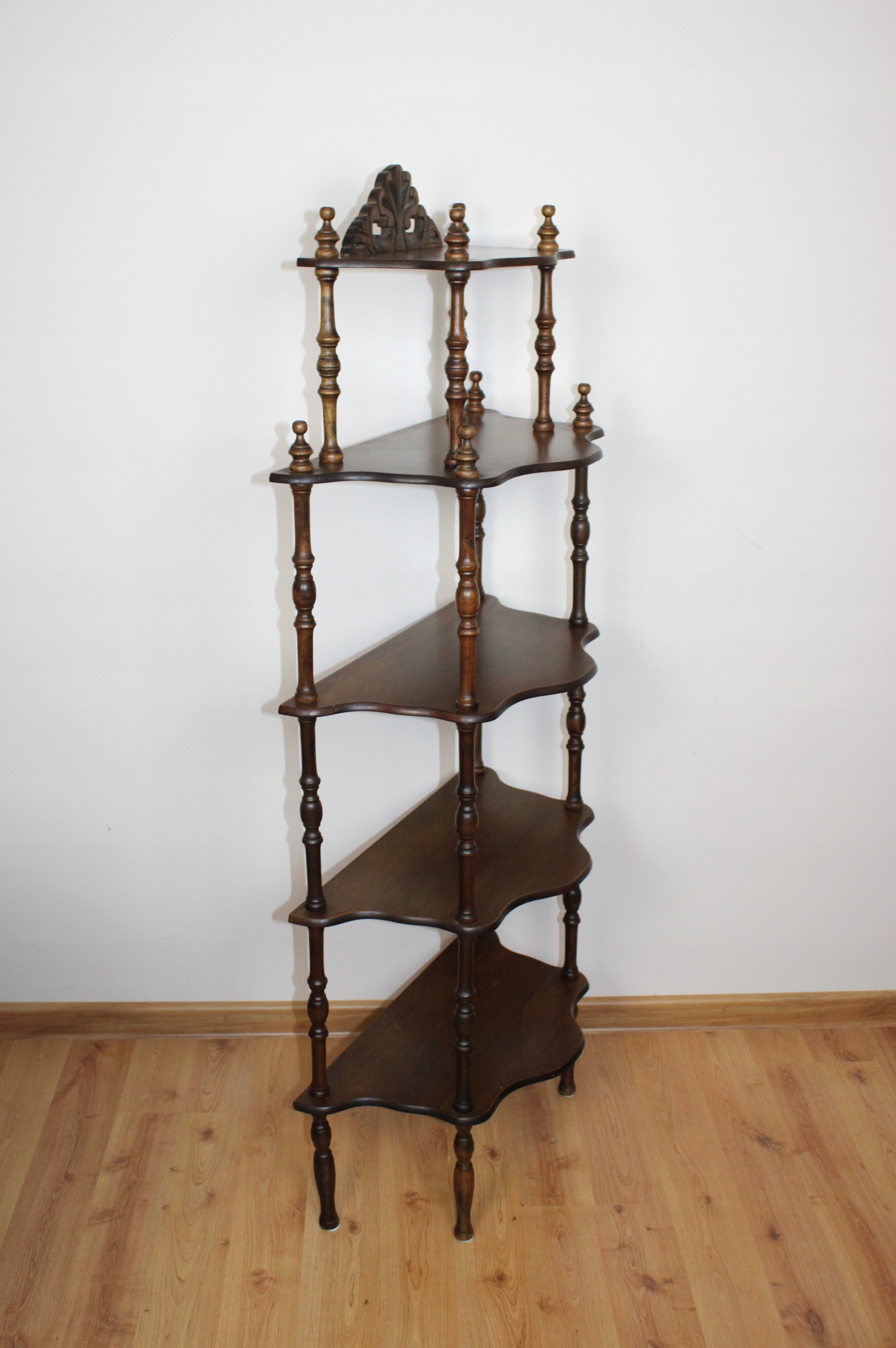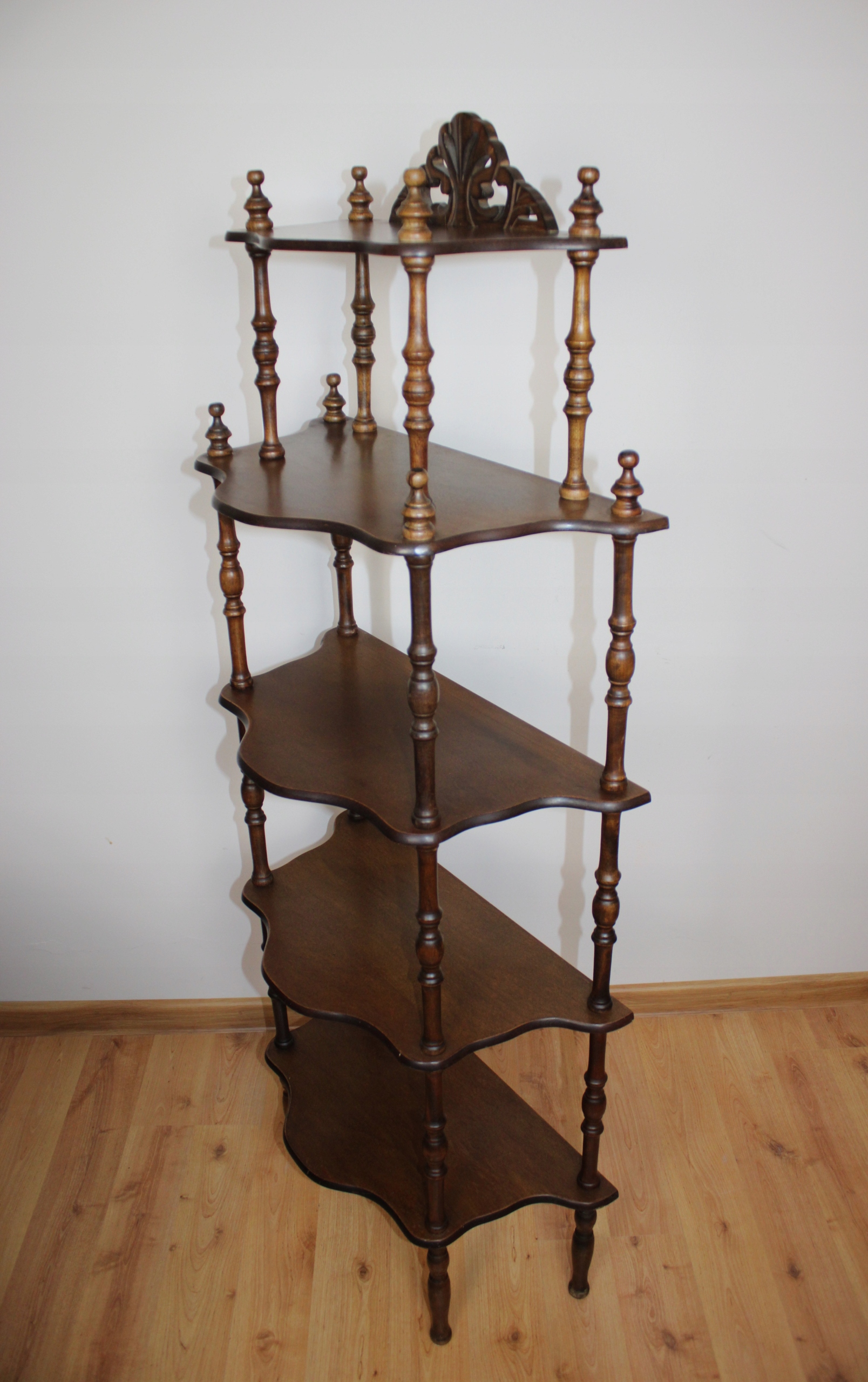 Półki o falistych krawędziach. Dekoracyjne, toczone kolumny i nóżki.