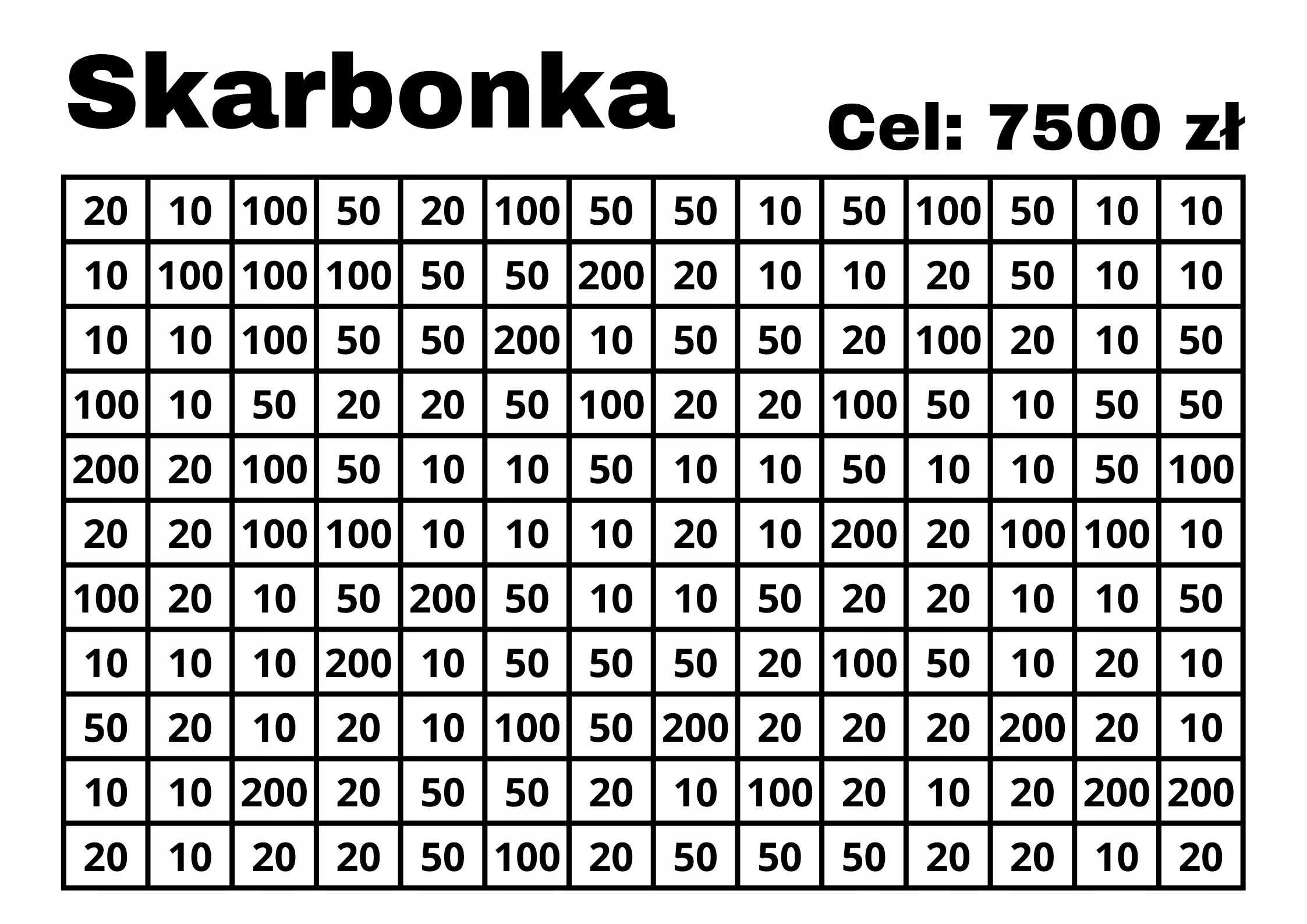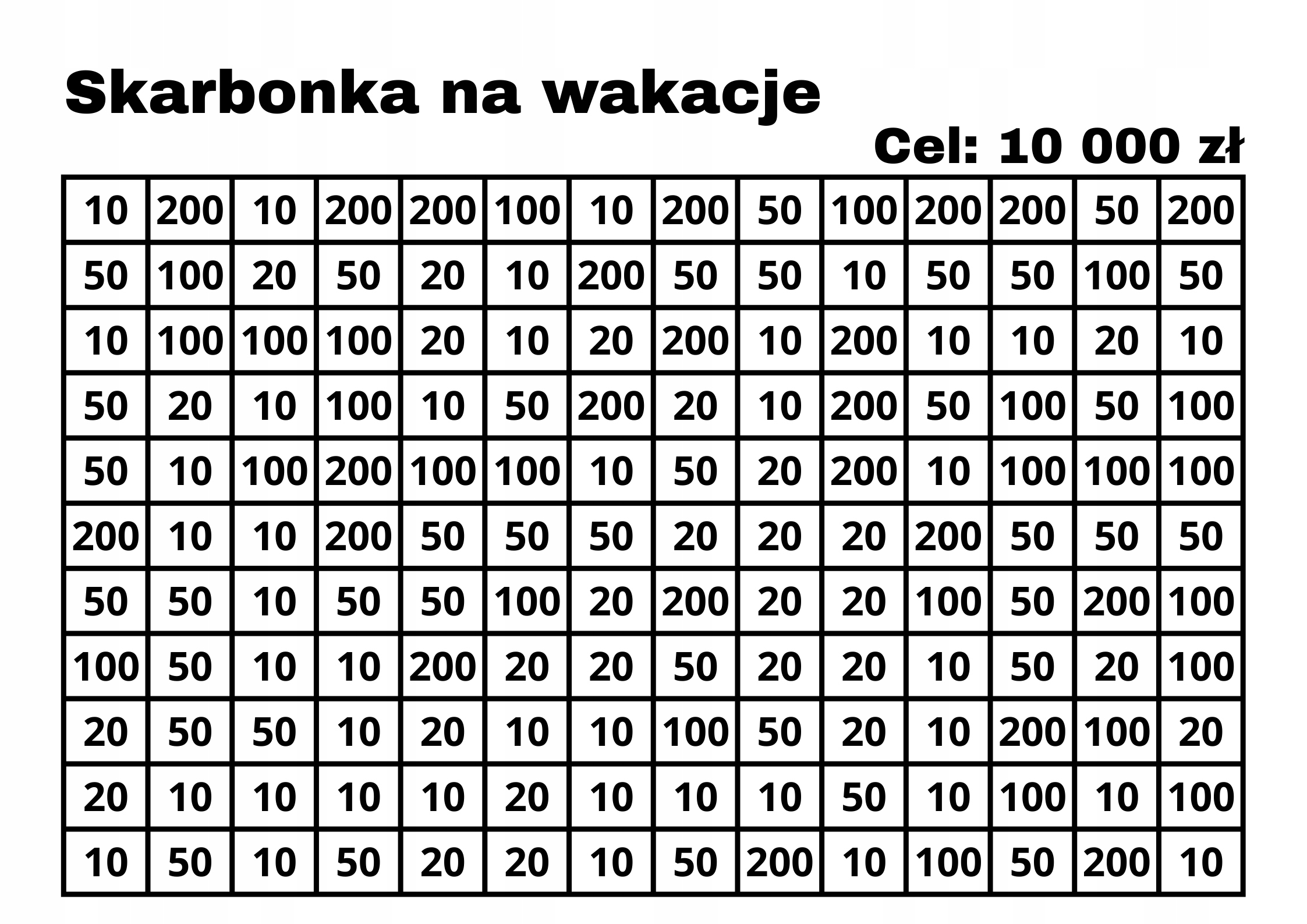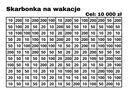 To proste i satysfakcjonujące! Na froncie skarbonki znajduje się tabela z różnymi kwotami (np. 5, 10, 20, 50 zł).