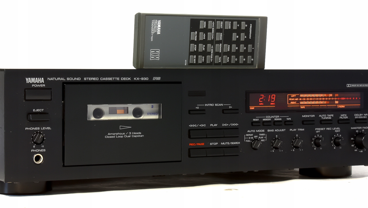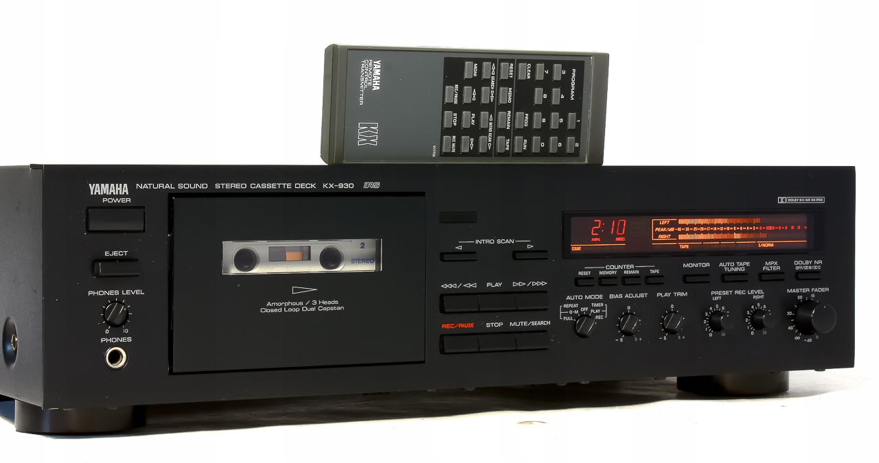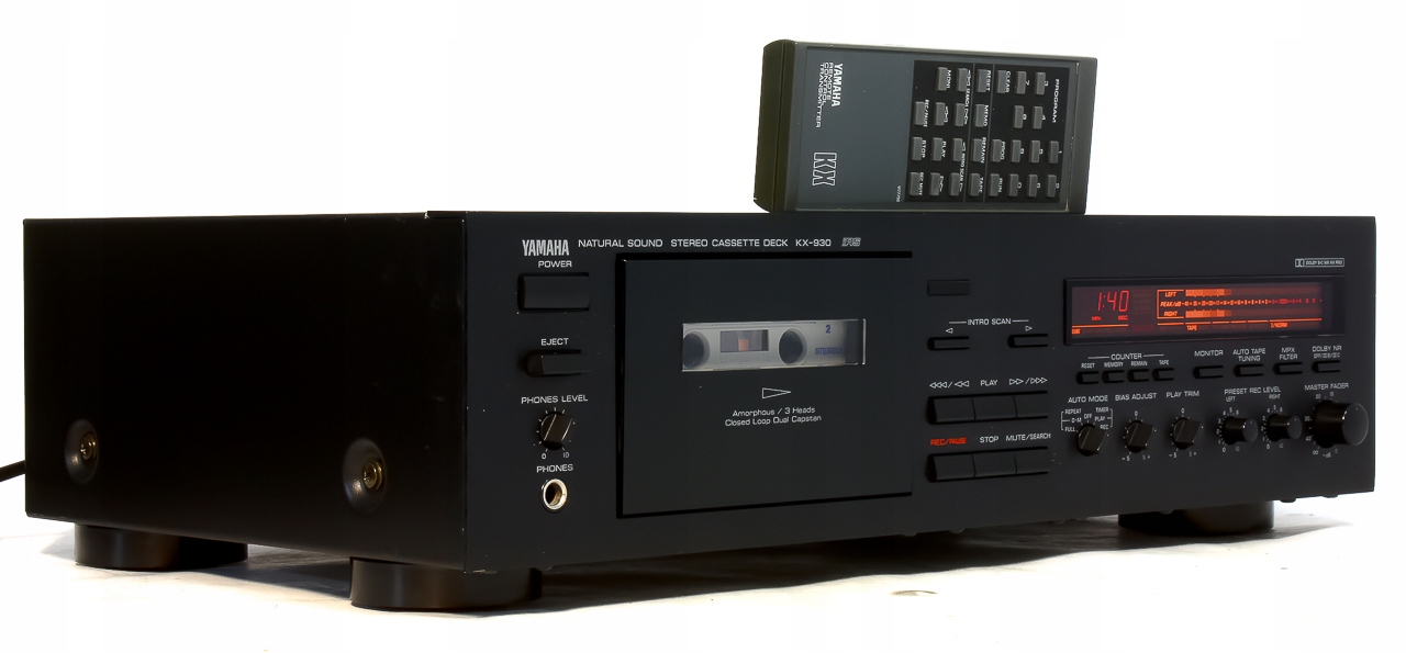 Unikatowy i niezwykle rzadko spotykany na rynku wtórnym, stereofoniczny magnetofon kasetowy klasy top hi fi rewelacyjnej japońskiej firmy Yamaha model KX-930 RS. Jest to najwyższy model z katalogu, produkowany w latach 1990 - 1993. Bardzo udana i trwała konstrukcja, rewelacyjna jakość dźwięku, unikatowe rozwiązania techniczne. Magnetofon wyposażony w dwa wałki przesuwu taśmy zapewniające idealny naciąg i przyleganie taśmy do głowic, trzy głowice w tym dwie amorficzne i jedna kasująca ferrytowa, trzy silniki napędowe, system redukcji szumów Dolby B/C oraz układ HX-PRO, system wyszukiwania utworów, system skanowania kasety polegający na odtwarzaniu 15 sekundowym wszystkich utworów na danej stronie kasety, system programowania utworów polegający na programowaniu kolejności odtwarzanych utworów z danej strony kasety. Ponadto na wyposażeniu znajduję się licznik czasu rzeczywistego przesuwu taśmy z funkcją pamięci oraz funkcją odliczania czasu do końca kasety. Ciekawostką jest to, że wskazania licznika nie kasują się nawet po wyłączeniu magnetofonu. Kolejną ciekawostką techniczną jest wyświetlacz wykonany w technologii LCD tak więc nie jest to lampa fluorescencyjna i nie ma obawy, że coś z biegiem lat się wypali jak w większości rozwiązań innych firm. O filtrze MPX, regulowanym Biasie i sterowaniu timerem nie będę pisał bo jest to standard w tego typu konstrukcjach. Głowice oraz cały tor przesuwu taśmy znajduje się w ustawieniach fabrycznych. Zapraszam do zakupu!