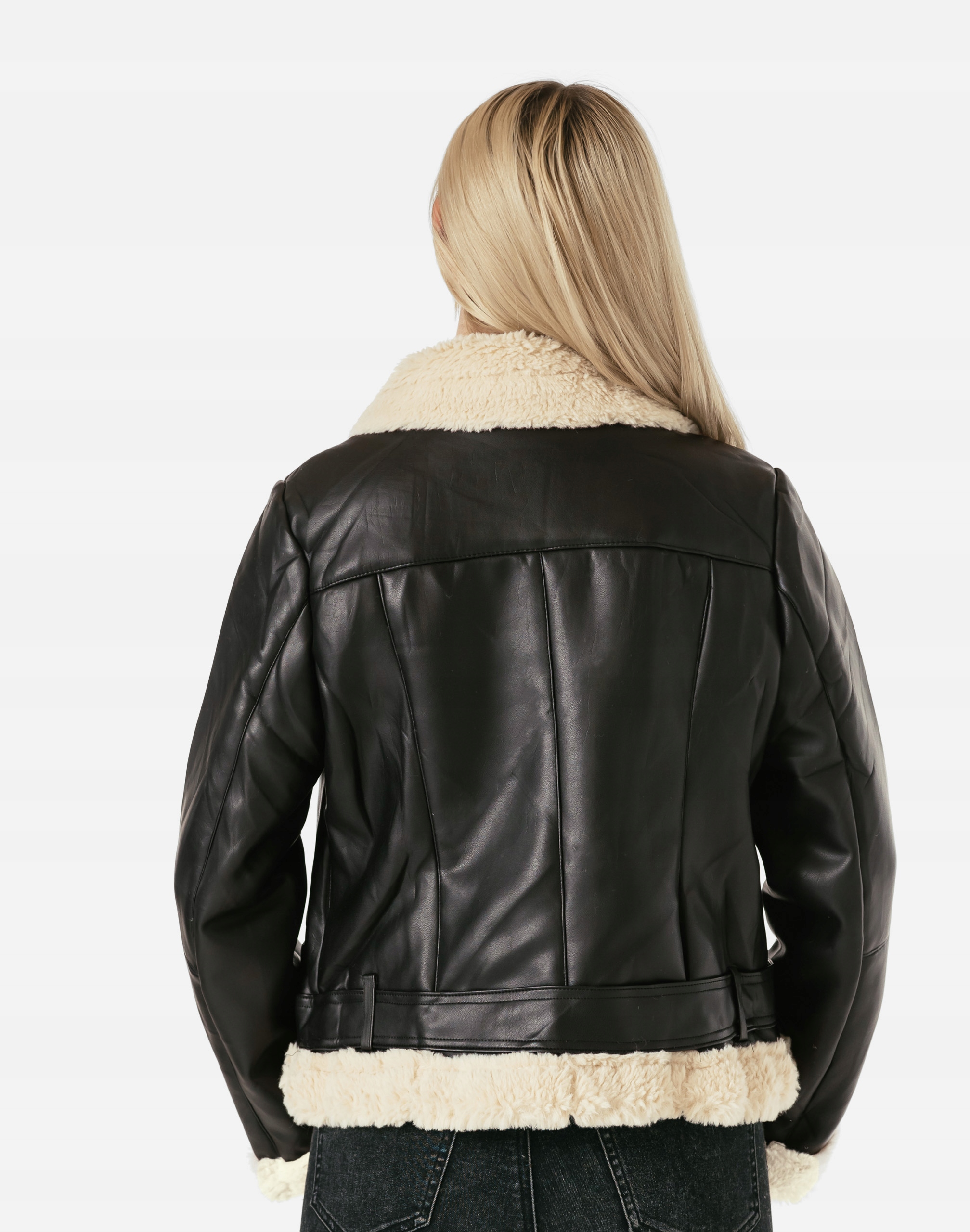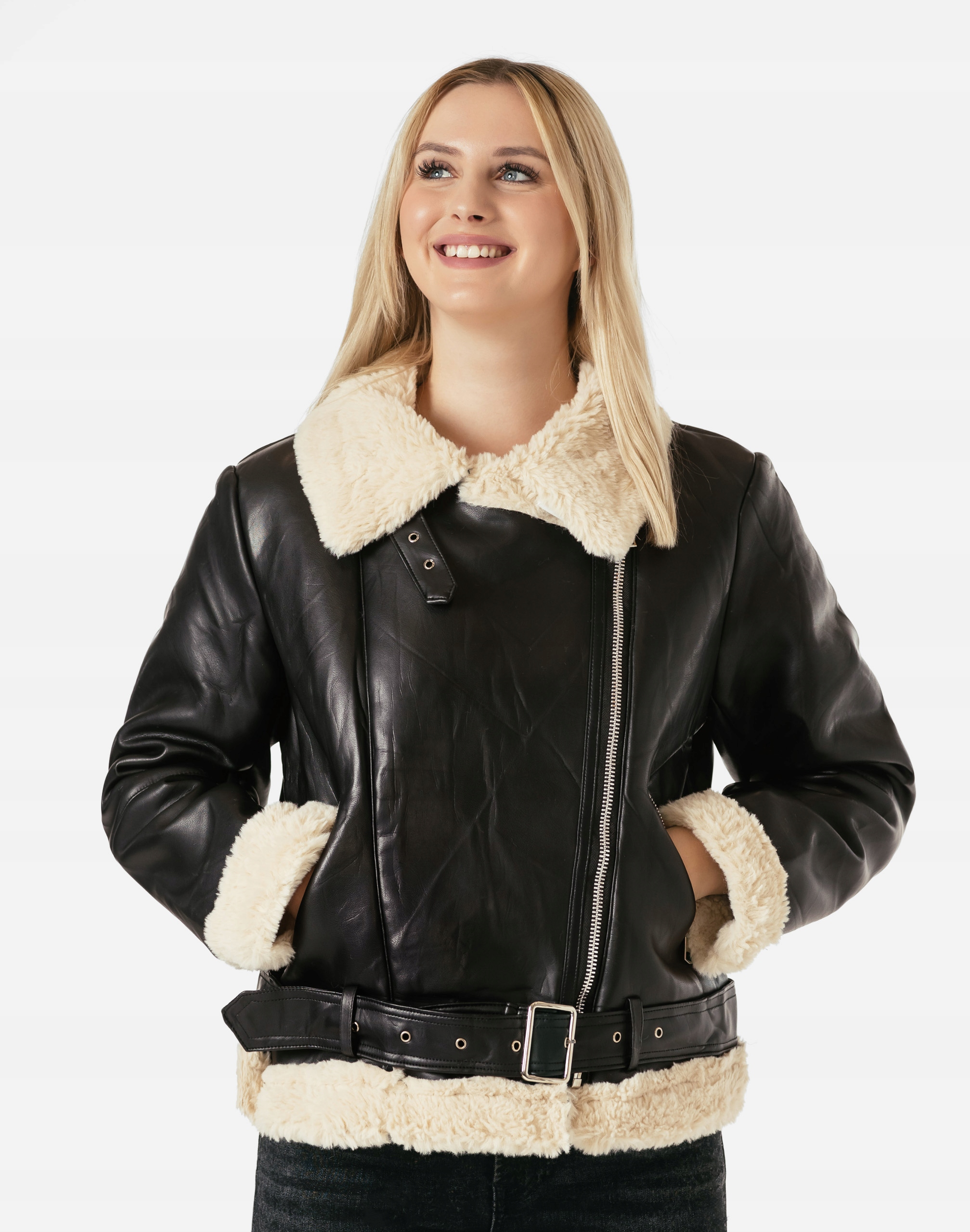 Atrakcyjna i wyjątkowo ciepła, bo ocieplona w całości futerkiem kurtka-kożuszek damski w modnej krótkiej formie to doskonałe i ponadczasowe okrycie wierzchnie na sezon przejściowy i zimowy. Elegancka, przekonująca efektownym fasonem i dużym wykładanym kołnierzem z ozdobnego futerka, delikatnie taliowana i zapina w całości na asymetryczny zamek błyskawiczny. Na bokach posiada dwie duże wpuszczane kieszenie na dłonie zasuwane na zamki błyskawiczne. Długie rękawy zakończone są ozdobnymi lamówkami z futerka. Szeroki wykładany kołnierz można również "postawić" jak stójkę zapinaną na ozdobny pasek z klamrą co skutecznie chroni wtedy podbródek i szyję, a często zastępuje nawet szalik co jest bardzo wygodne. Szeroki modny i stylowy pasek u dołu kurtki pozwala na precyzyjne dopasowanie do ciała, zapobiega utracie ciepła i skutecznie chroni przed podmuchami wiatru. Materiał zewnętrzny (ekoskóra do złudzenia przypominająca naturalną skórę) jest wiatroszczelny i posiada wykończenie typu Water Repellency, które zapobiega nasączeniu warstwy zewnętrznej wodą. Wewnętrzna strona kurtki w całości wykończona jest miłym dla ciała, ciepłym futerkiem które zapewnia doskonałą termoizolację oraz wysoki komfort użytkowania. Długość do bioder, która trzyma ciepło i przytulność przy zmiennej pogodzie. Nie krępuje ruchów i z powodzeniem zakrywa części ciała wrażliwe na chłód jak plecy na wysokości nerek. Fason zgrabnie taliowany doskonale wyprofilowana konstrukcja efektownie podkreślająca kobiecą sylwetkę. To prawdziwy evergreen dla udanych zimowych stylizacji.