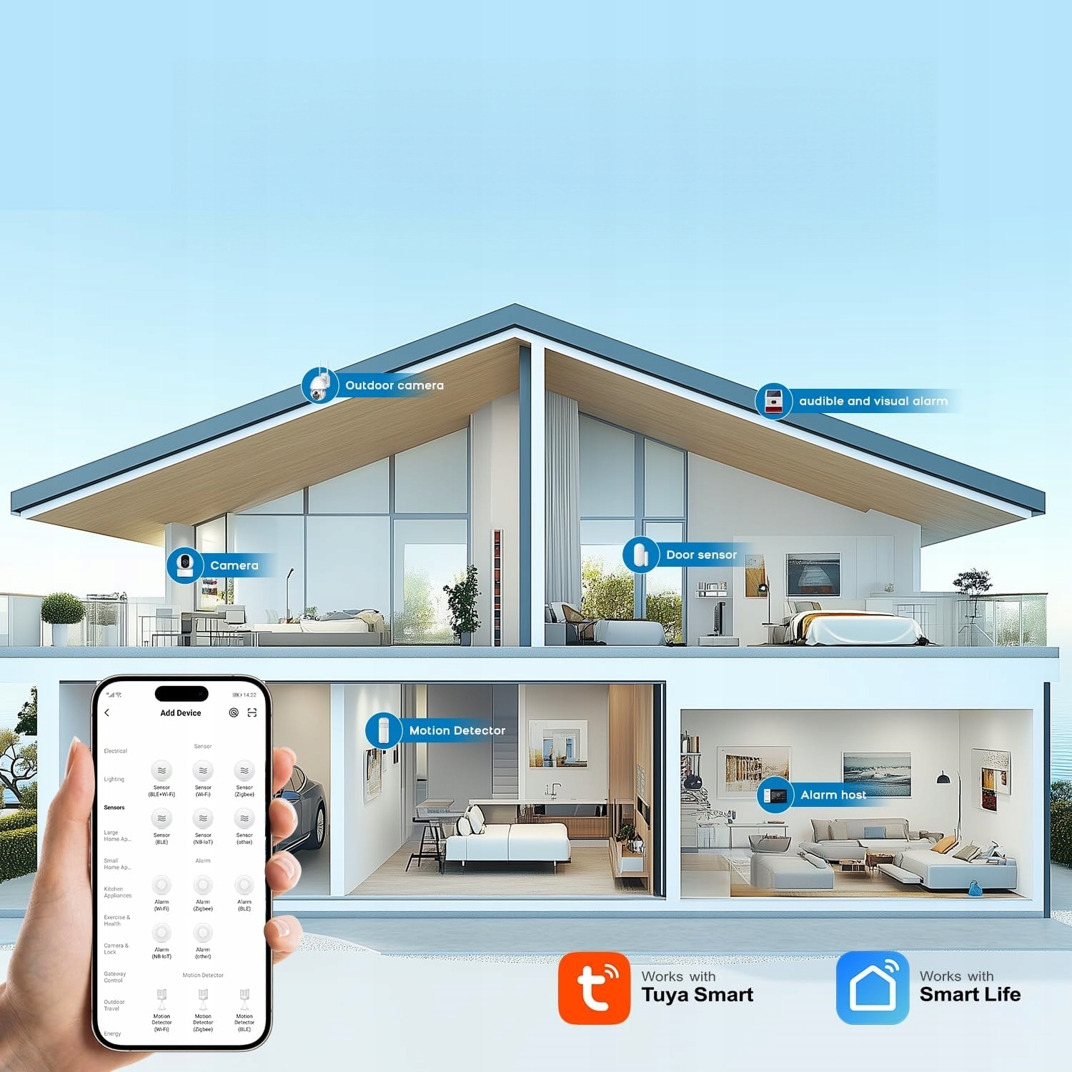 Integracja Smart App: Użyj darmowej aplikacji "Smart Life", aby zdalnie sterować systemem. Otrzymuj natychmiastowe powiadomienia push ze szczegółowymi informacjami (np. „Otwarte drzwi wejściowe”), przeglądaj materiał na żywo z połączonych kamer HD i zarządzaj wszystkimi podłączonymi czujnikami ze smartfona.