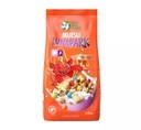 One Day More musli Lunapark 600 g Musli z chrupiącą granolą owsianą i granolą z czekoladą mleczną oraz kolorowymi drażami, zbożowymi serduszkami i liofilizowanymi borówkami. Kolorowe, pyszne i odżywcze musli dla Twojego dziecka To musli nie dość, że dostarcza niezbędnych składników mineralnych, to jeszcze świetnie smakuje i zachwyca wyglądem! Pyszne liofilizowane borówki połączyliśmy ze zbożowymi serduszkami i kolorowymi drażami – takiemu śniadaniu nikt się nie oprze! Składniki: granola owsiana 56% (płatki owsiane, syrop daktylowy [daktyle], błonnik z korzenia cykorii, nasiona słonecznika, mąka ryżowa), granola z czekoladą mleczną 27% (płatki owsiane, miód, czekolada mleczna [cukier, mleko w proszku pełne, tłuszcz kakaowy1, miazga kakaowa1, emulgator: lecytyny], błonnik z korzenia cykorii, mąka ryżowa, ekstrudowane chrupki ryżowe [mąka ryżowa], ekstrakt słodu jęczmiennego), draże 9% (cukier, miazga kakaowa1, tłuszcz kakaowy1, mleko w proszku pełne, skrobia ryżowa, emulgator: lecytyny, substancje glazurujące: guma arabska, wosk carnauba, wosk pszczeli, koncentraty z soków: winogron, rzodkiewki, czarnej porzeczki, cytryny, buraka czerwonego, ekstrakty: z krokosza barwierskiego, ze słodu jęczmiennego, koncentrat z alg), ekstrudowane chrupki zbożowe 7% (mąka pszenna orkiszowa, kaszka kukurydziana, cukier trzcinowy, mąka słodowa jęczmienna, sól morska), liofilizowane borówki 1%.