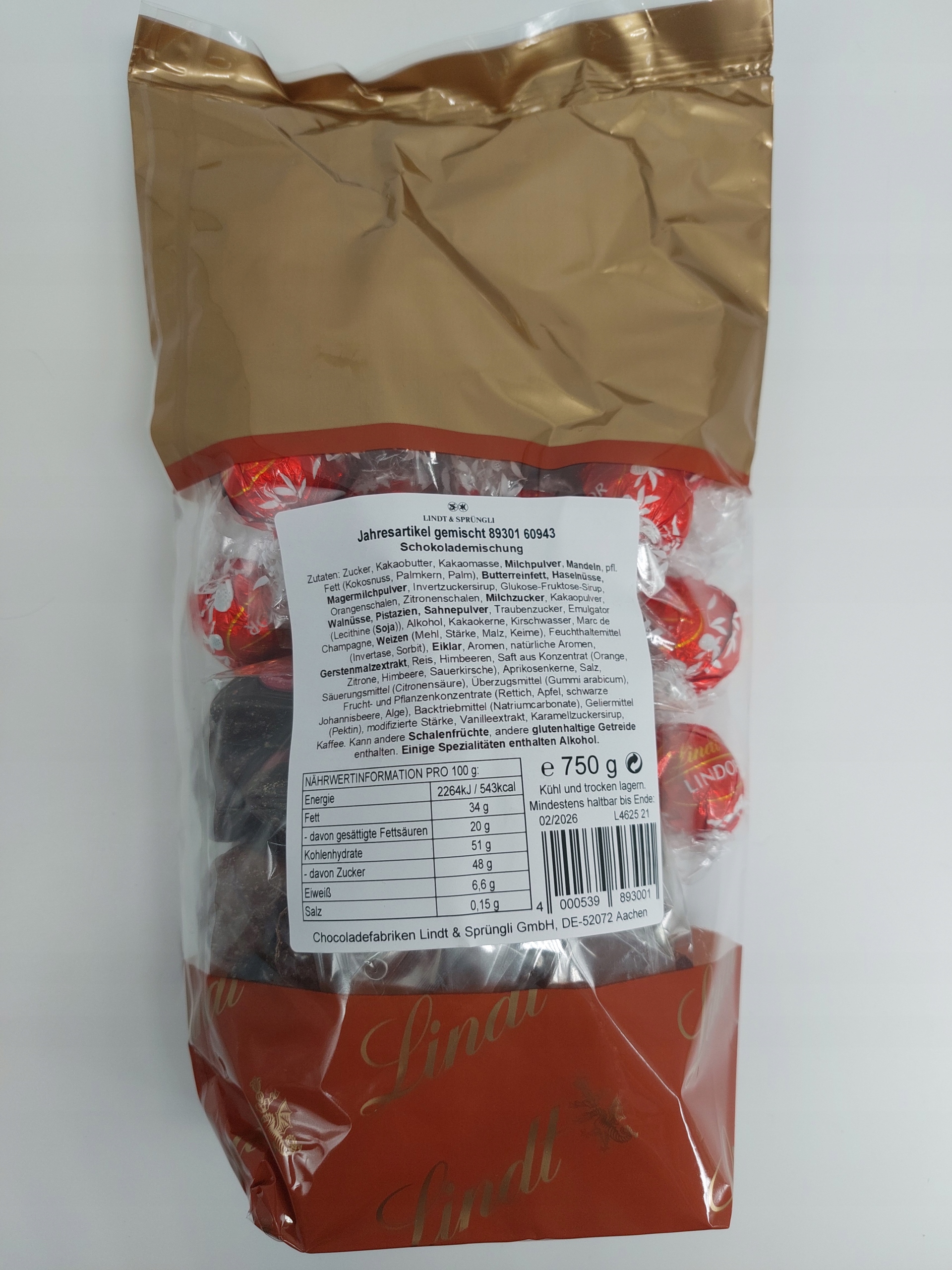 Paczka 750g zawiera praliny z mlecznej czekolady oraz czekoladki z czekolady mlecznej, czekoladki z nadzieniem malinowym oraz czekoladki z chrupiącymi kuleczkami na wierzchu.