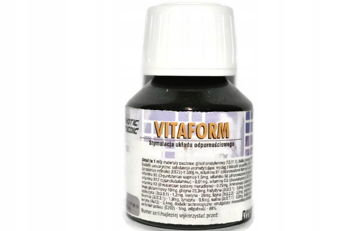 VITAFORM – jest to bardzo bogaty w witaminy i aminokwasy preparat specjalnie stworzony dla kanarków i papug. Zawiera on zarówno witaminy rozpuszczalne w wodzie i tłuszczach jak i cały szereg aminokwasów egzo i endogennych. Już kilkudniowa kuracja tym preparatem poprawia kondycje i wigor u ptaków , korzystnie wpływając na egzystencję i żywotność kanarków i papug.
