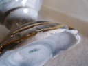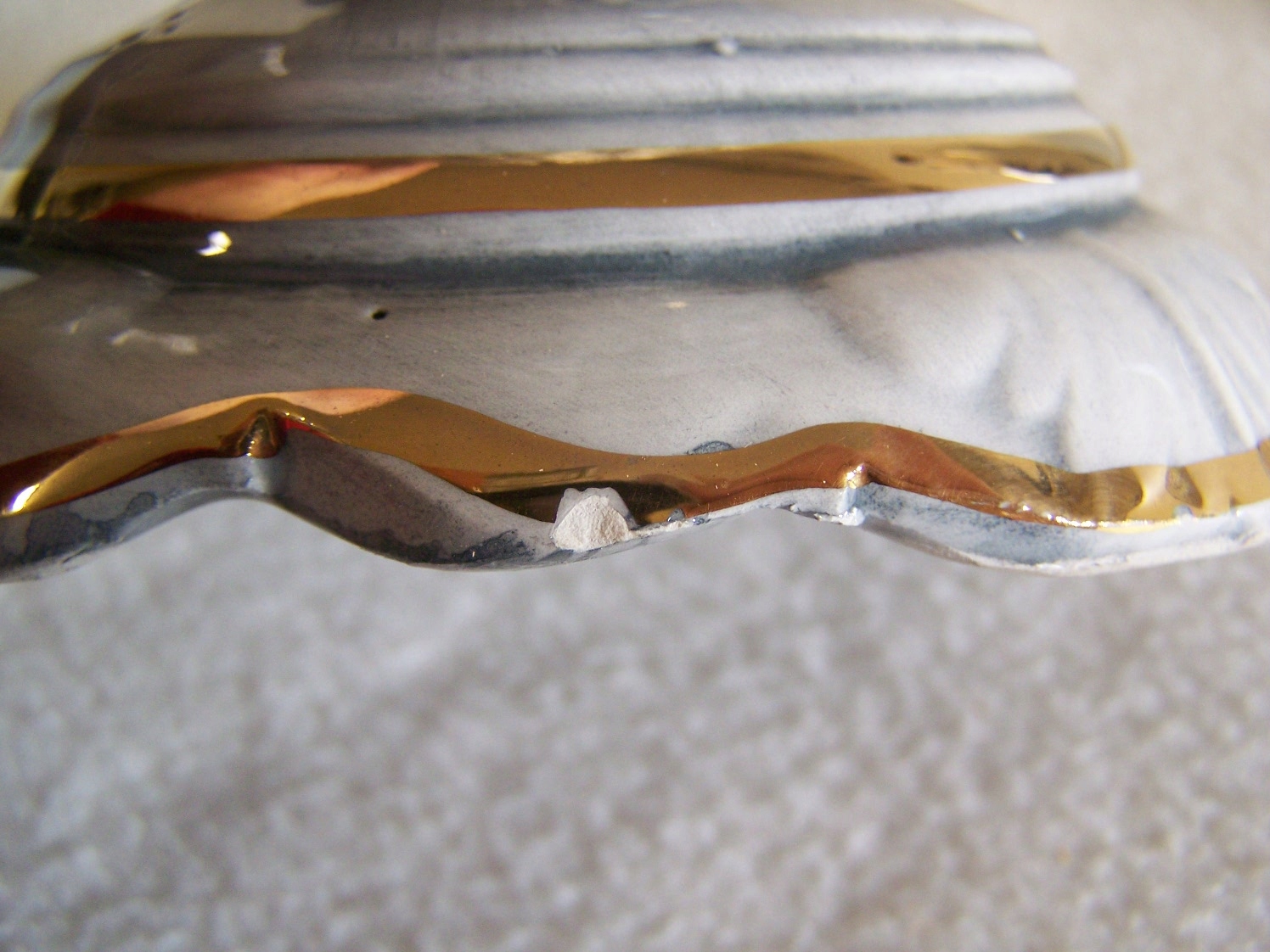 Na górnej krawędzi wewnątrz ubytek, na stopce przy krawędzi ubytek od spodu i mały na krawędzi i -proszę spojrzeć na zdjęcia - z perspektywy nie widoczne.