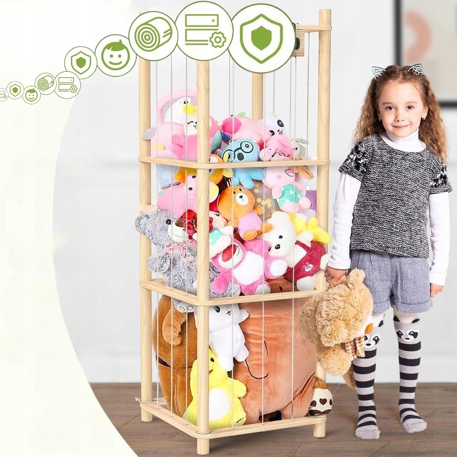 1️⃣ Siatki i hamaki – łatwo wypadają z nich zabawki, co może prowadzić do bałaganu lub uszkodzenia maskotek. Dziecko ma też trudność z samodzielnym sięganiem po ulubioną przytulankę.