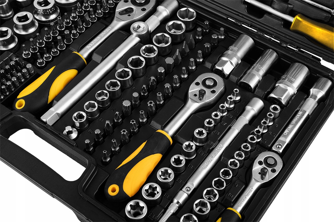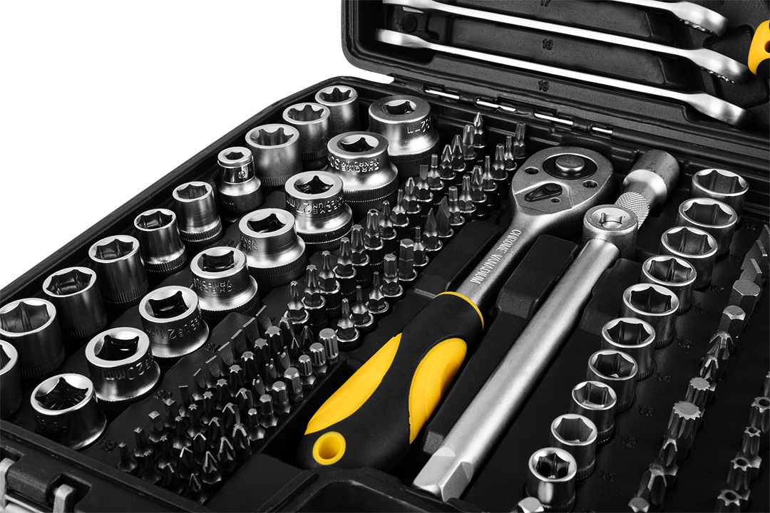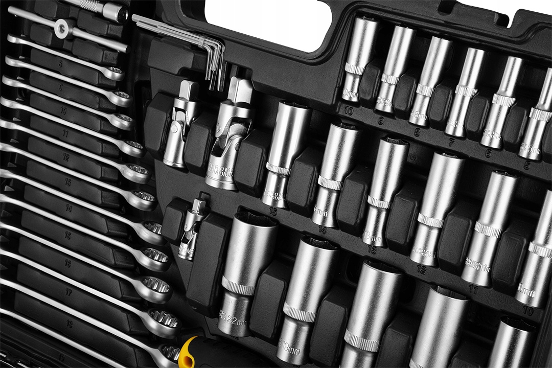 Изготовлен из прочной хром-ванадиевой стали (CrV) инструменты имеют высокую стойкость к истиранию и коррозии. Эргономичный ручки в трещотках гарантируют комфорт использования даже в течение длительного времени работы.