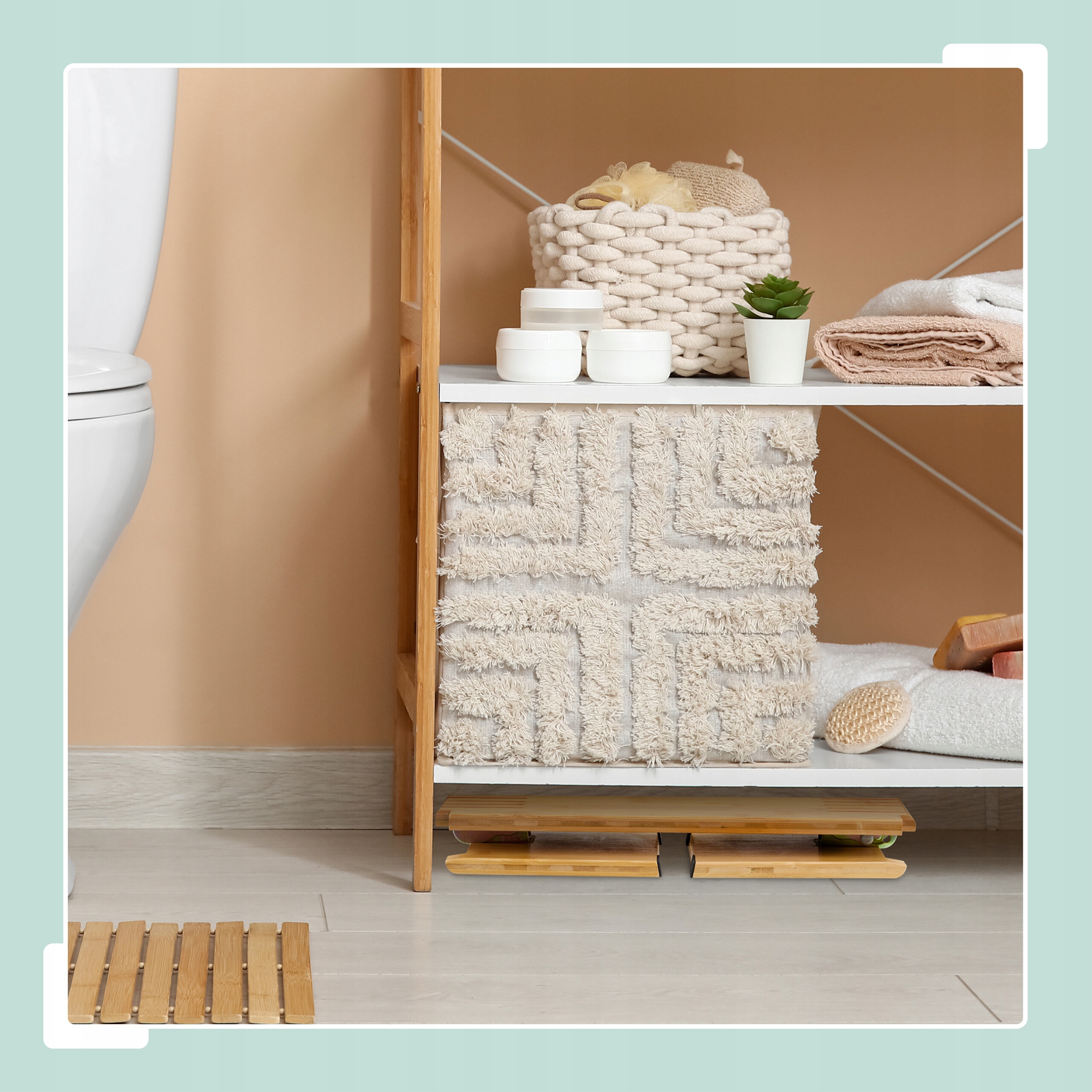 Stołek toaletowy to praktyczna pomoc wspierająca zdrowe wypróżnianie. Podnóżek zapewnia naturalną pozycję kucającą na toalecie, co zapobiega zaginaniu się odbytnicy i ułatwia wypróżnianie. Może to być pomocne w przypadku dolegliwości jelitowych, takich jak zaparcia, hemoroidy, wzdęcia lub zespół jelita drażliwego. Stołek toaletowy ma gumowe podkładki, które gwarantują bezpieczną podstawę i można go złożyć, aby zaoszczędzić miejsce po skorzystaniu z toalety.Szczegóły stołka toaletowego- Wymiary H x B x T: ok. 19 x 48,5 x 20 cm- Wysokość po złożeniu: ok. 5,5 cm- Udźwig: maks. 60 kg- Waga: ok. 1,7 kg- Materiał: bambus, stal, guma- Kolor: naturalnyPodnóżek wspierający podczas korzystania z toalety- Dla naturalnej pozycji kucającej pod kątem 35° podczas wypróżniania- Może pomóc przy zaparciach, hemoroidach i zespole jelita drażliwego- Stołek łazienkowy z gumowymi podkładkami zapewniającymi stabilność- Można go złożyć i schować, aby zaoszczędzić miejsce, gdy nie jest używany- Wykonany z wytrzymałego bambusa dla naturalnego stylu w łazience- Łatwy w użyciu: po prostu umieść go przed toaletą i postaw na nim stopyZakres dostawy- 1x podnóżek toaletowy- Elementy dekoracyjne nie wchodzą w zakres dostawy