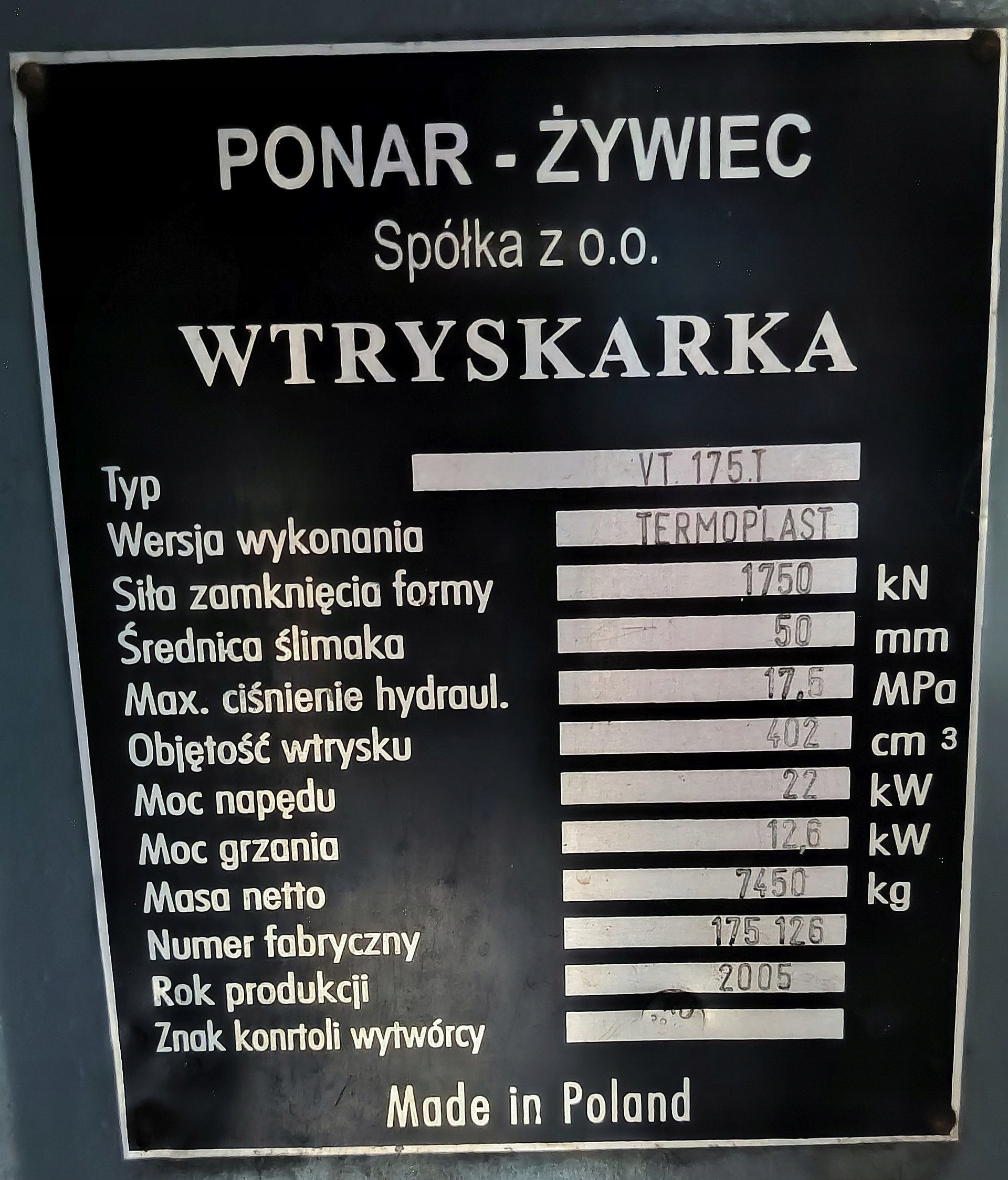 Przedmiotem sprzedaży jest używana wtryskarka pozioma, polskiej produkcji firmy Ponar - Żywiec