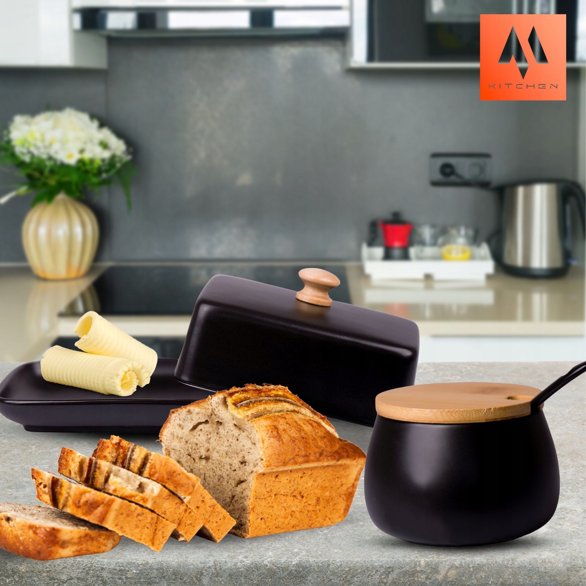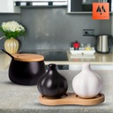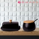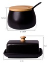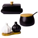 ➡️ Stylowy zestaw OMAGO to połączenie funkcjonalności i estetyki, które wprowadza porządek i klasę do codziennych rytuałów. W komplecie znajdują się trzy dopasowane elementy: maselnica, cukiernica z łyżeczką oraz przyprawniki, wykonane z ceramiki i porcelany w klasycznej czerni, uzupełnione naturalnymi bambusowymi pokrywkami.