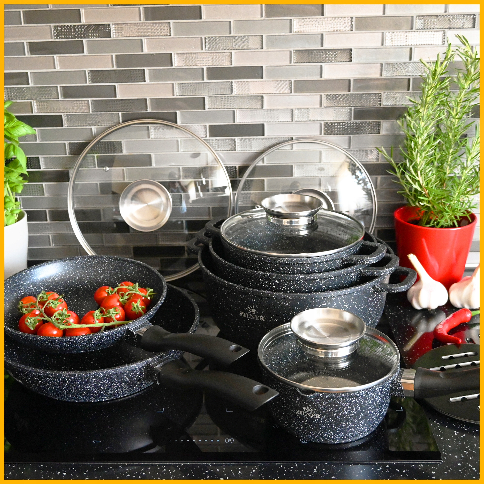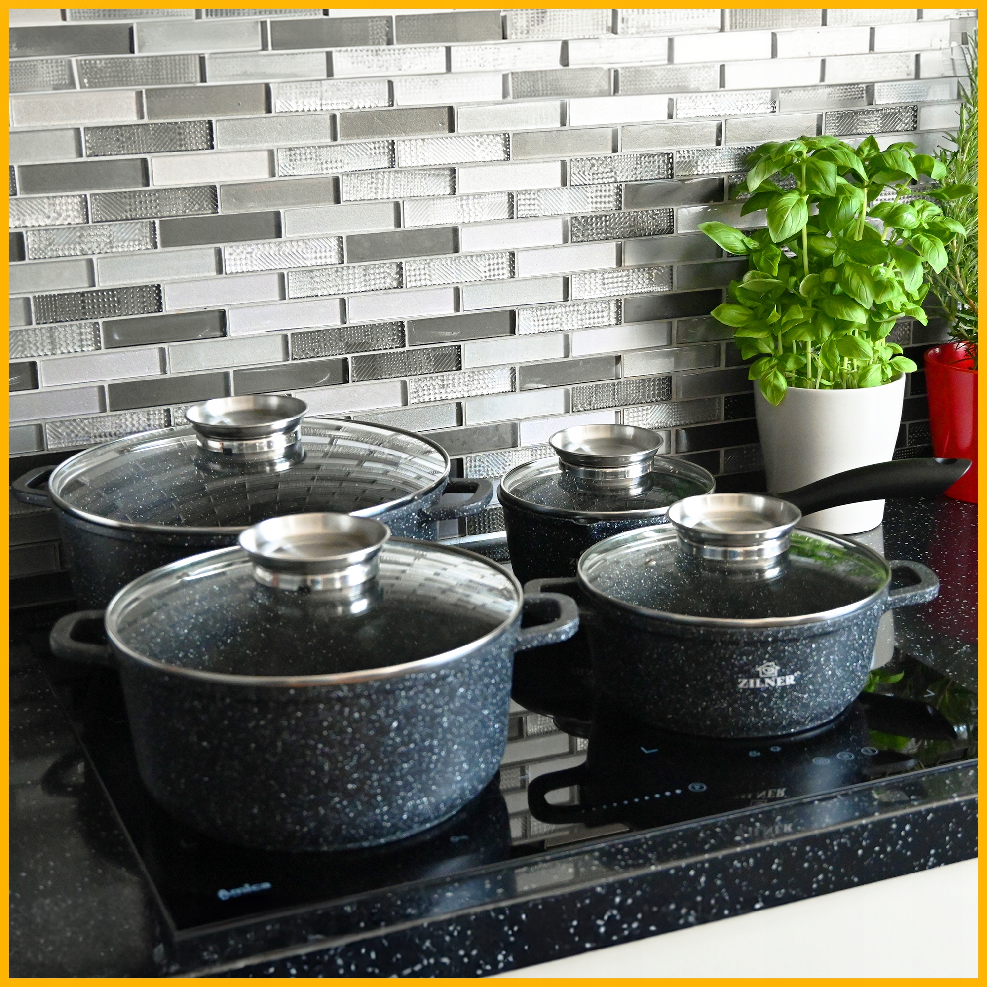 Набор кастрюль Zilner оснащен крышками из закаленного стекла, которые позволяют постоянно контролировать блюда, не поднимая крышек. Благодаря практичному отверстию для пара приготовление пищи становится безопаснее, исключая риск выброса. Это идеальное решение для индукции, газа и все виды плит.