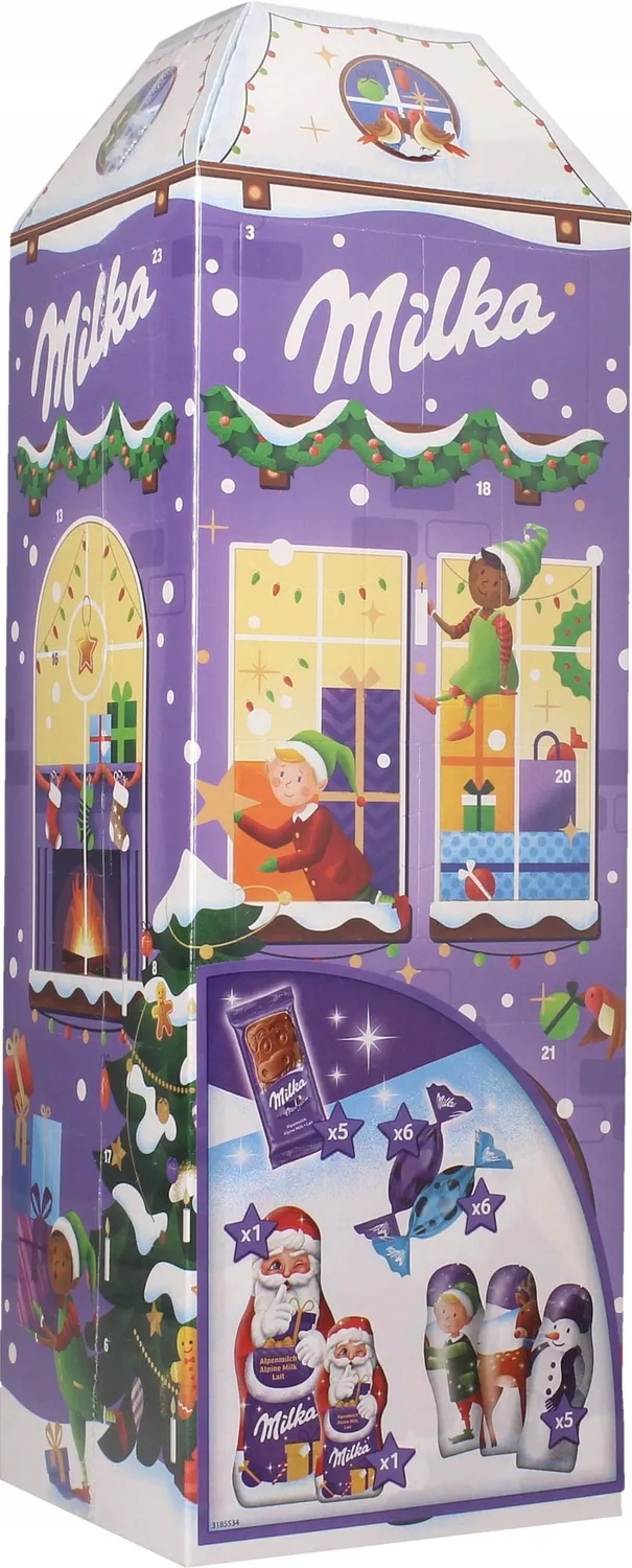 We wszystkich czterech ścianach powinno być szczęście dzięki wspaniałemu kalendarzowi adwentowemu Milka Wieża 3D. Kwadratowy wieżowiec jest nadrukowany motywami świątecznymi. Kilka zwierząt wygląda przez okna, zwiastując nadejście Świąt. Wybór pysznych świątecznych przysmaków Milka czeka za każdymi drzwiczkami do przegryzienia.