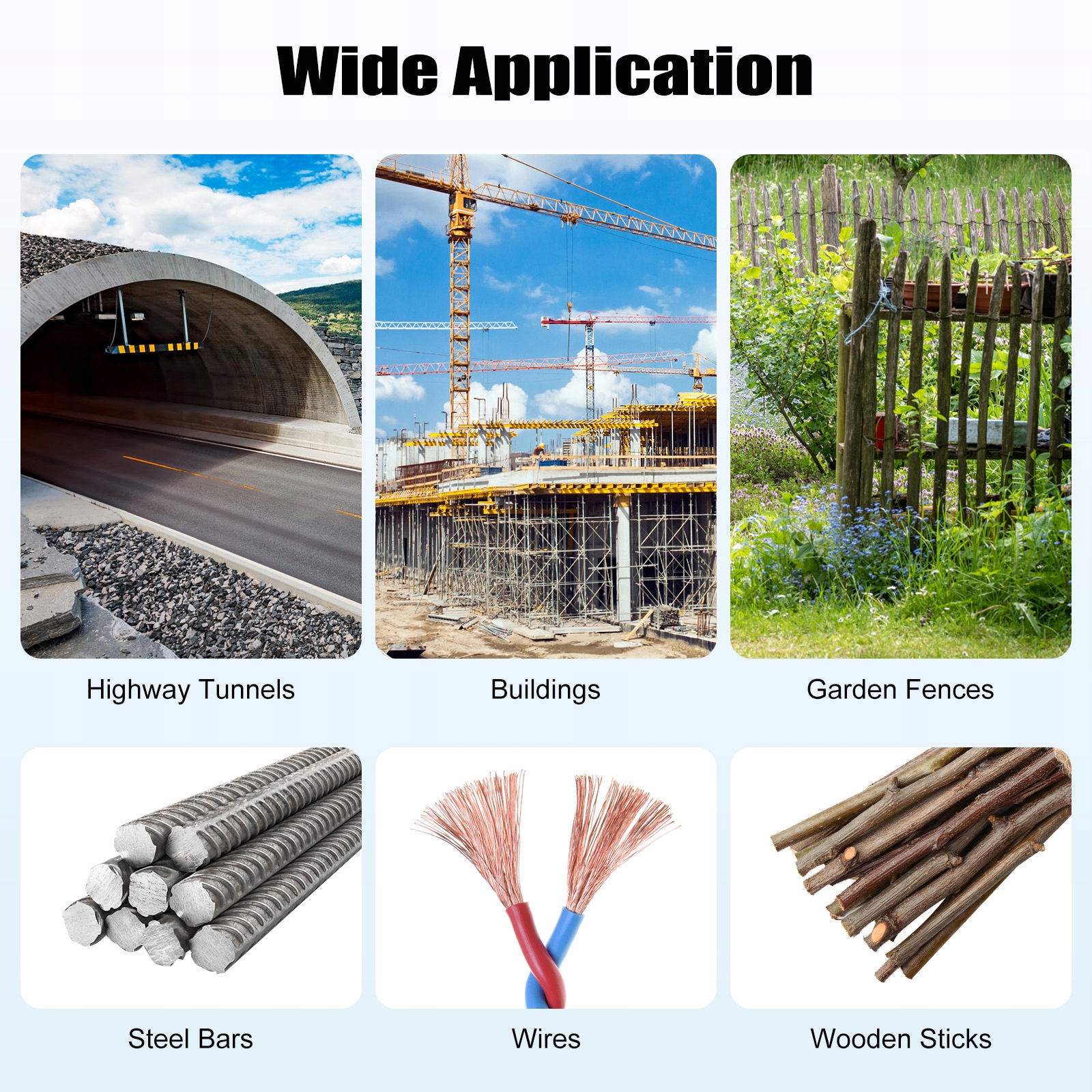 Nadaje się do owijania drutu samoprzylepnego/ocynowanego w celu wiązania prętów stalowych, drutów, patyków drewnianych itp. Nadaje się do stosowania w budynkach, tunelach autostradowych, mostach, ogrodzeniach ogrodowych itp.