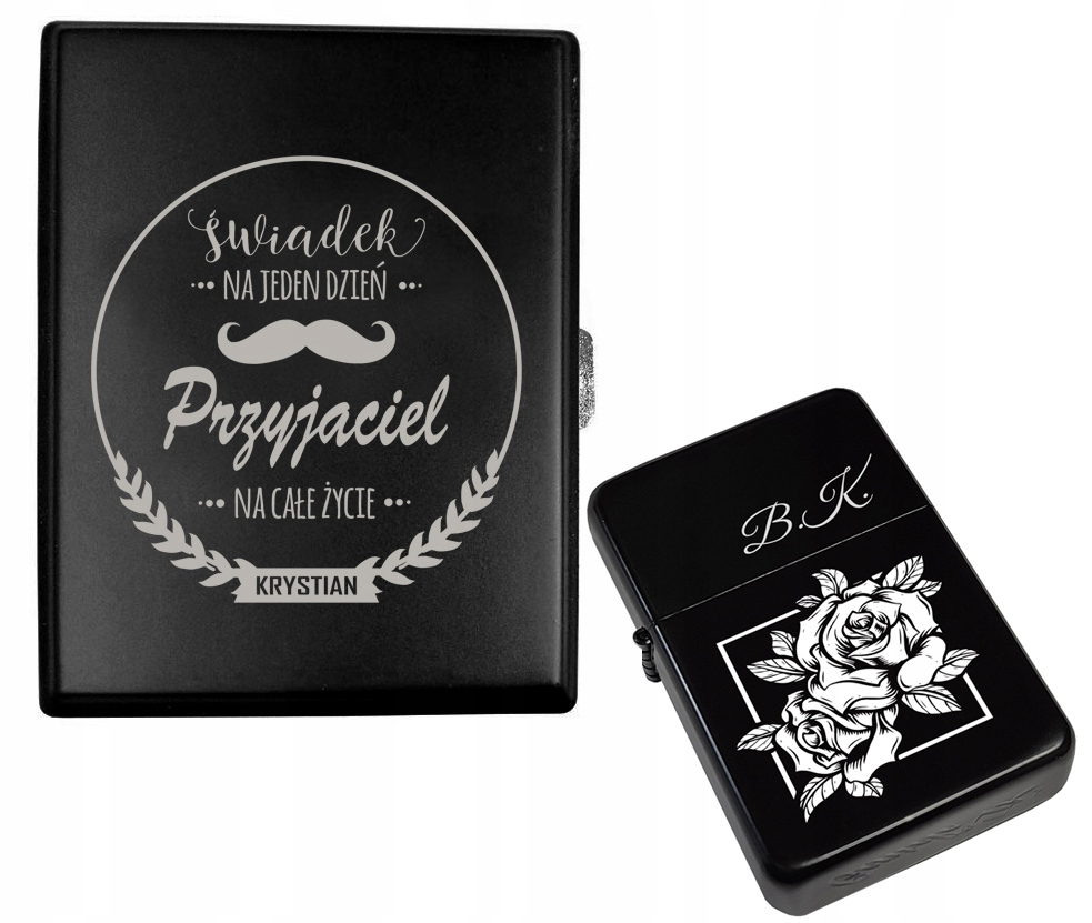 Zapraszamy do zakupu UPOMINKOWEGO ZESTAWU z papierośnicą oraz zapalniczką benzynową spersonalizowanego WŁASNYM dowolnym GRAWERUNKIEM.